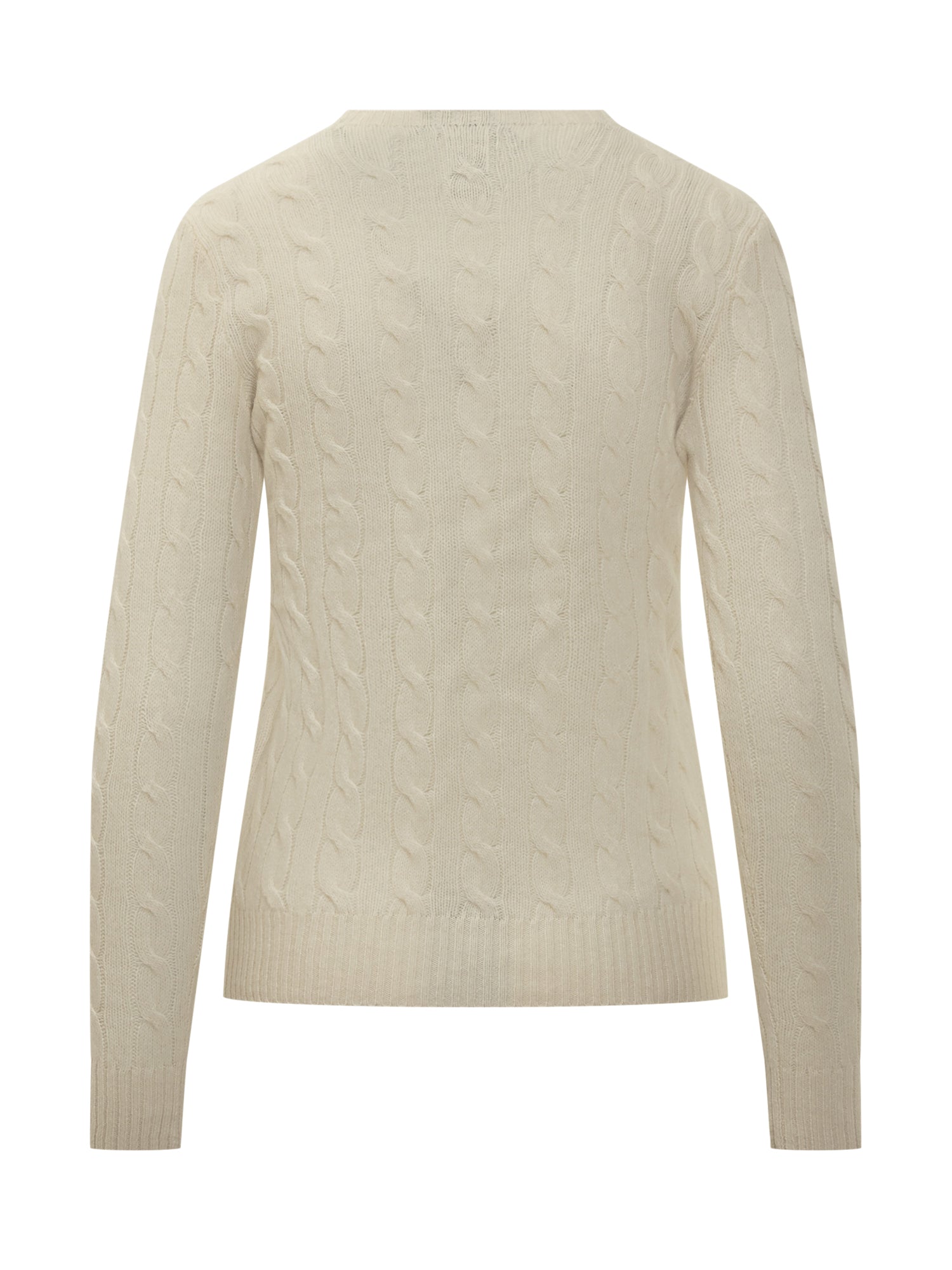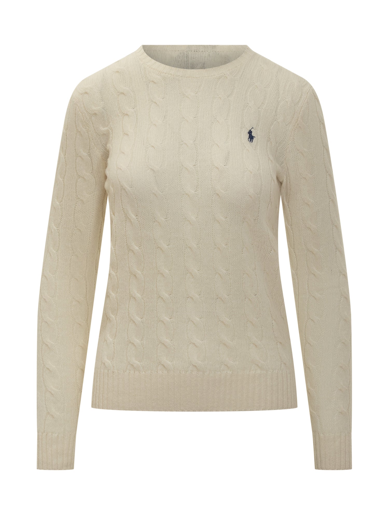 Women's wool cable-knit sweater with crewneck and embroidered logo.