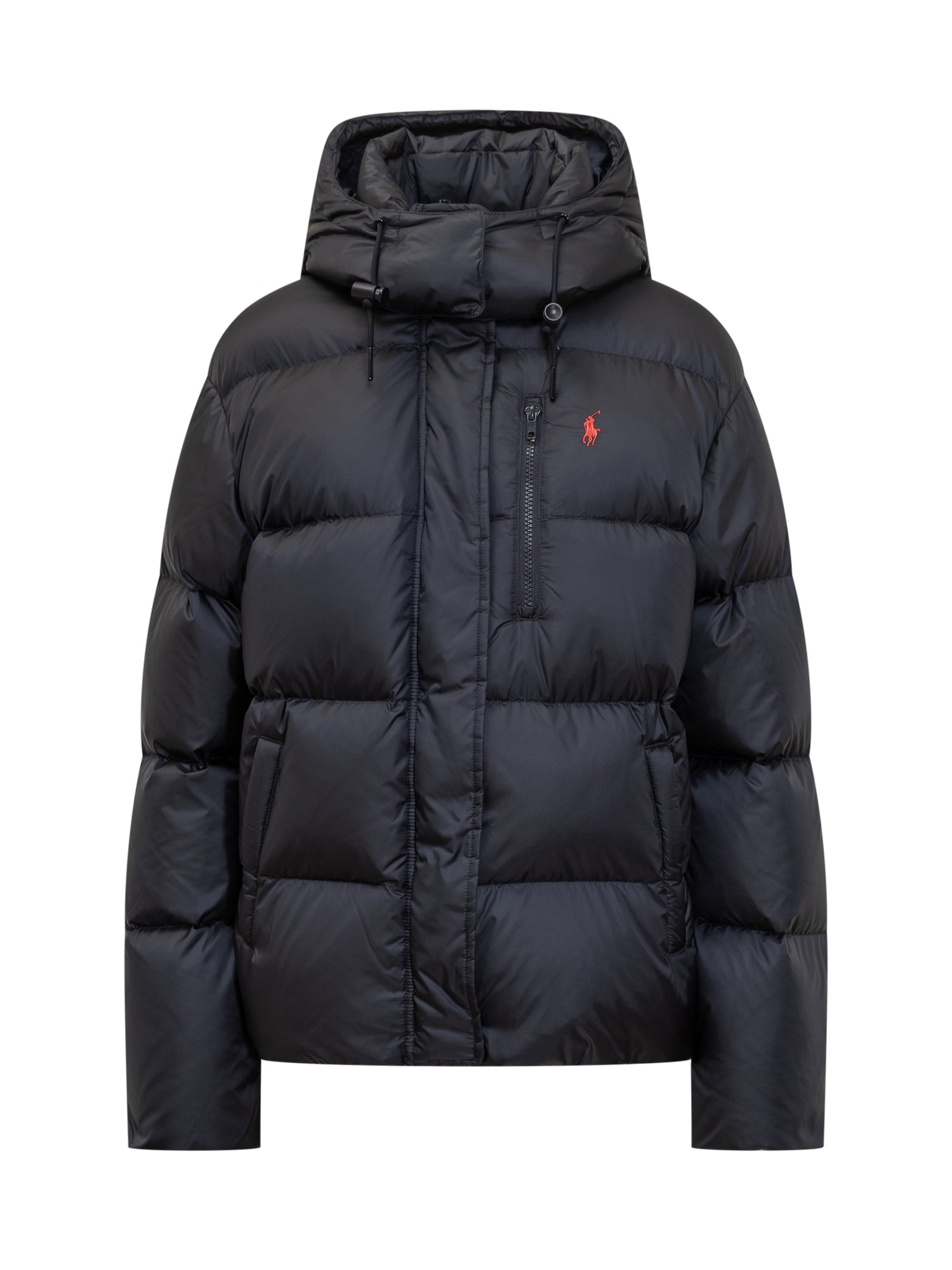 Ralph Lauren padded jacket in glossy black nylon with warm filling, adjustable hood and contrasting embroidered logo.