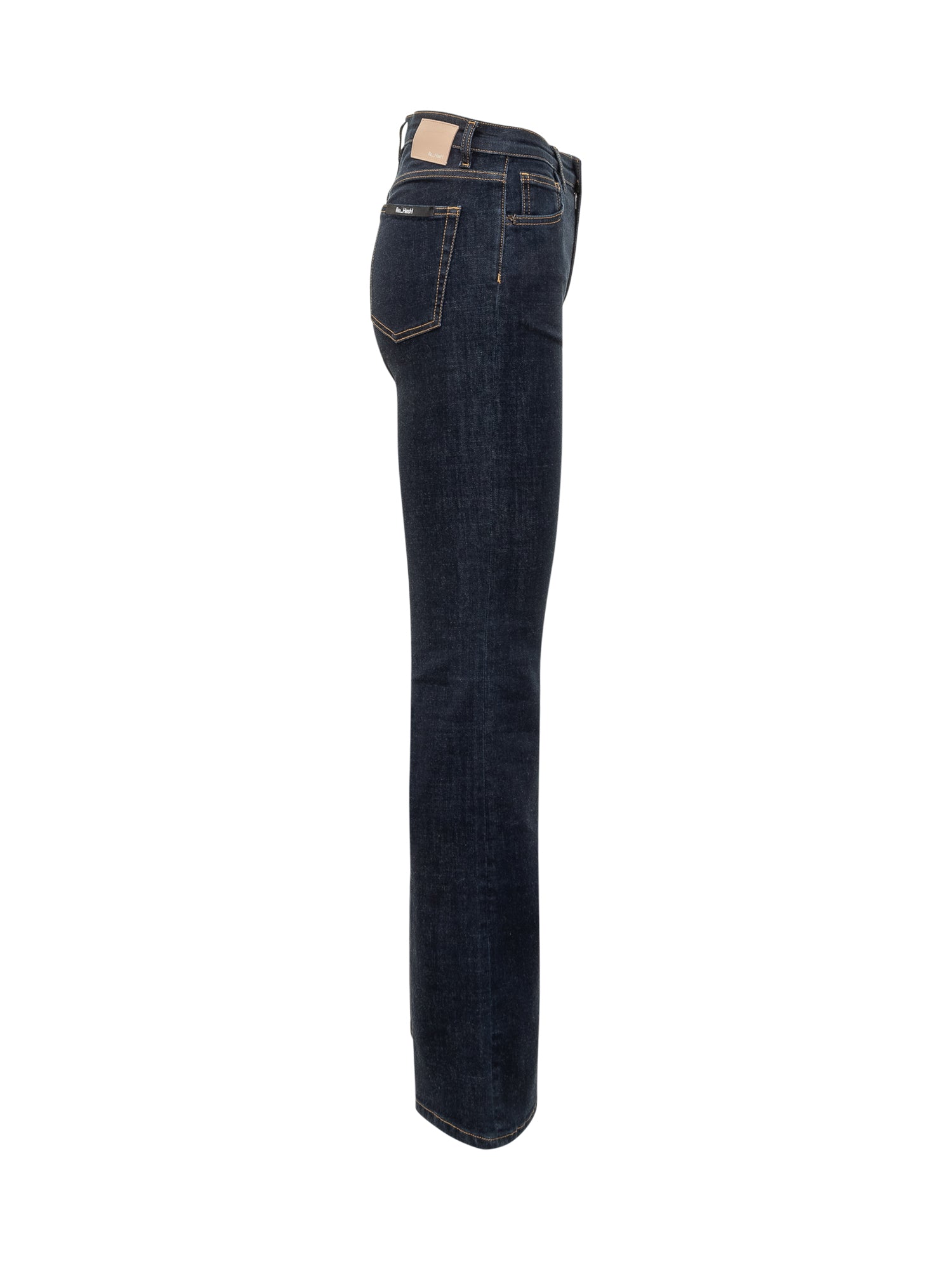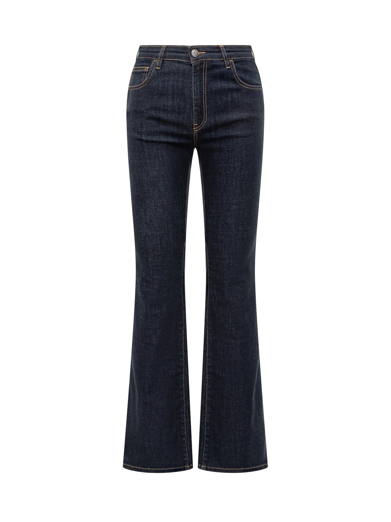 Bootcut jeans in dark denim with mid-rise waist and contrast stitching.