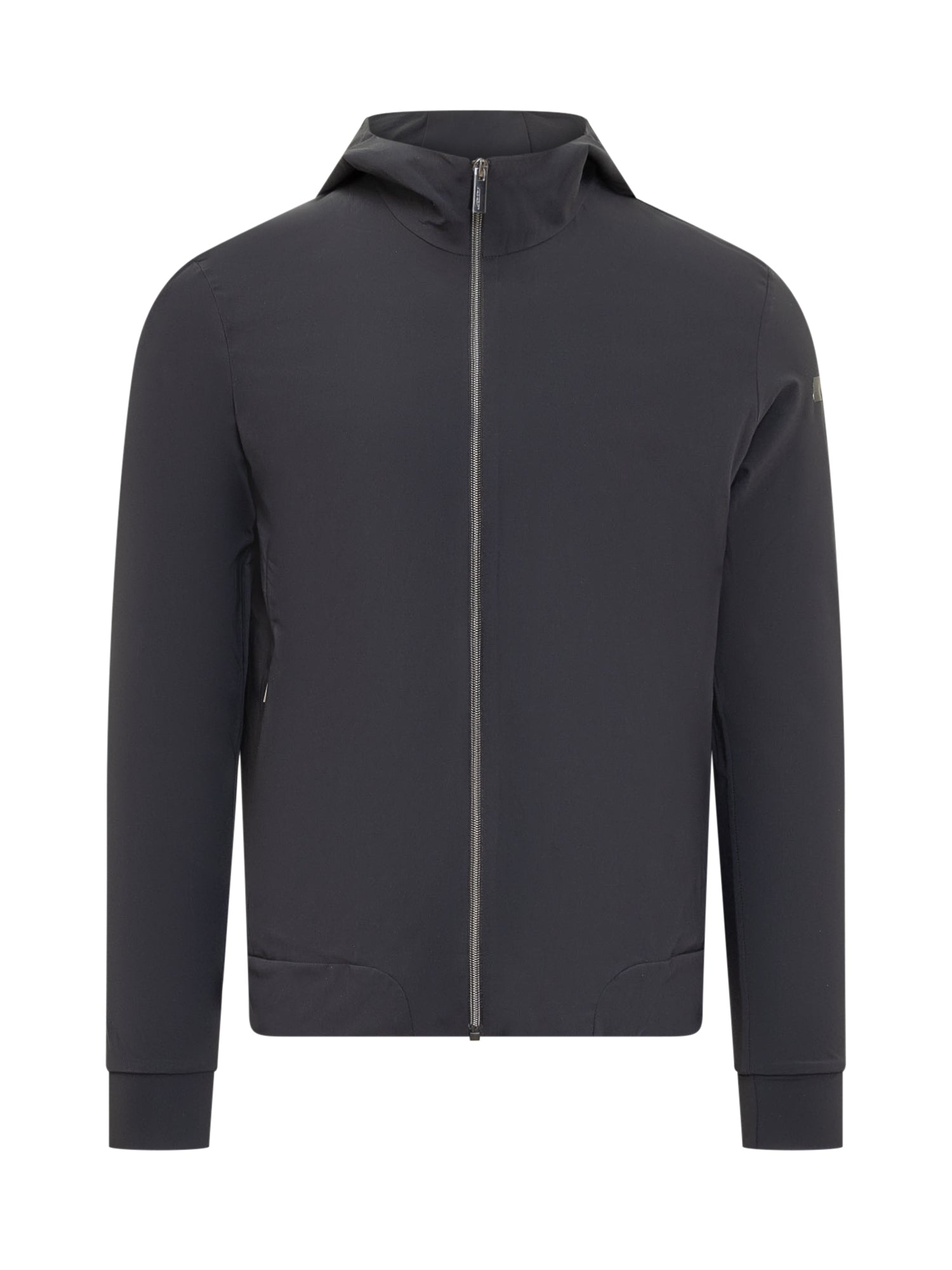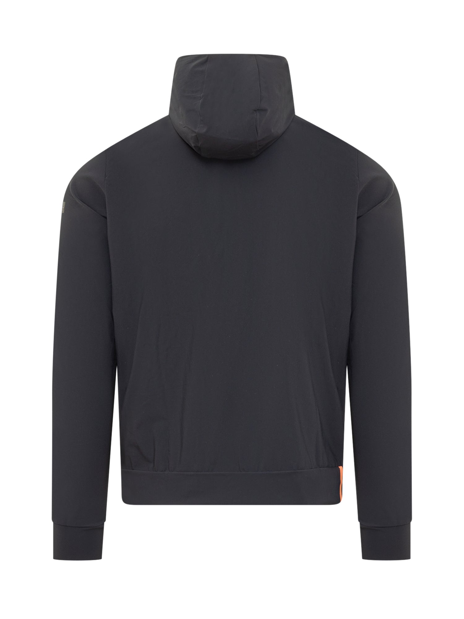 Blue hooded sweatshirt. Logo patch. Side pockets. Zip closure.