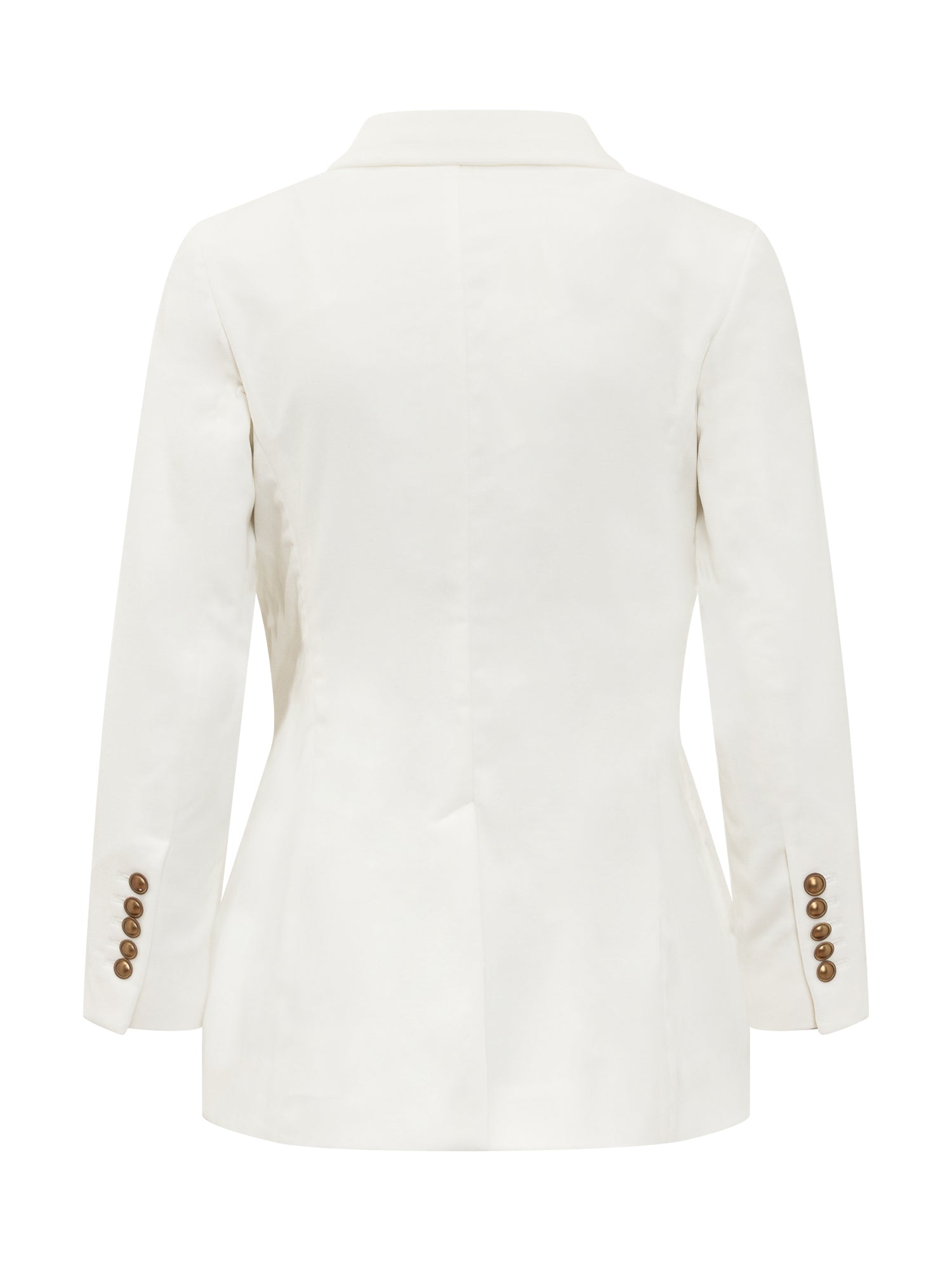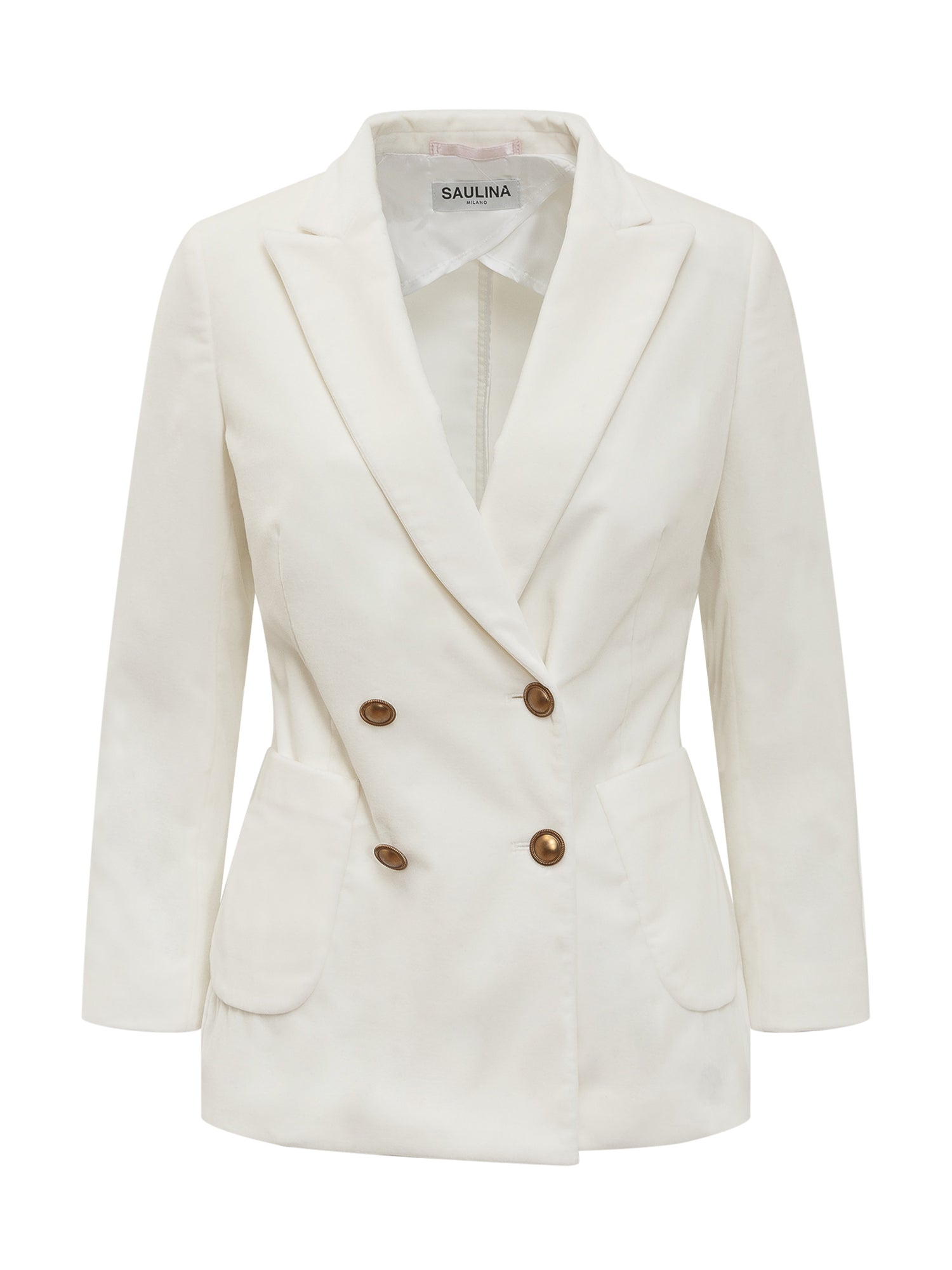Jacket with long sleeves. Double-breasted. Front pockets. Buttons at the wrists.
