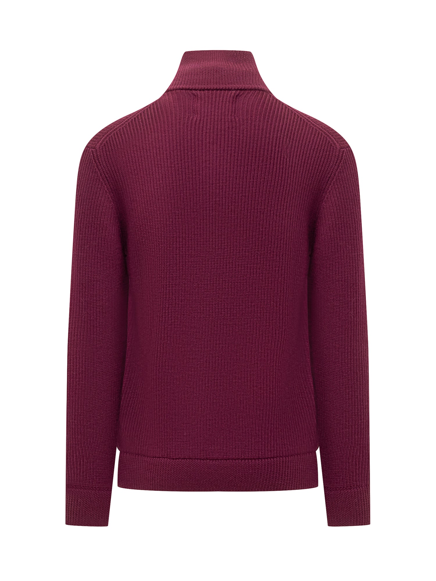 Long-sleeved sweater with high collar. Ribbed hems. Zipper closure.