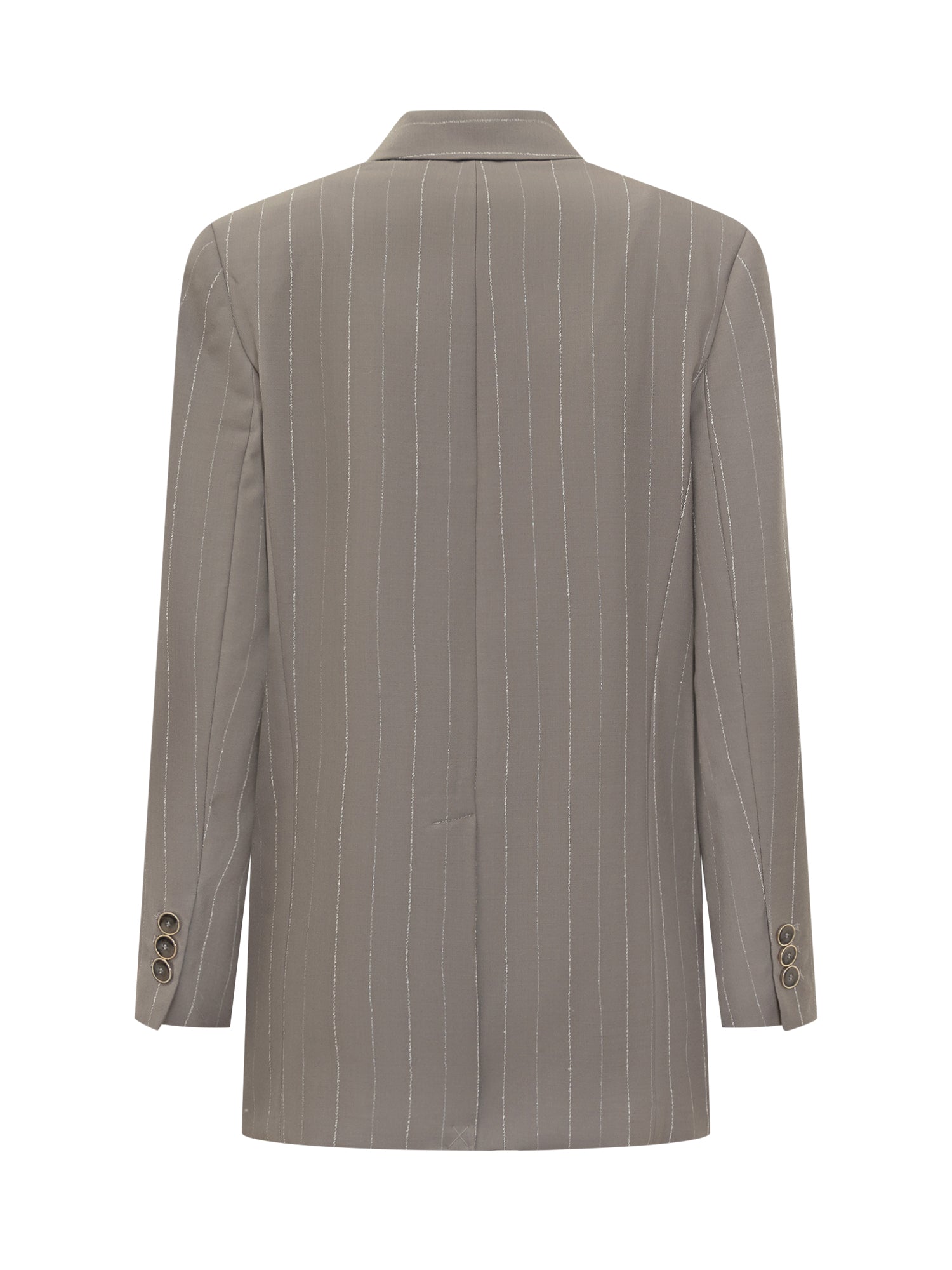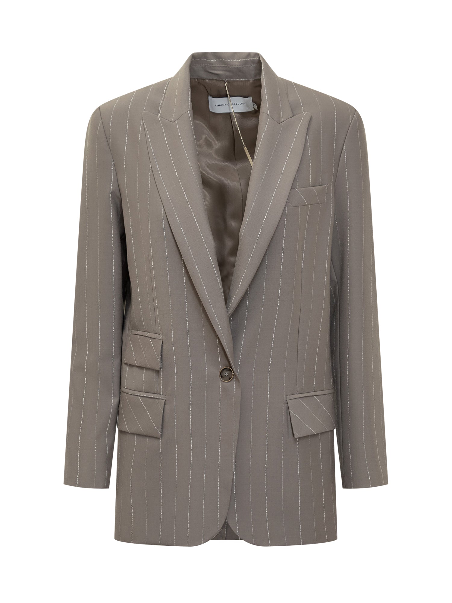 Grey blazer with thin vertical stripes, single-breasted closure and flap pockets.