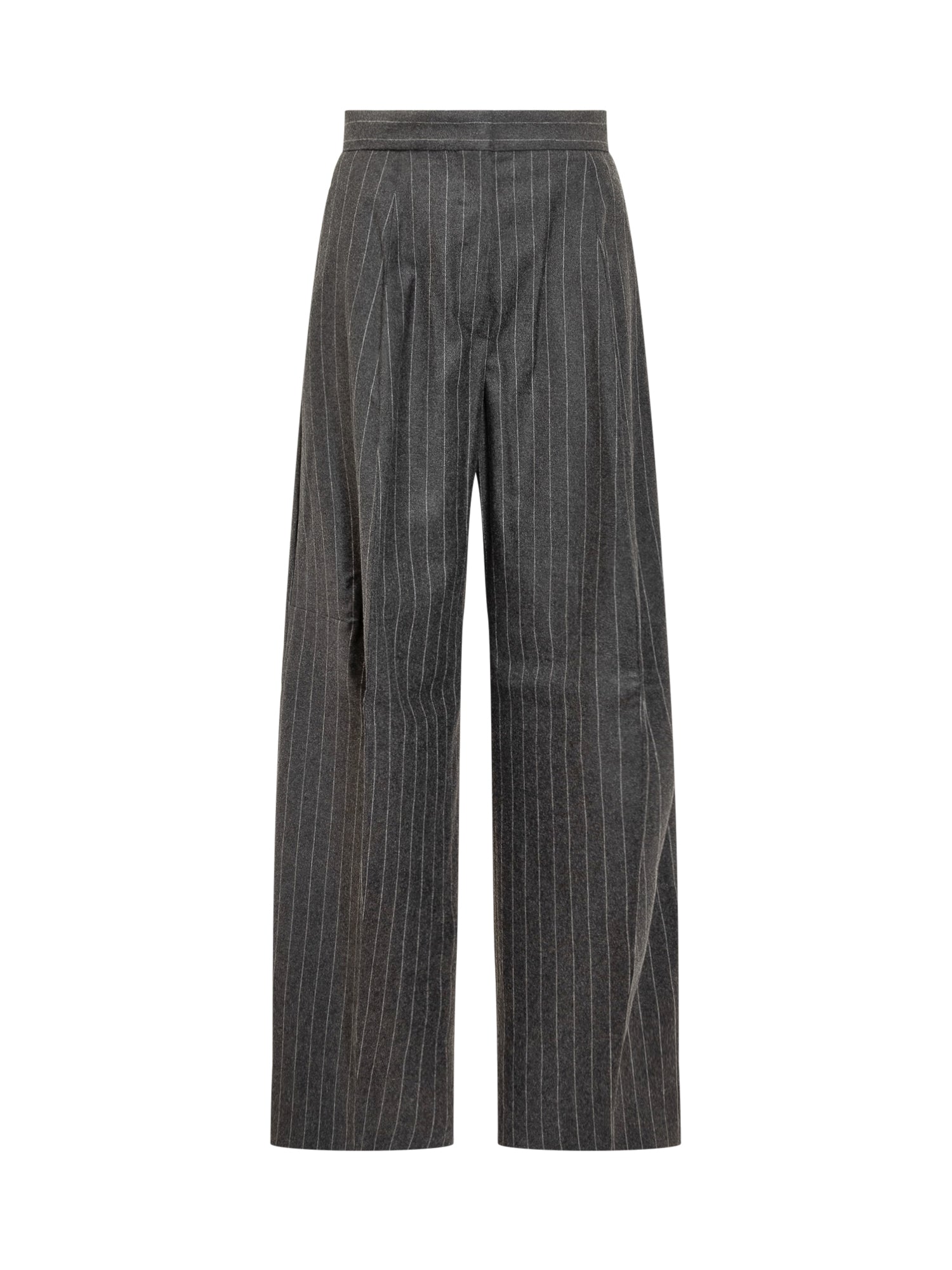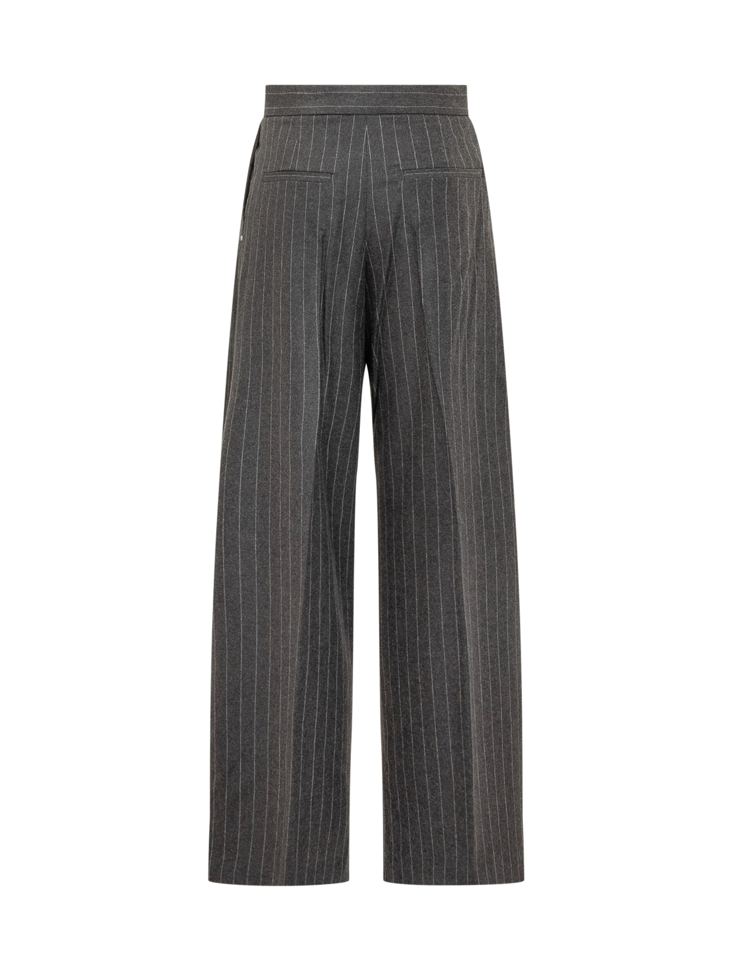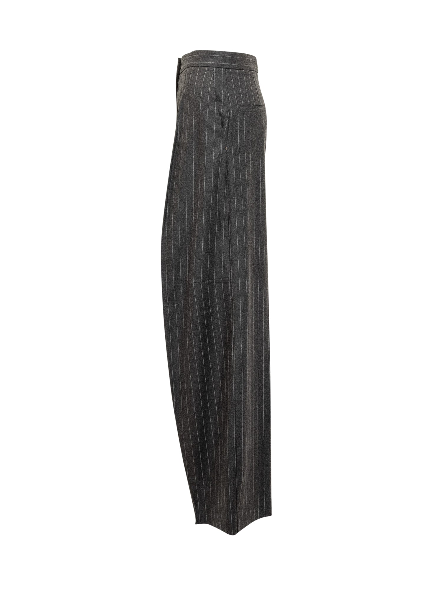 Sportmax anthracite wool trousers with pinstripe pattern and wide-leg cut. High waist with button and zip closure, front pleats and elegant lines.