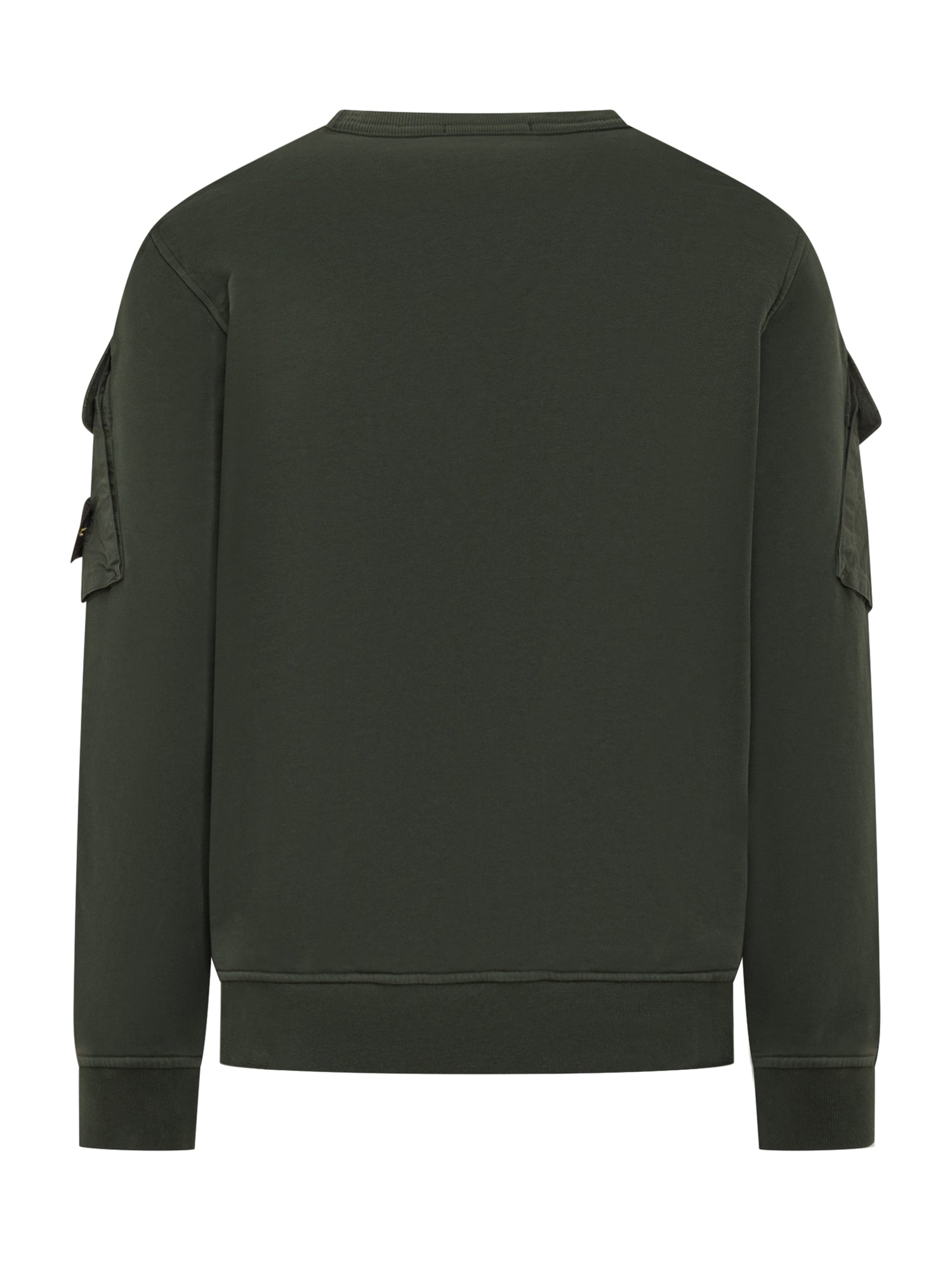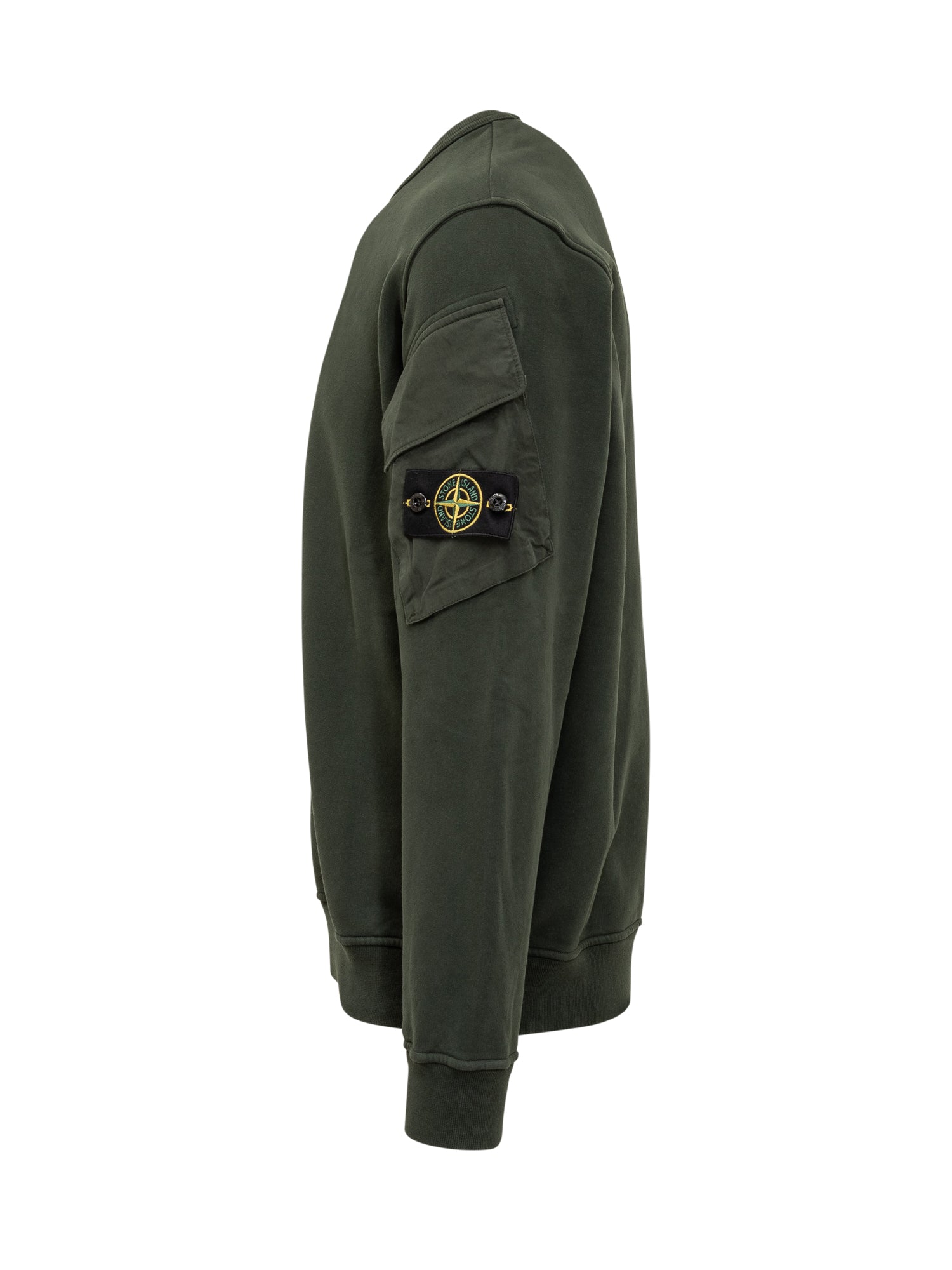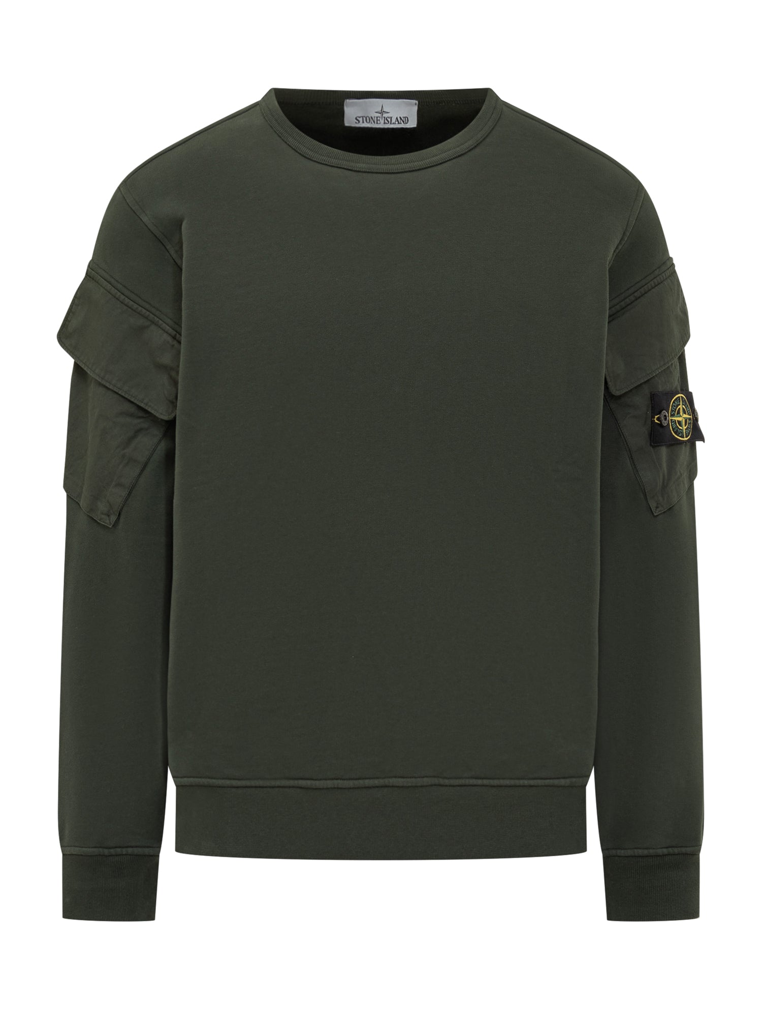 Green Stone Island sweatshirt with utility sleeve pockets and iconic logo patch.