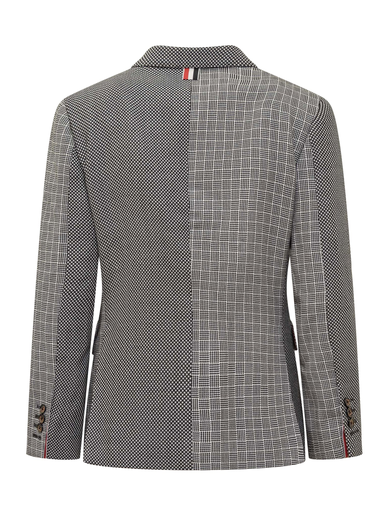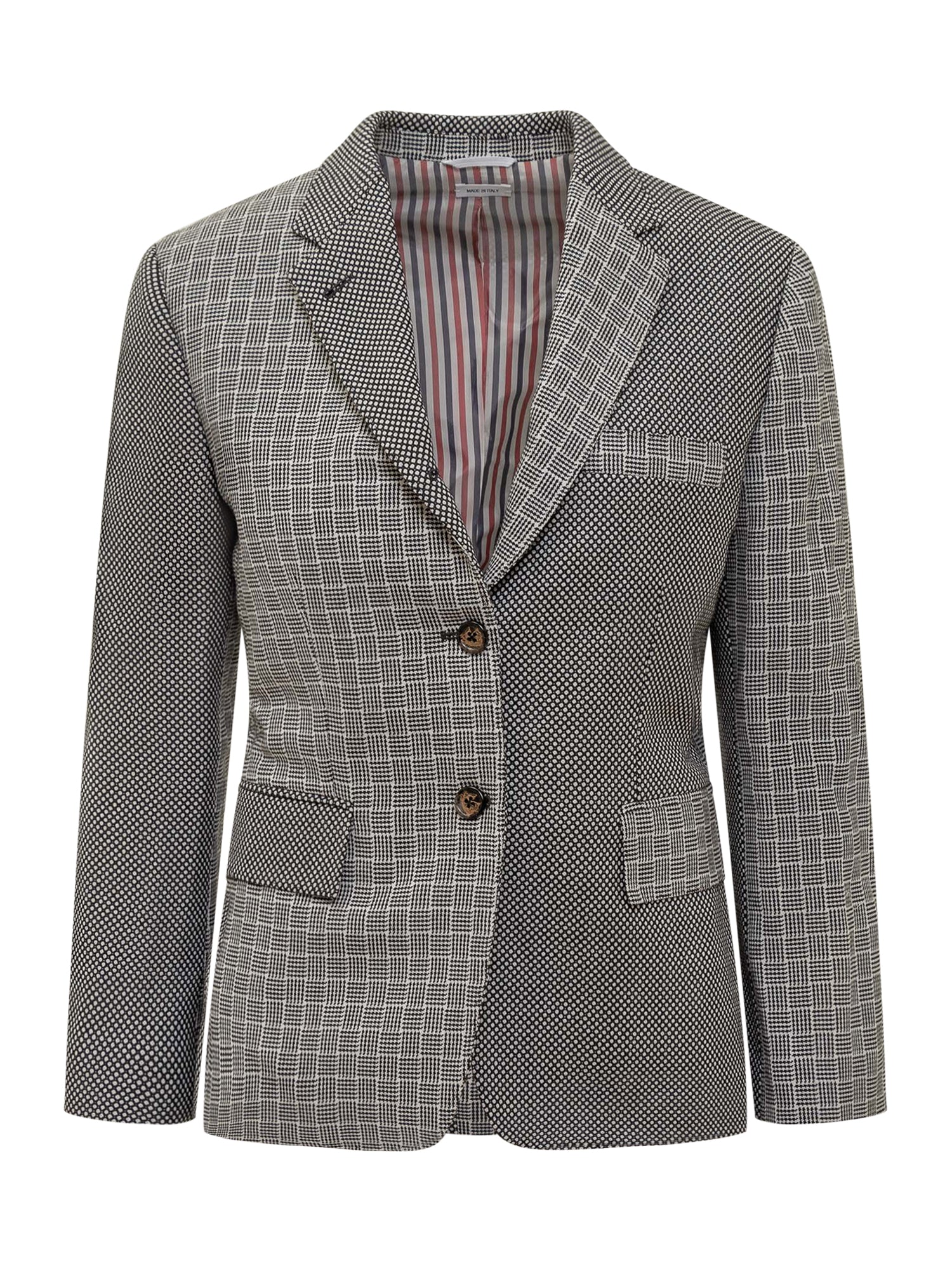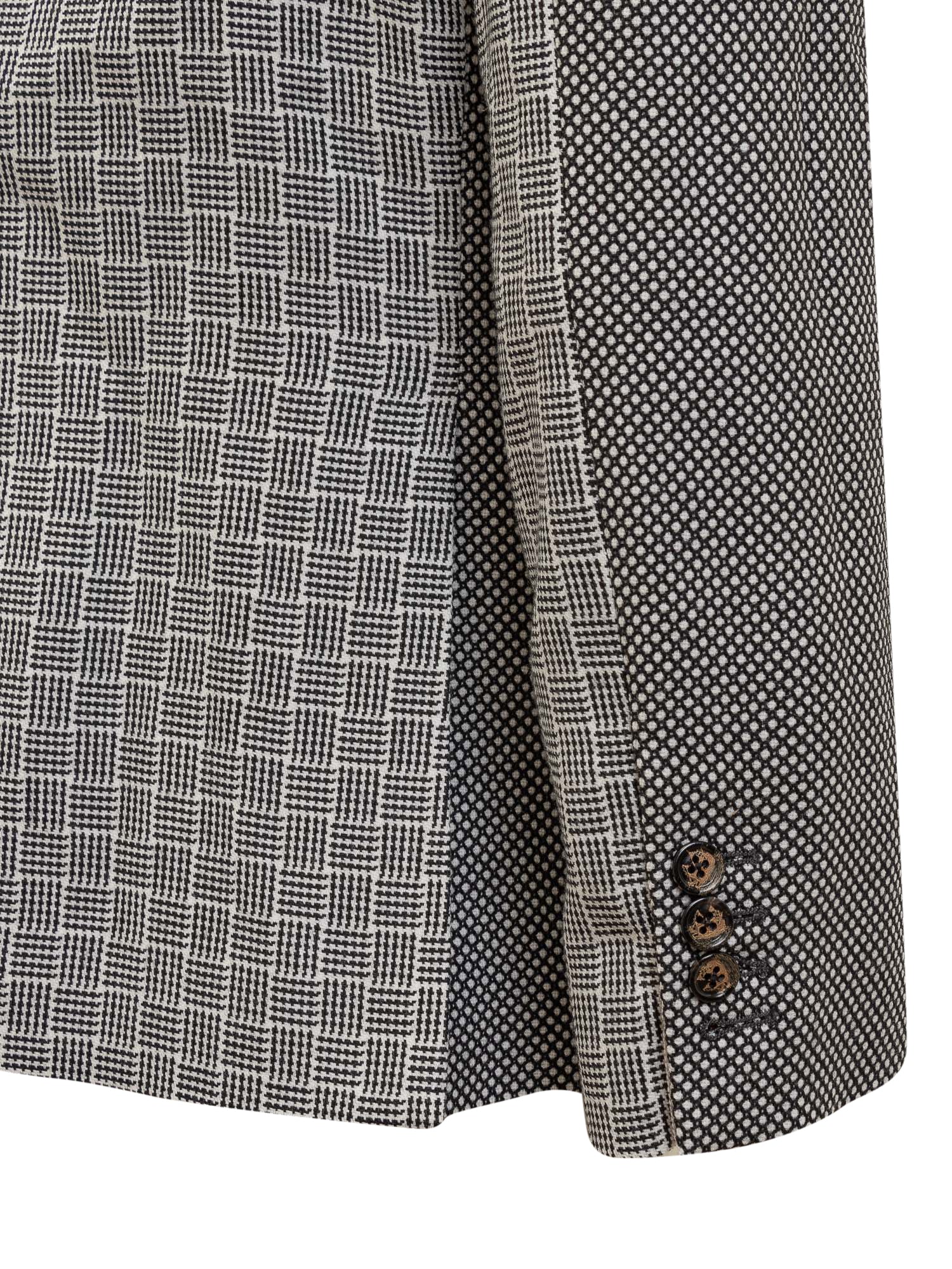 Blazer with V-neck. Classic collar. Button closure. Cuffs with buttons. Three pockets on the front. Side slits. Three inside pockets. Logo on the back. All-over pattern.