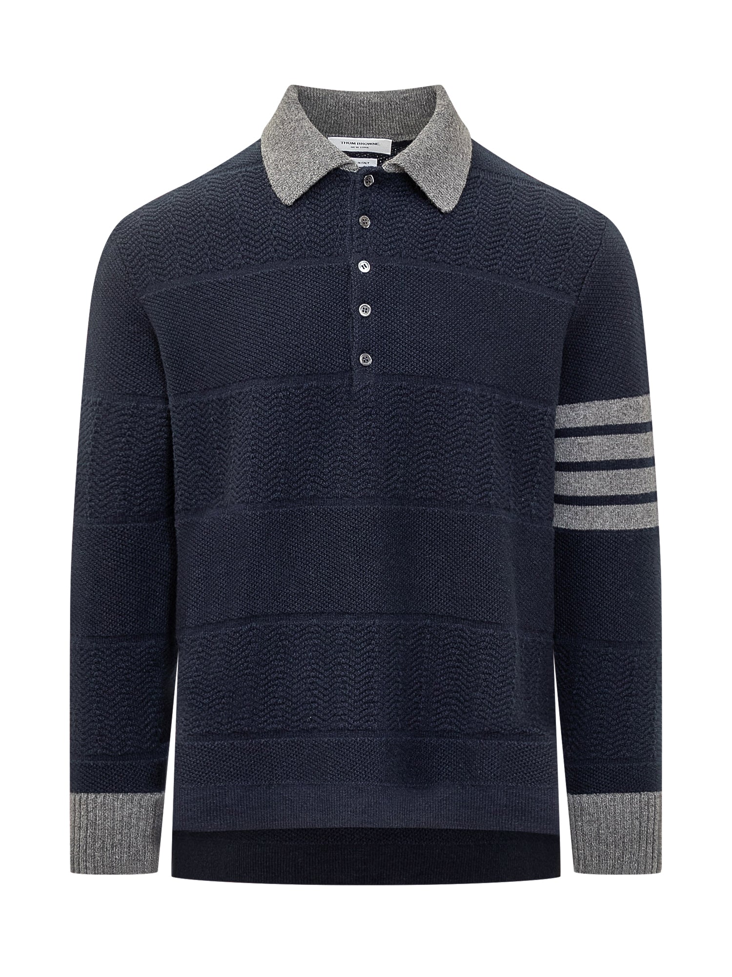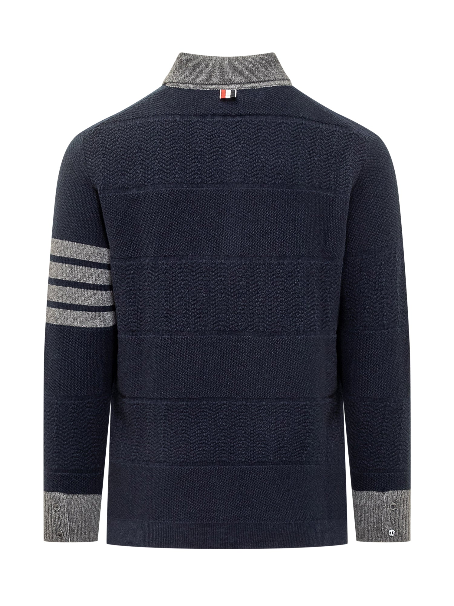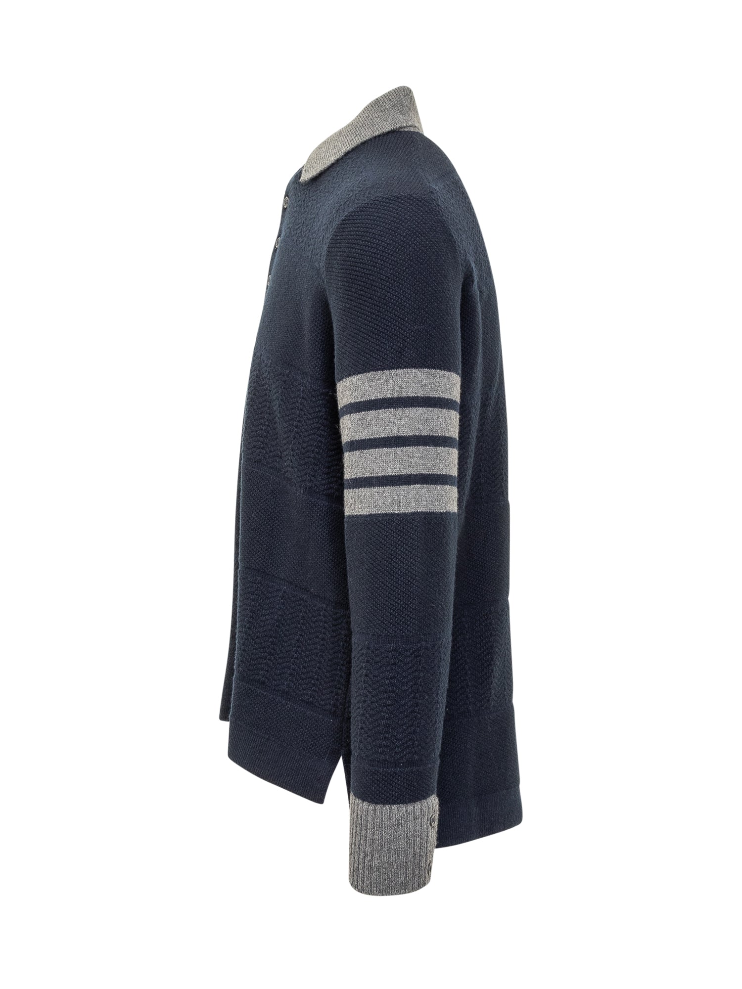 Blue wool sweater. Long sleeves. Classic collar. Button fastening. Contrast ribbed collar, cuffs and hem. Tricolour label on back. 4-BAR logo in jaquard on left sleeve.