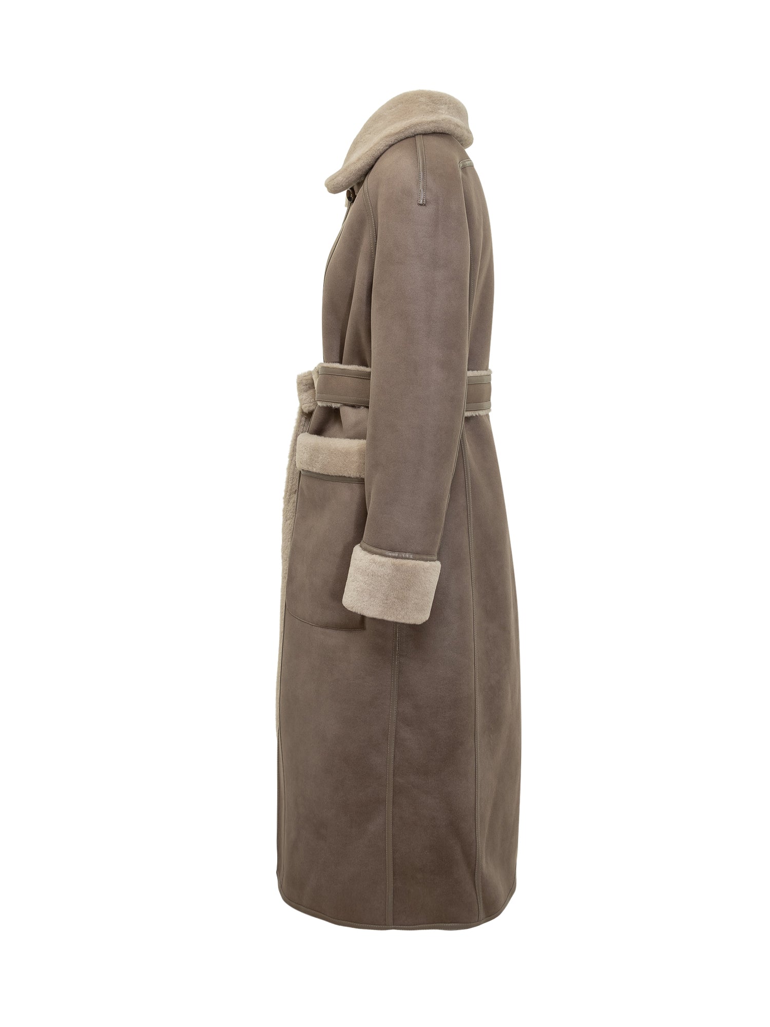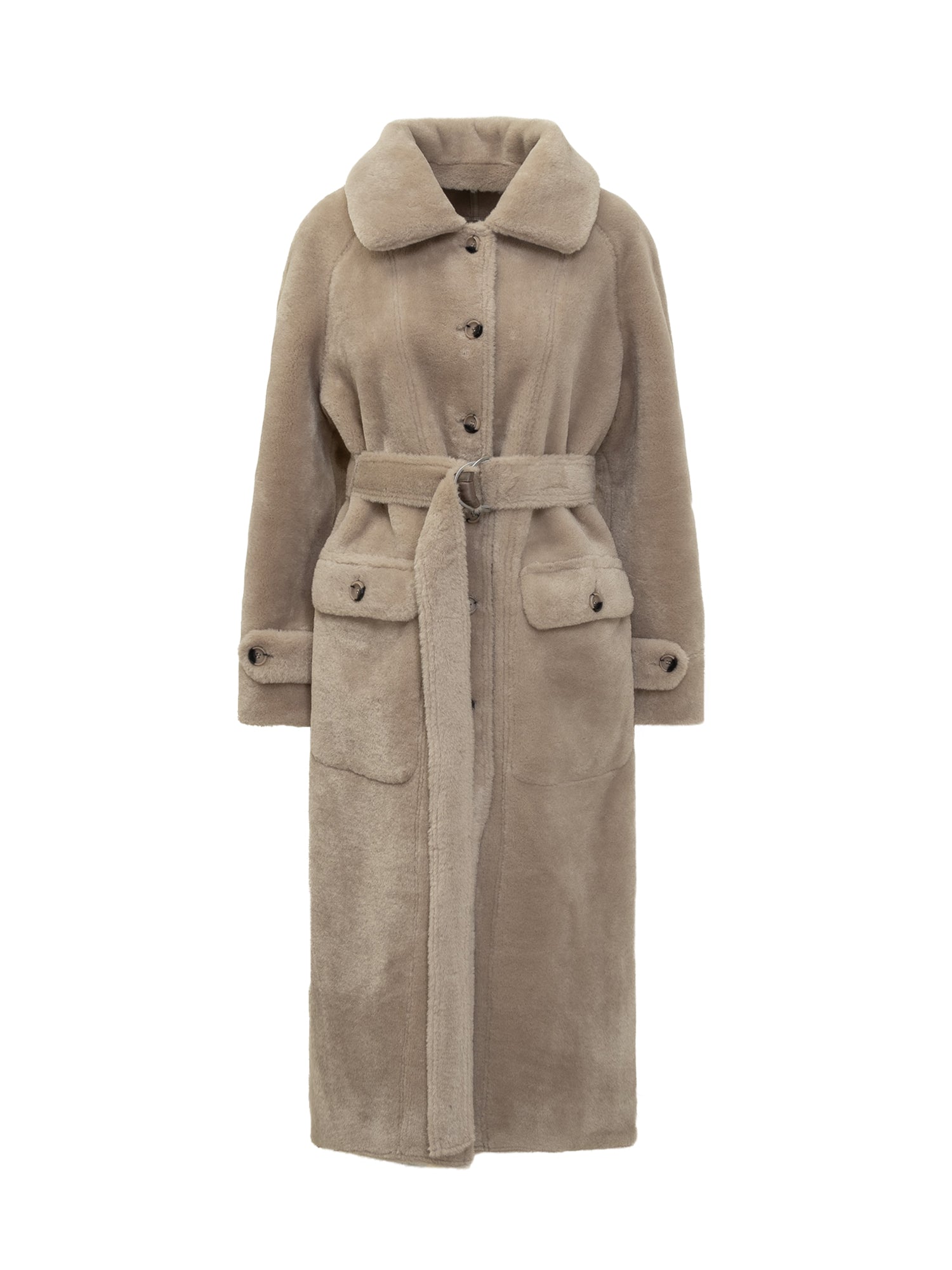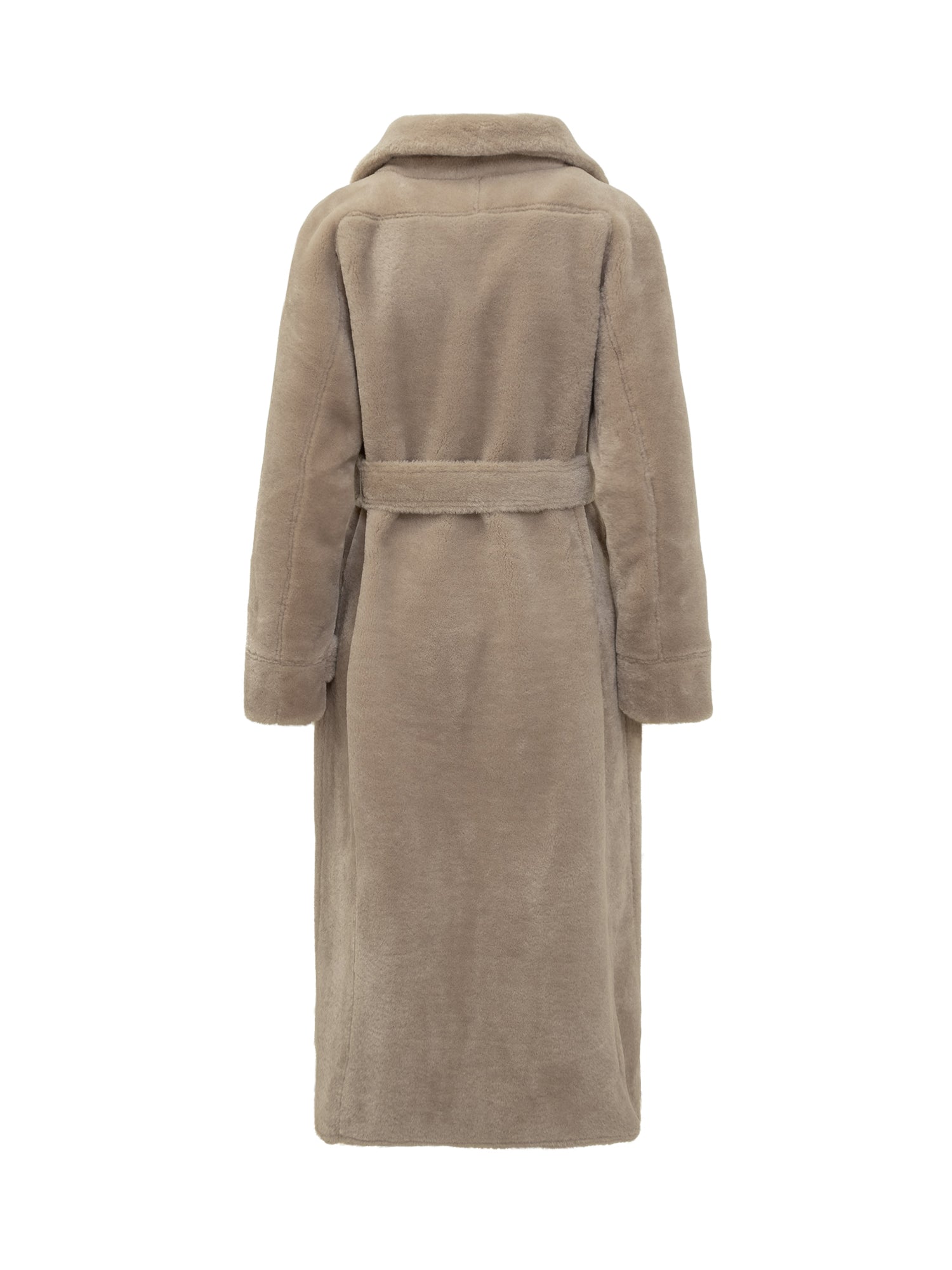 Urban Code long coat in beige faux shearling with classic collar, belted waist and contrast details.