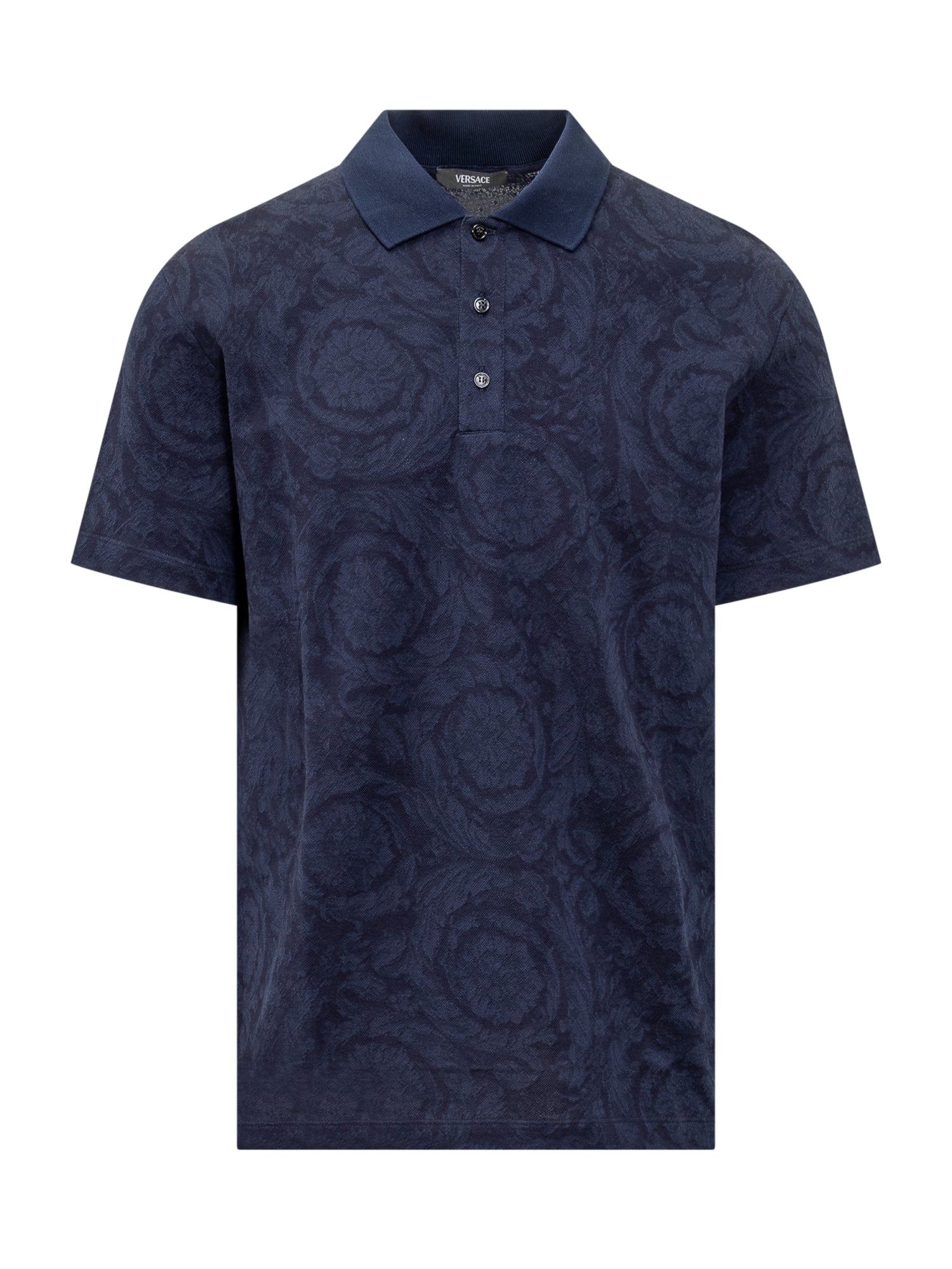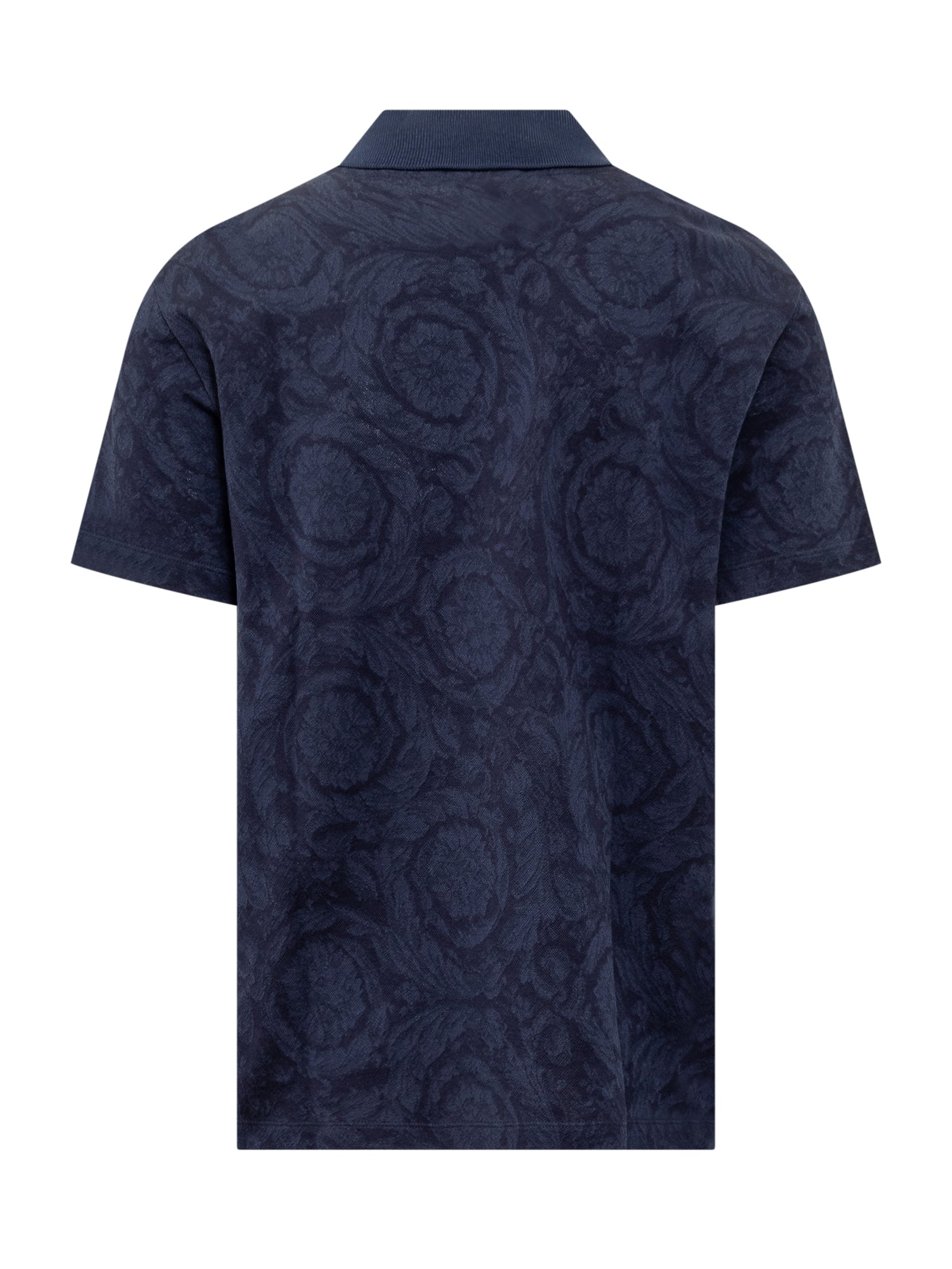 Blue polo shirt with classic collar. Button closure. Jacquard baroque pattern.
