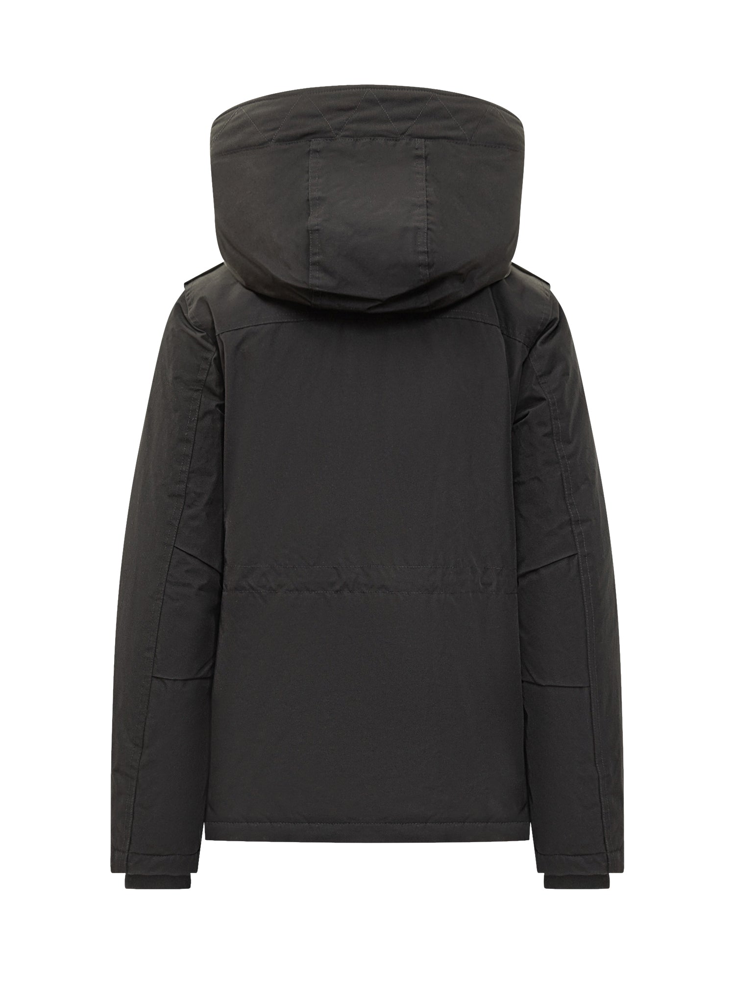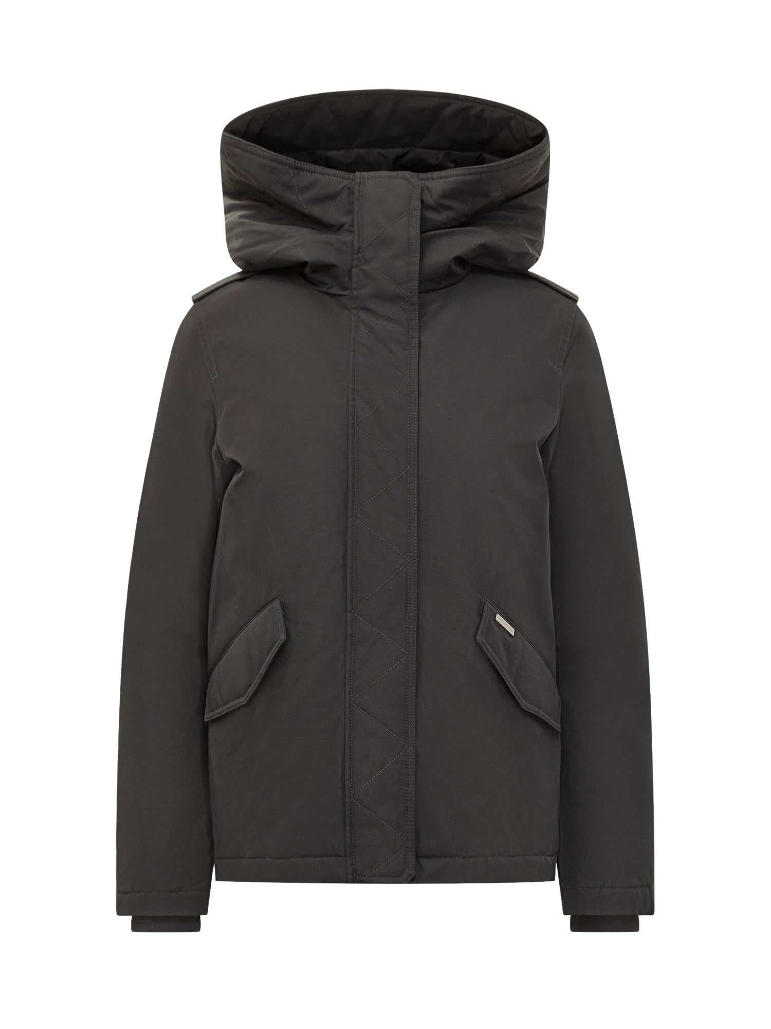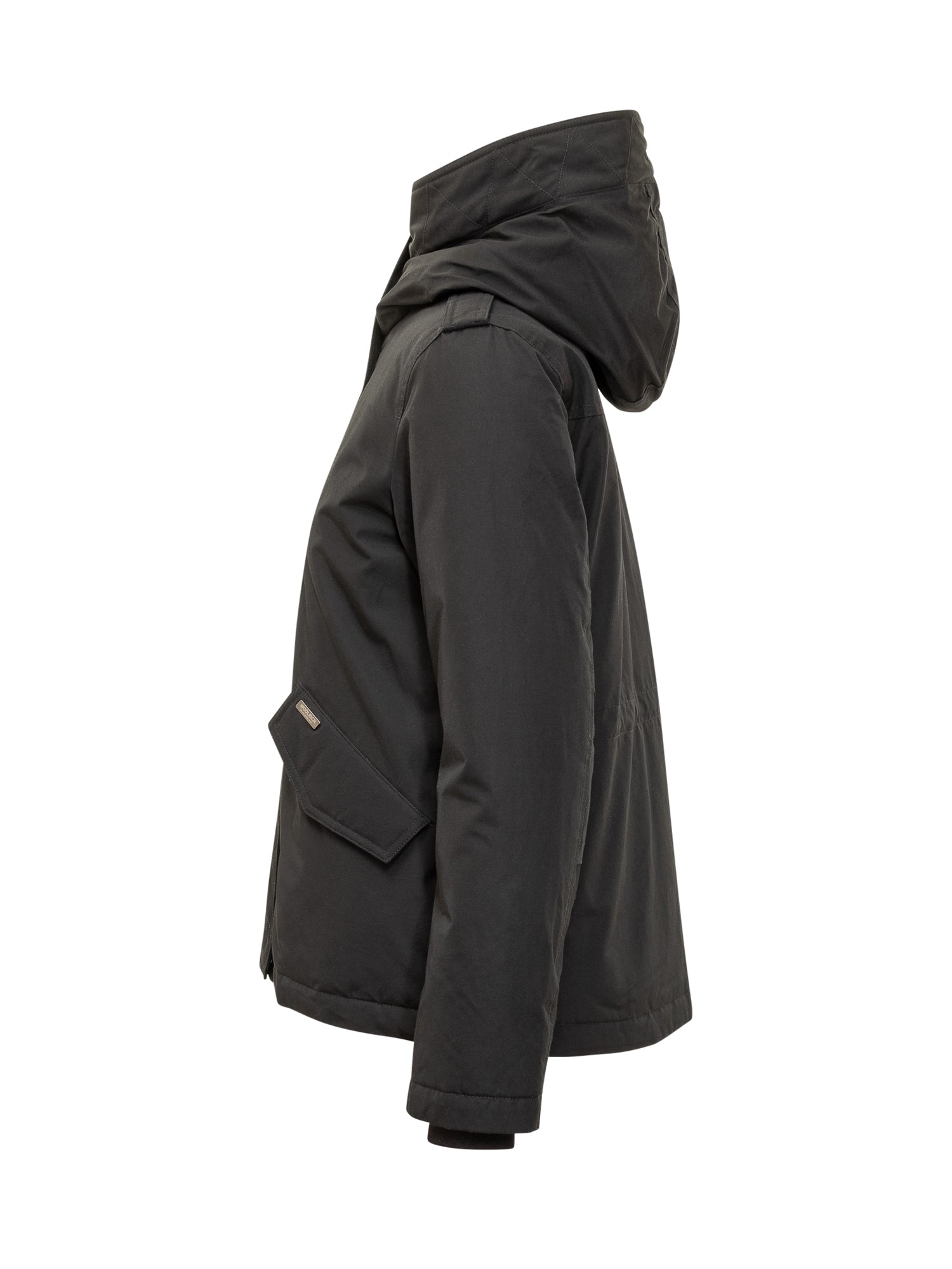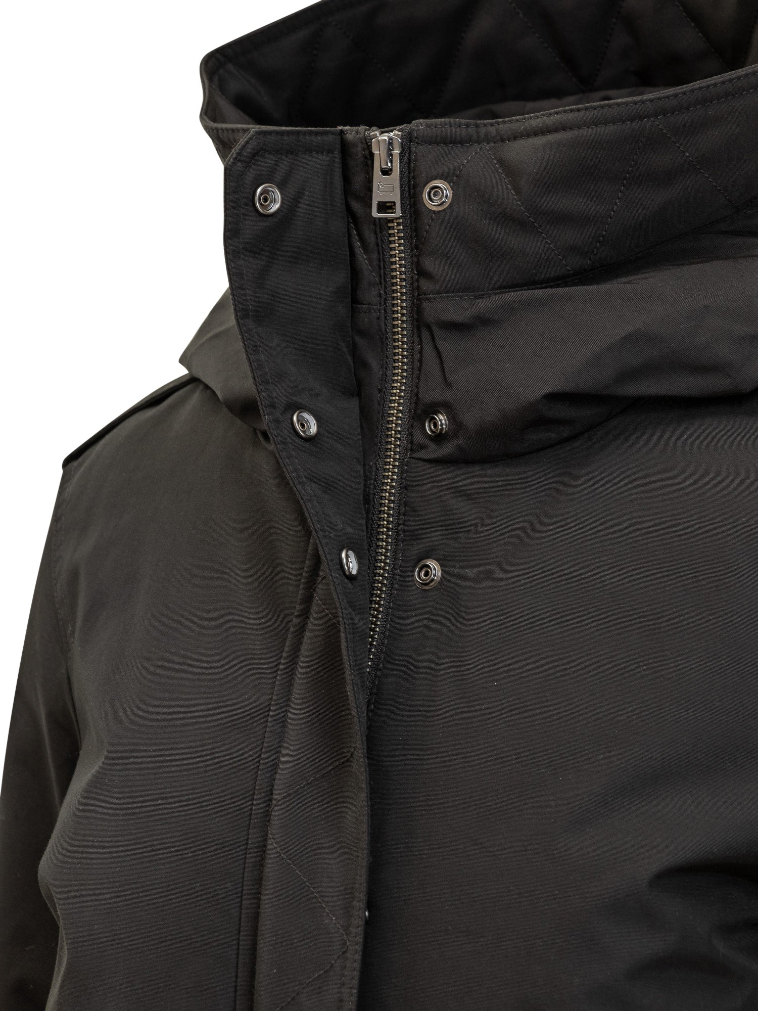 Woolrich black padded military jacket with structured hood and flap pockets.