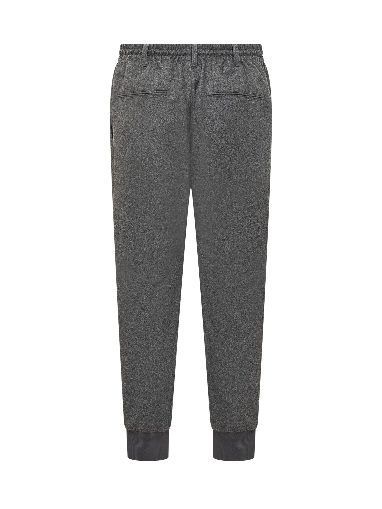 Grey trousers with drawstring. Logo on the side. Side and back pockets. Belt loops. Elastic waistband. Stretch bottom. Button closure.