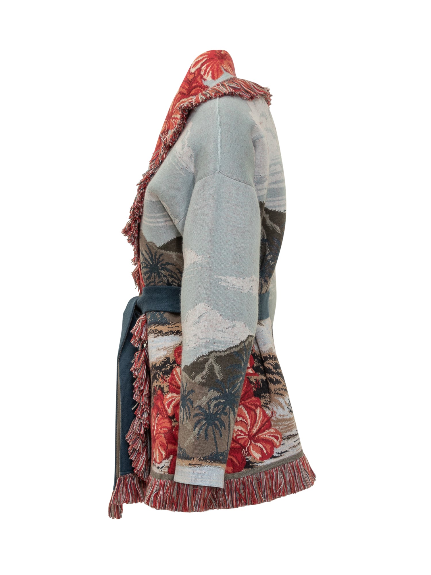 Alanui wool cardigan featuring a tropical landscape with large red flowers, decorative fringes and waist belt.