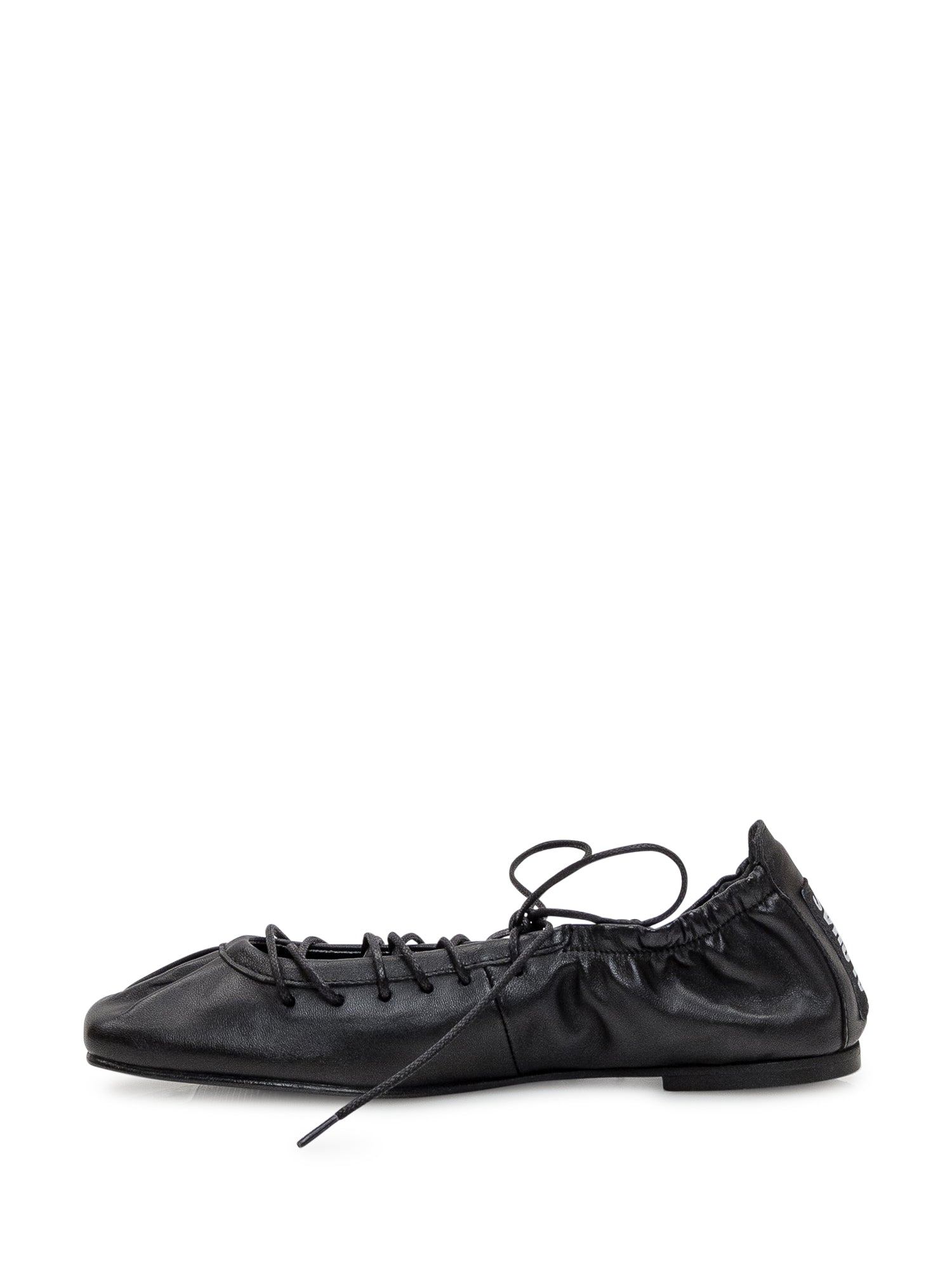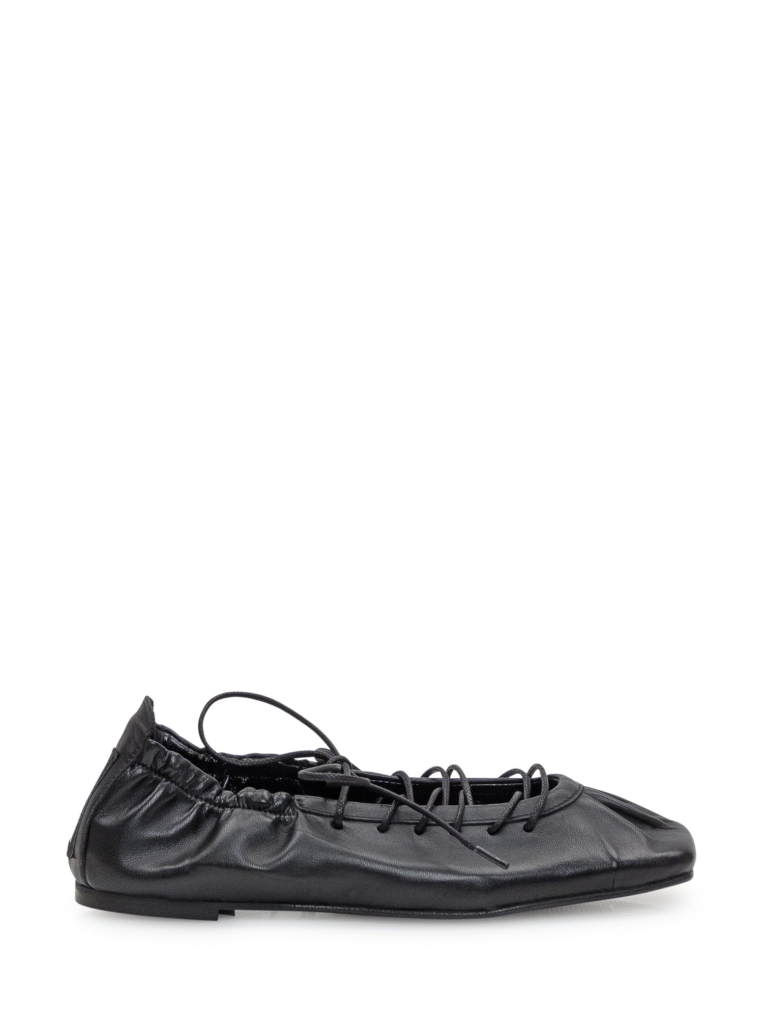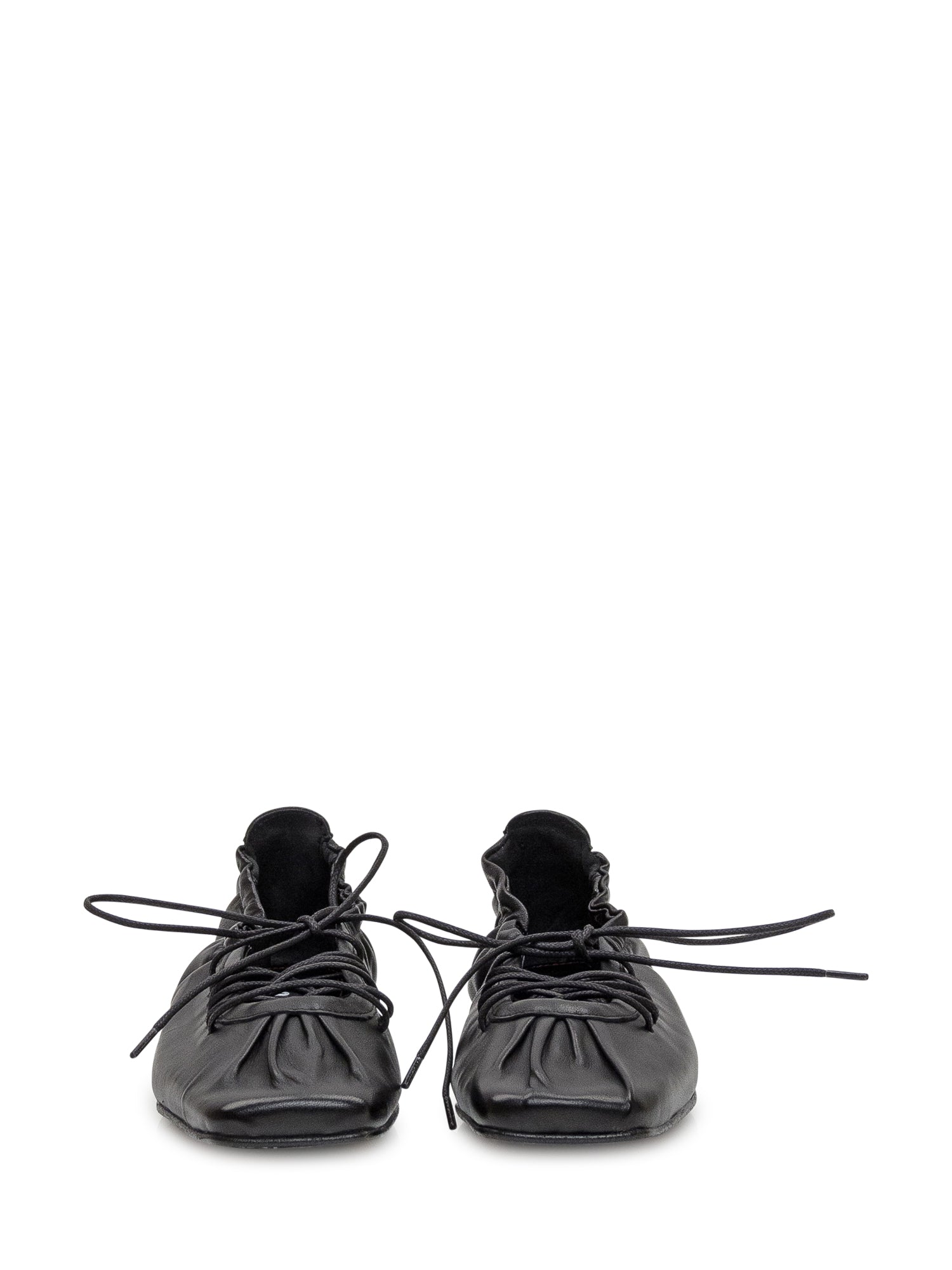 Black ballerina with a classic shape and no heel. Made of soft shiny leather decorated with laces that cover the instep. Silhouette is simple and clean, with a rounded tip.