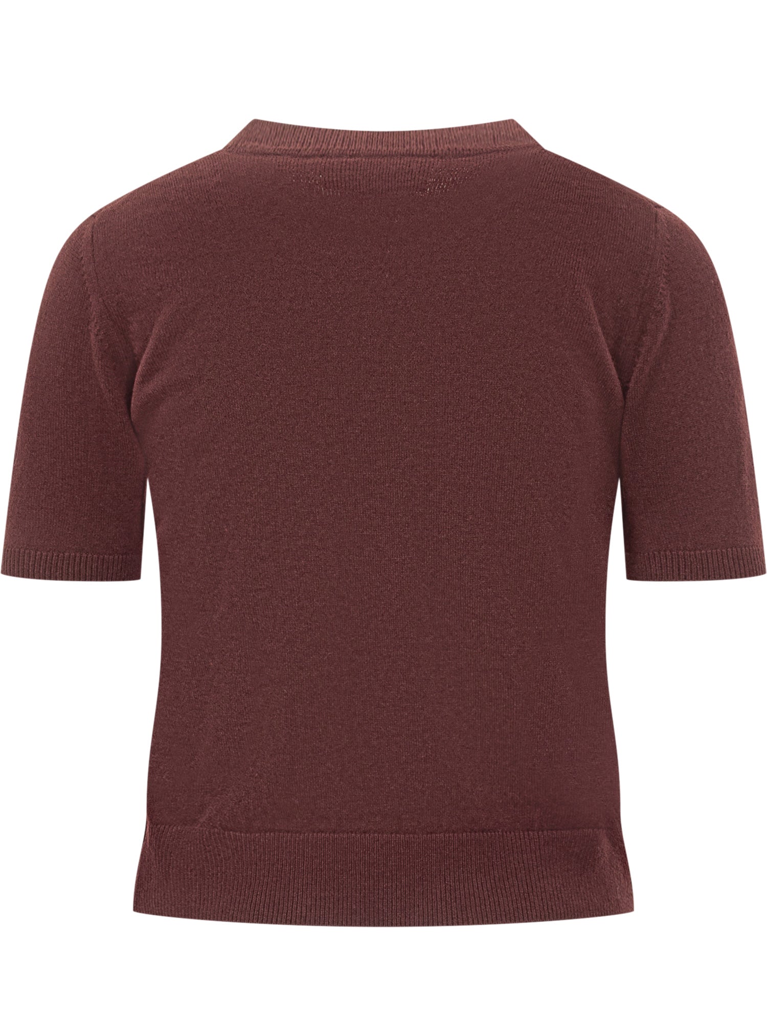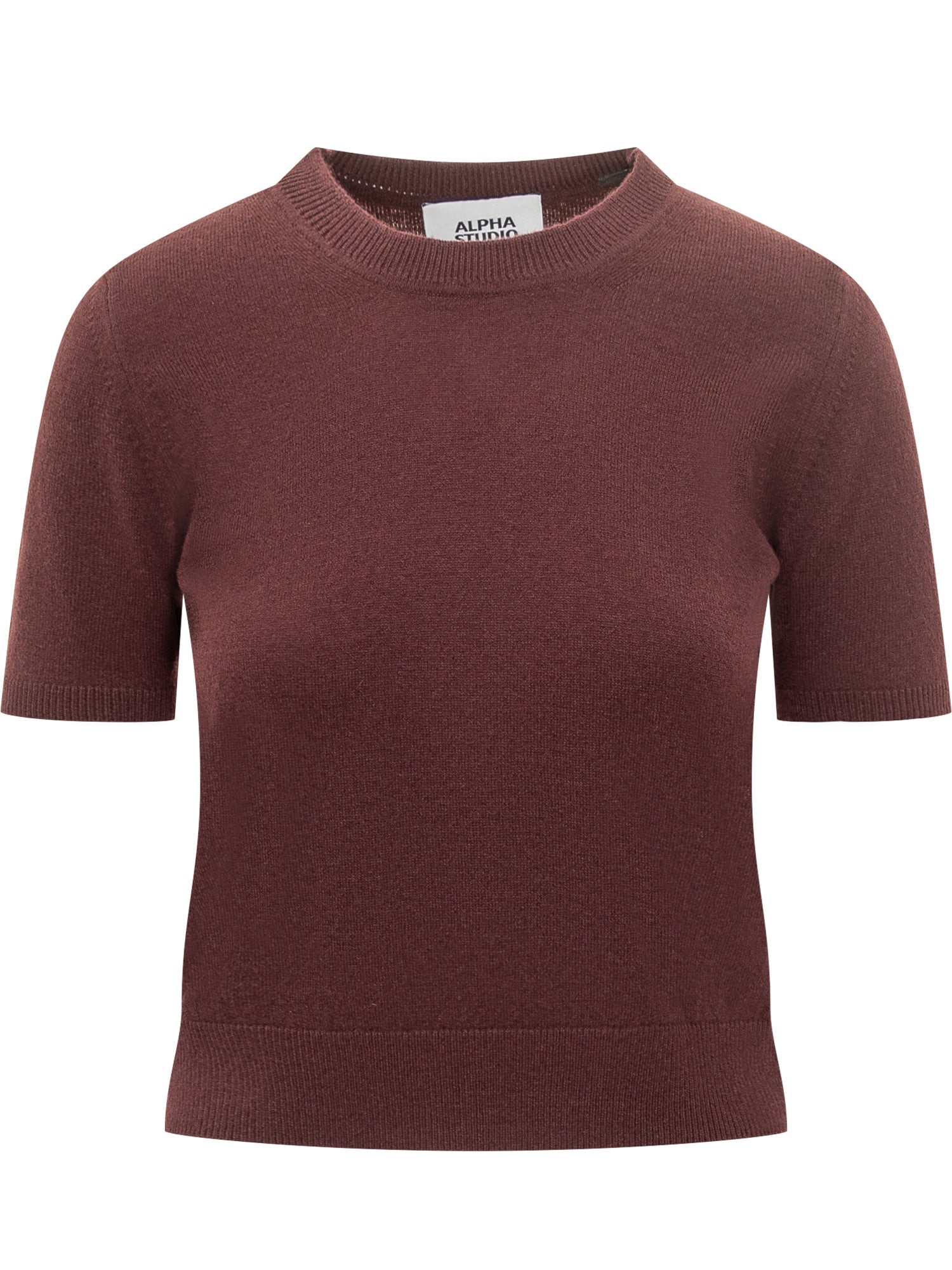 Alpha Studio short-sleeve sweater in soft bordeaux knit with round neckline.