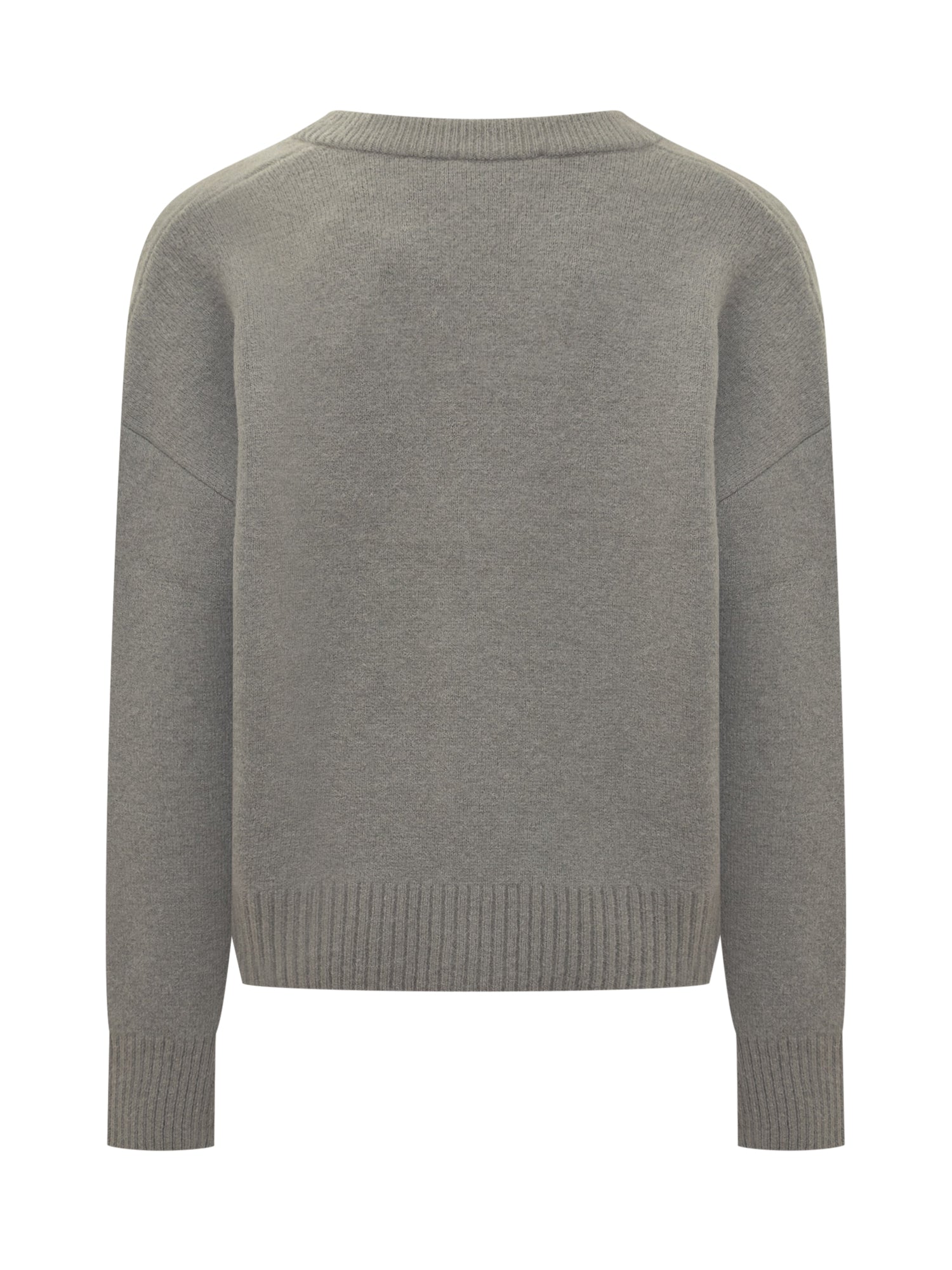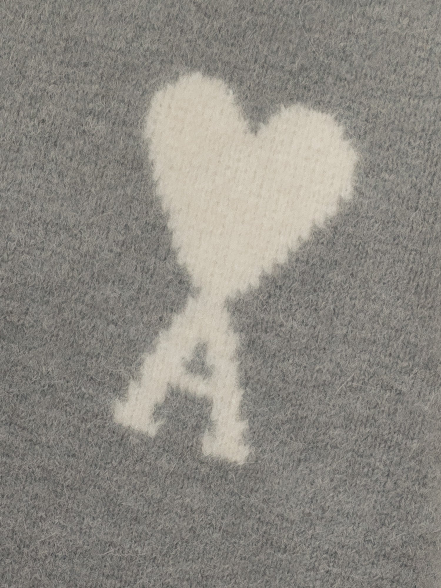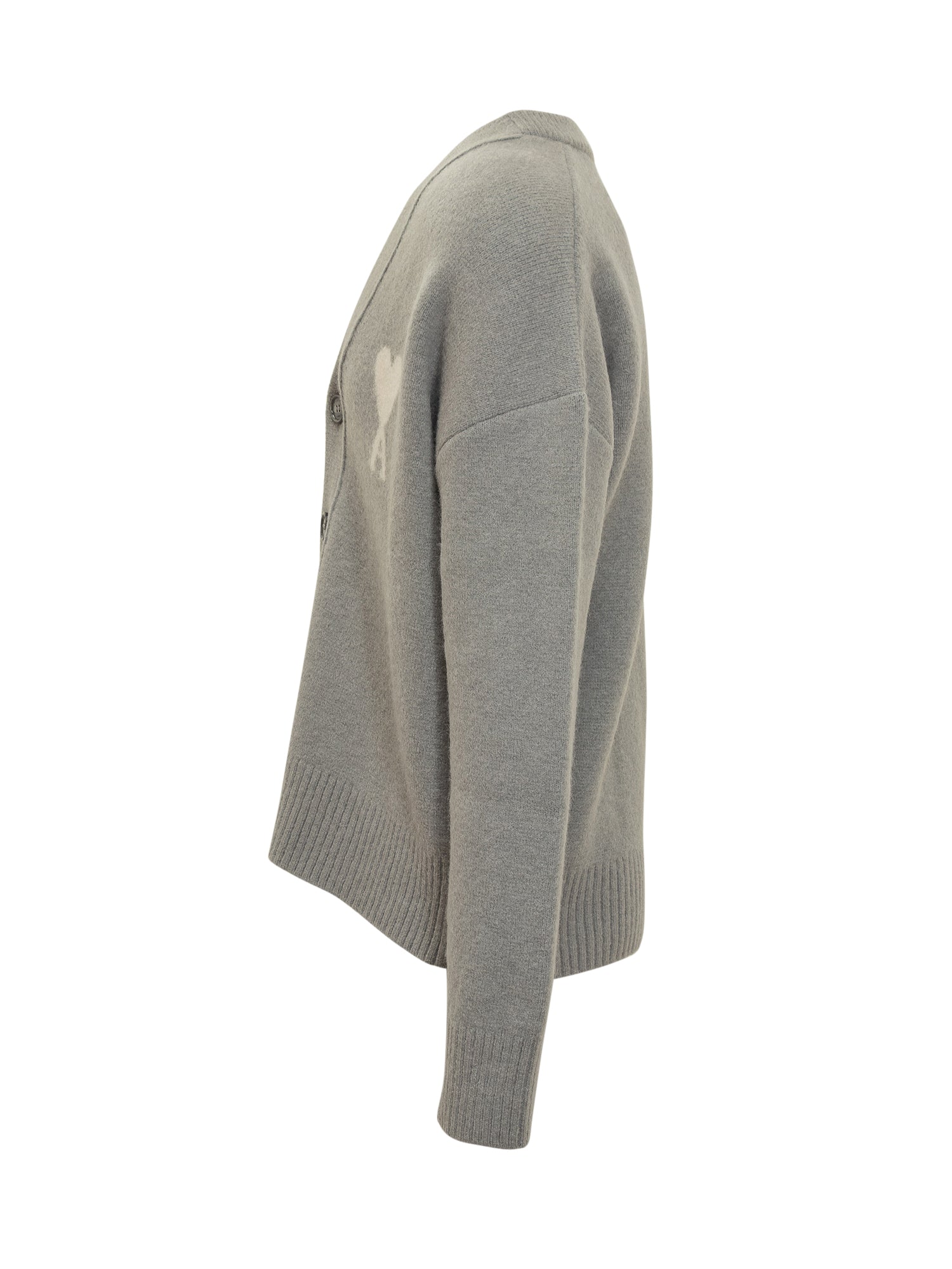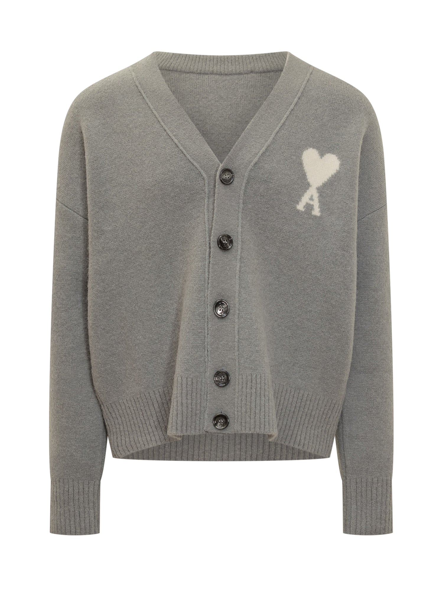 Grey wool cardigan by Ami Alexandre Mattiussi with V-neck, button closure, and white embroidered A heart logo on chest.