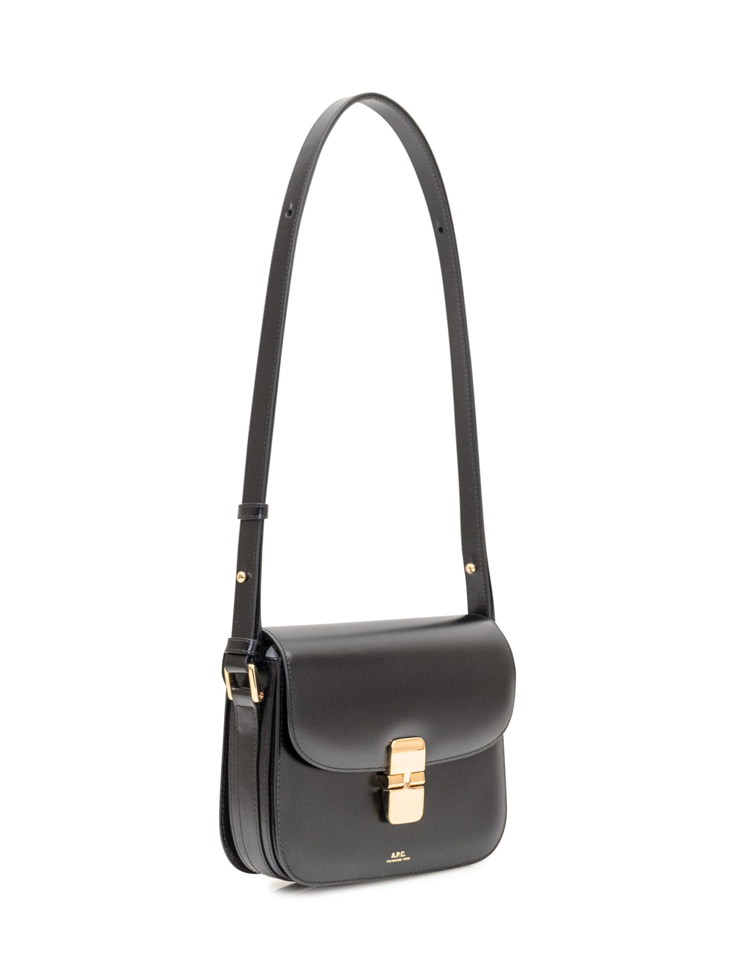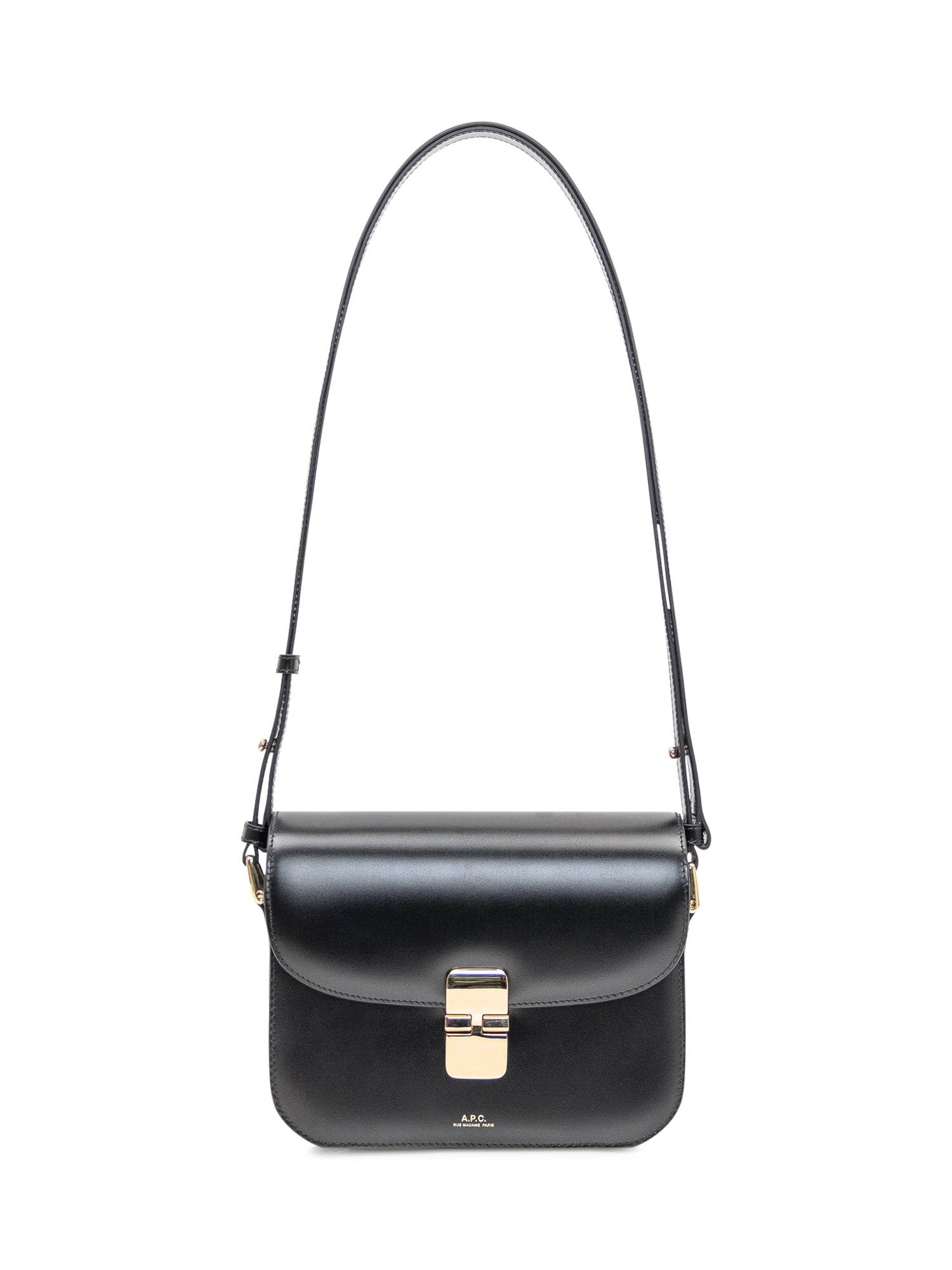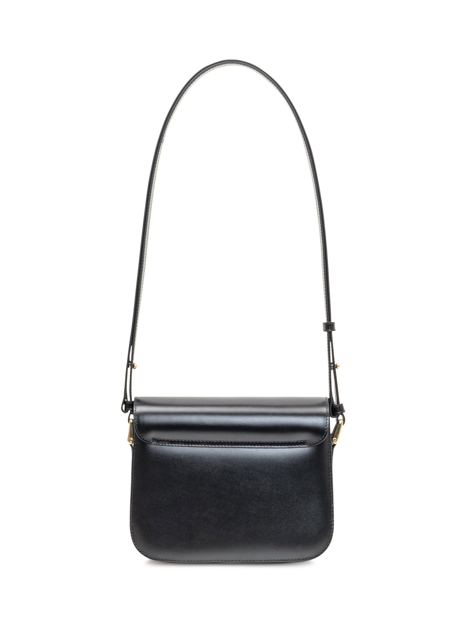 Black leather bag. Adjustable shoulder strap. Wearable on the shoulder or shoulder.Closure in gold metal. Flap lined with bovine suede.Two gold rings on the sides. The logo on the front side in gold embossed.