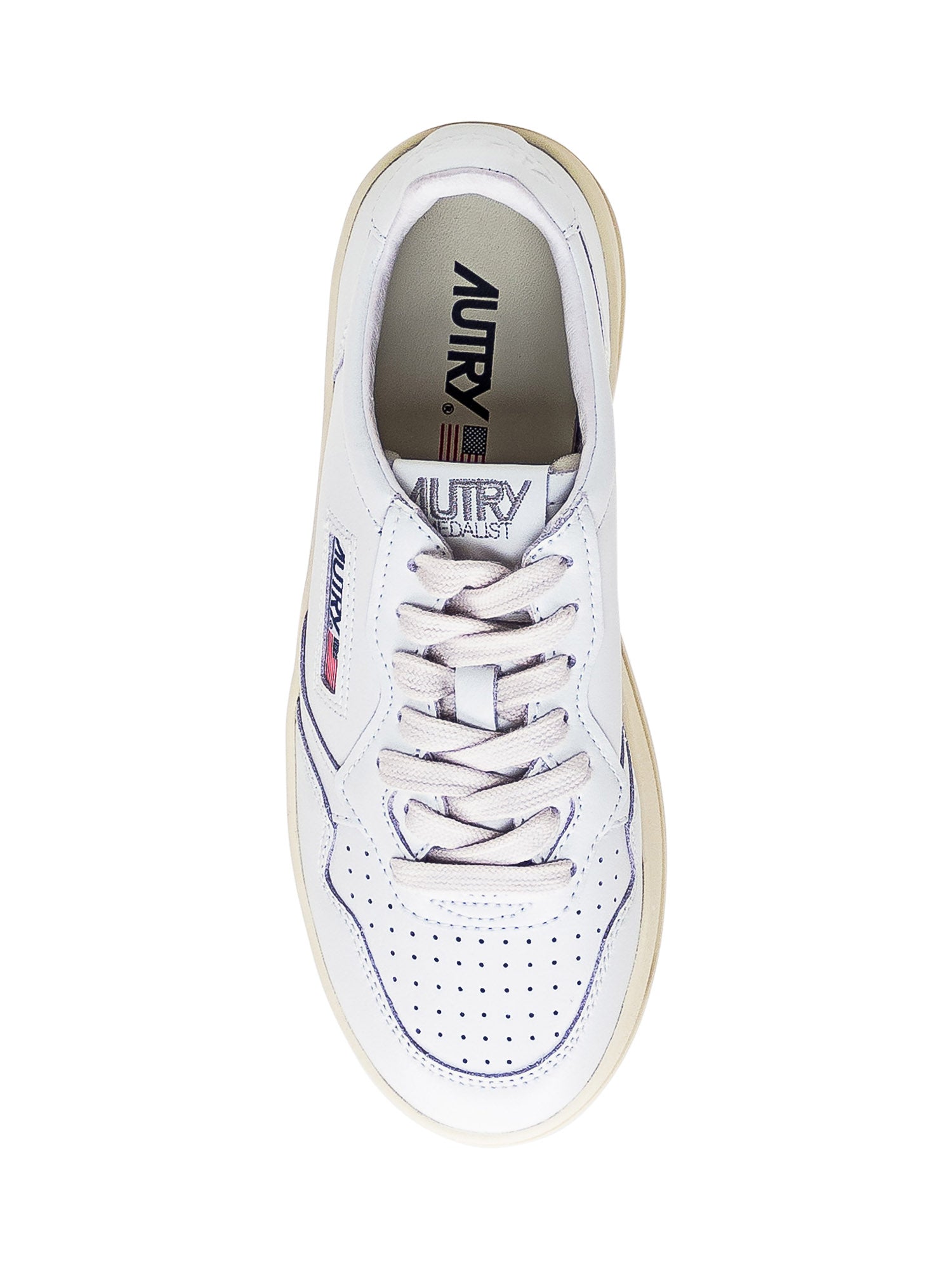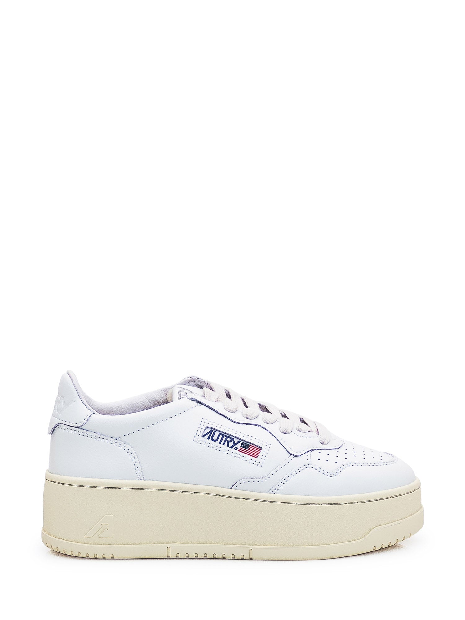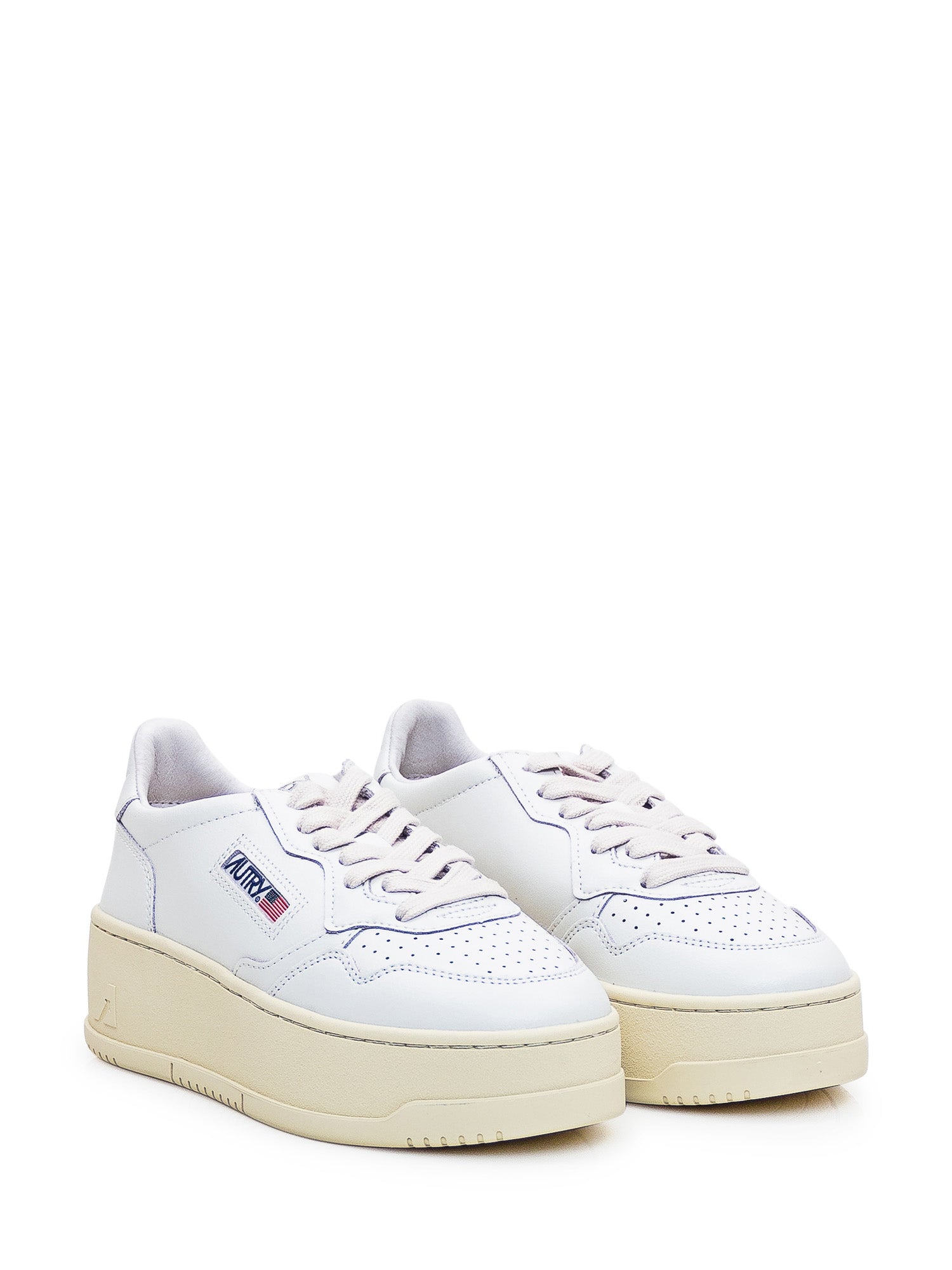 Low white sneaker with platform. Lace-up closure. Perforated toe. Logo on side, tongue and heel.
