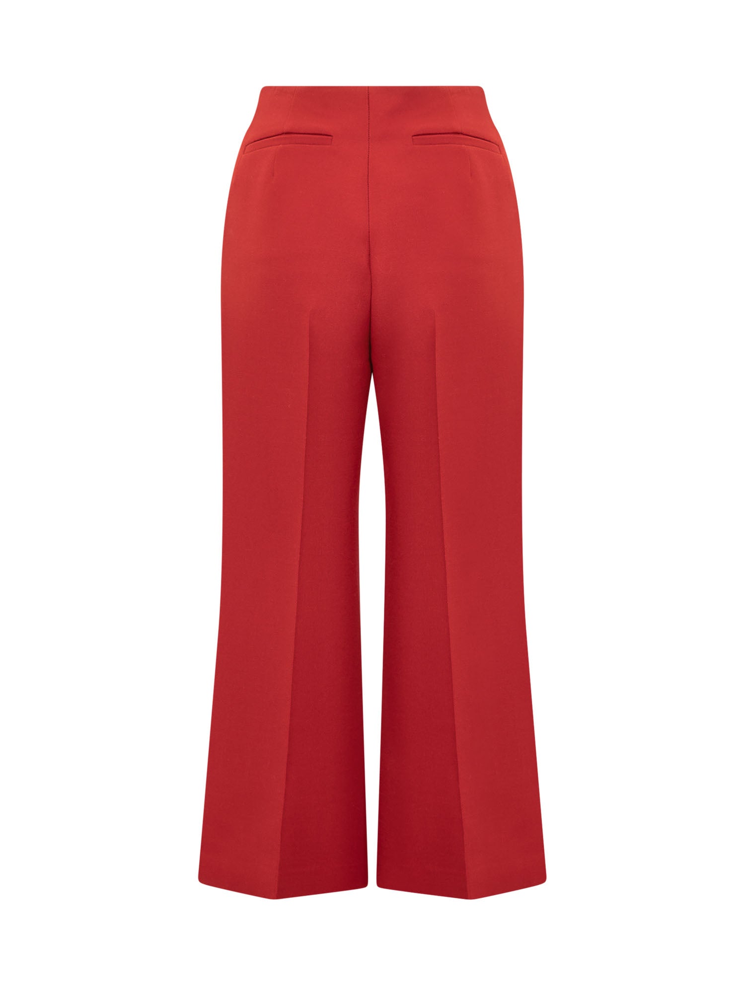 Long red trousers. Flared bottom. Back pockets. Zip and hook closure.