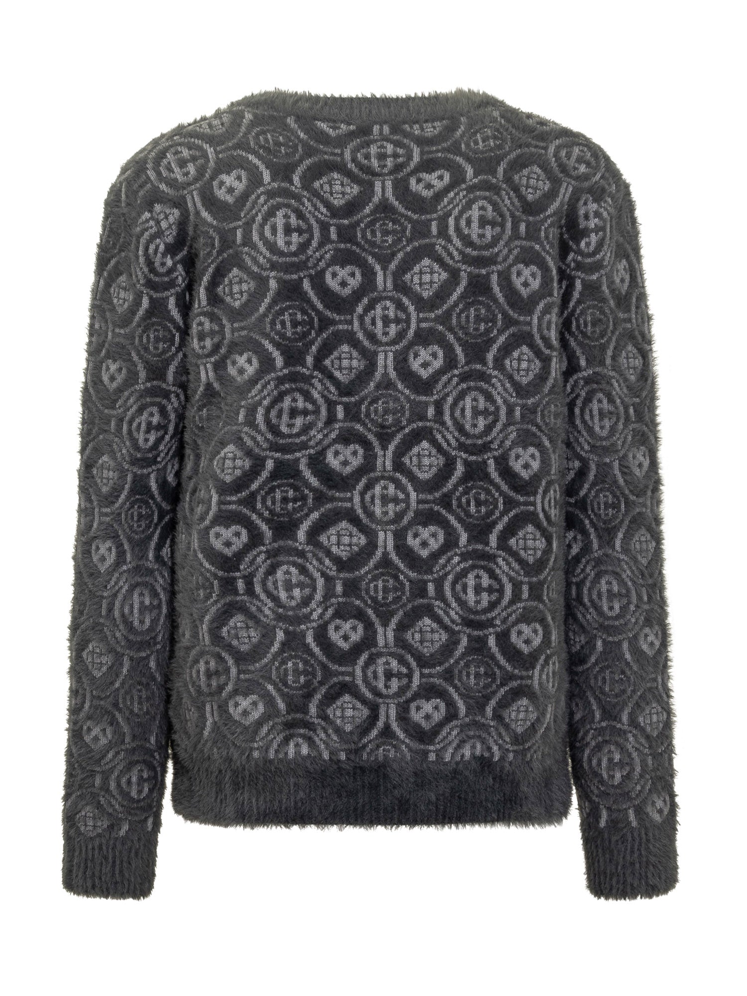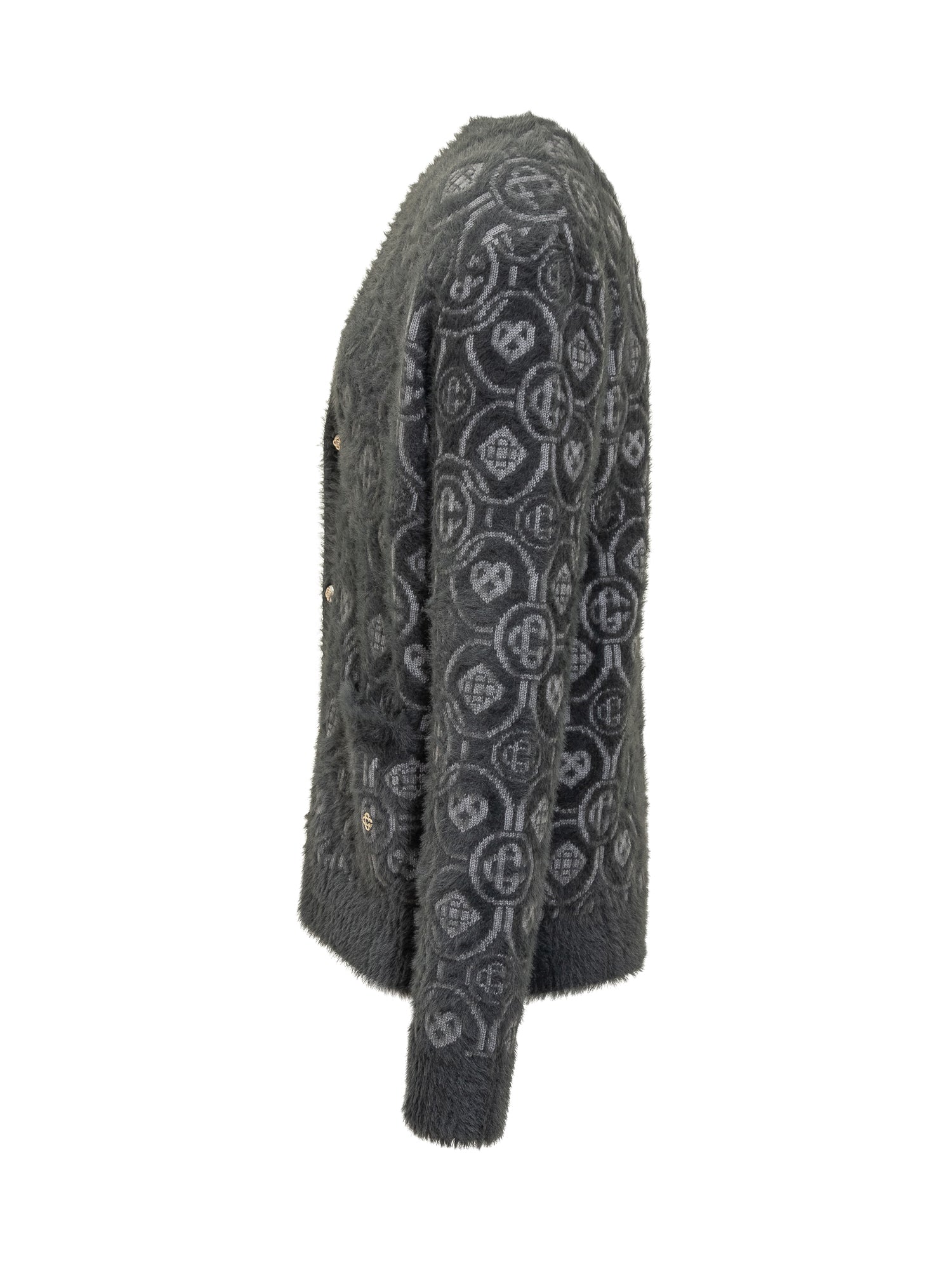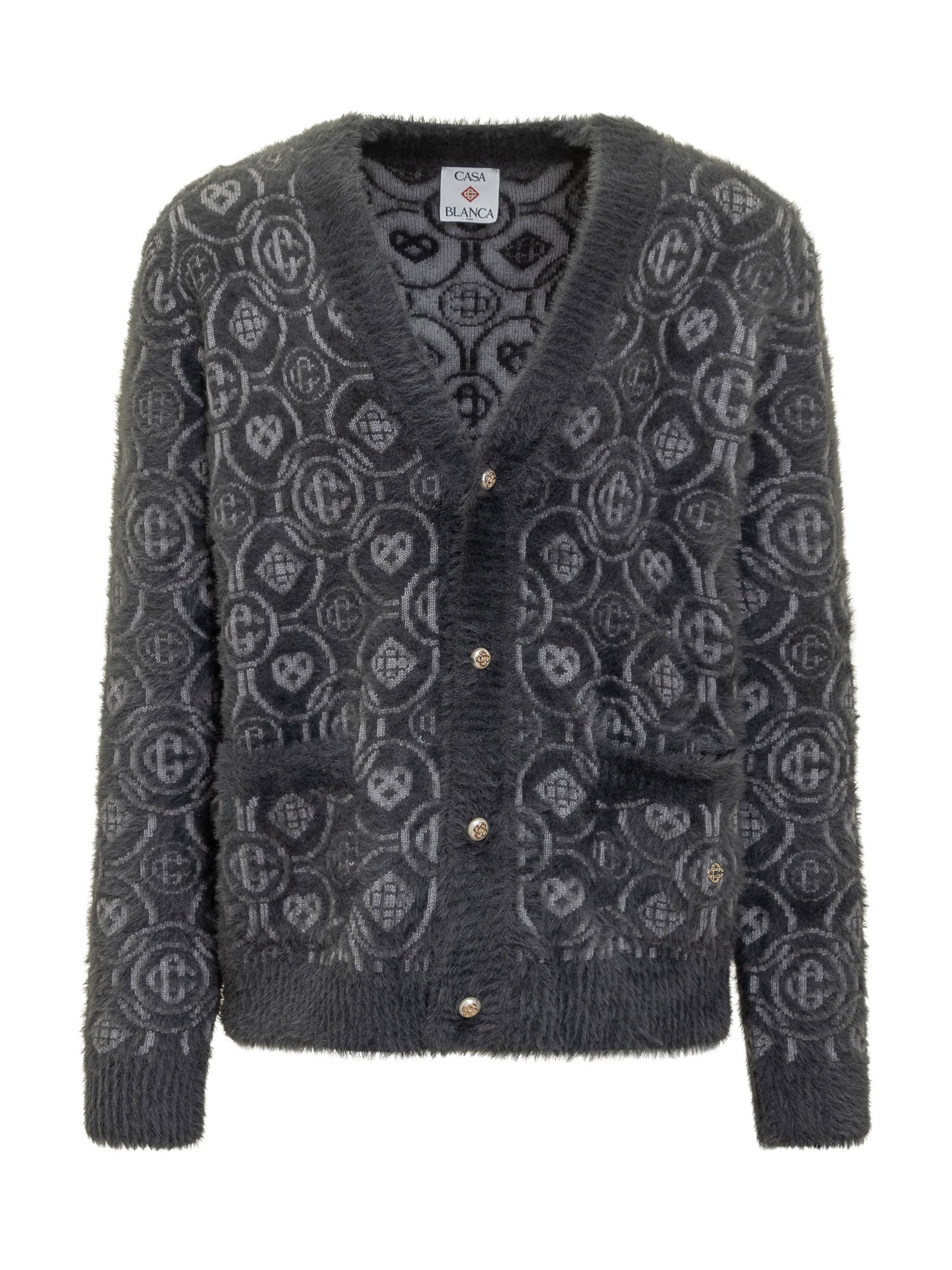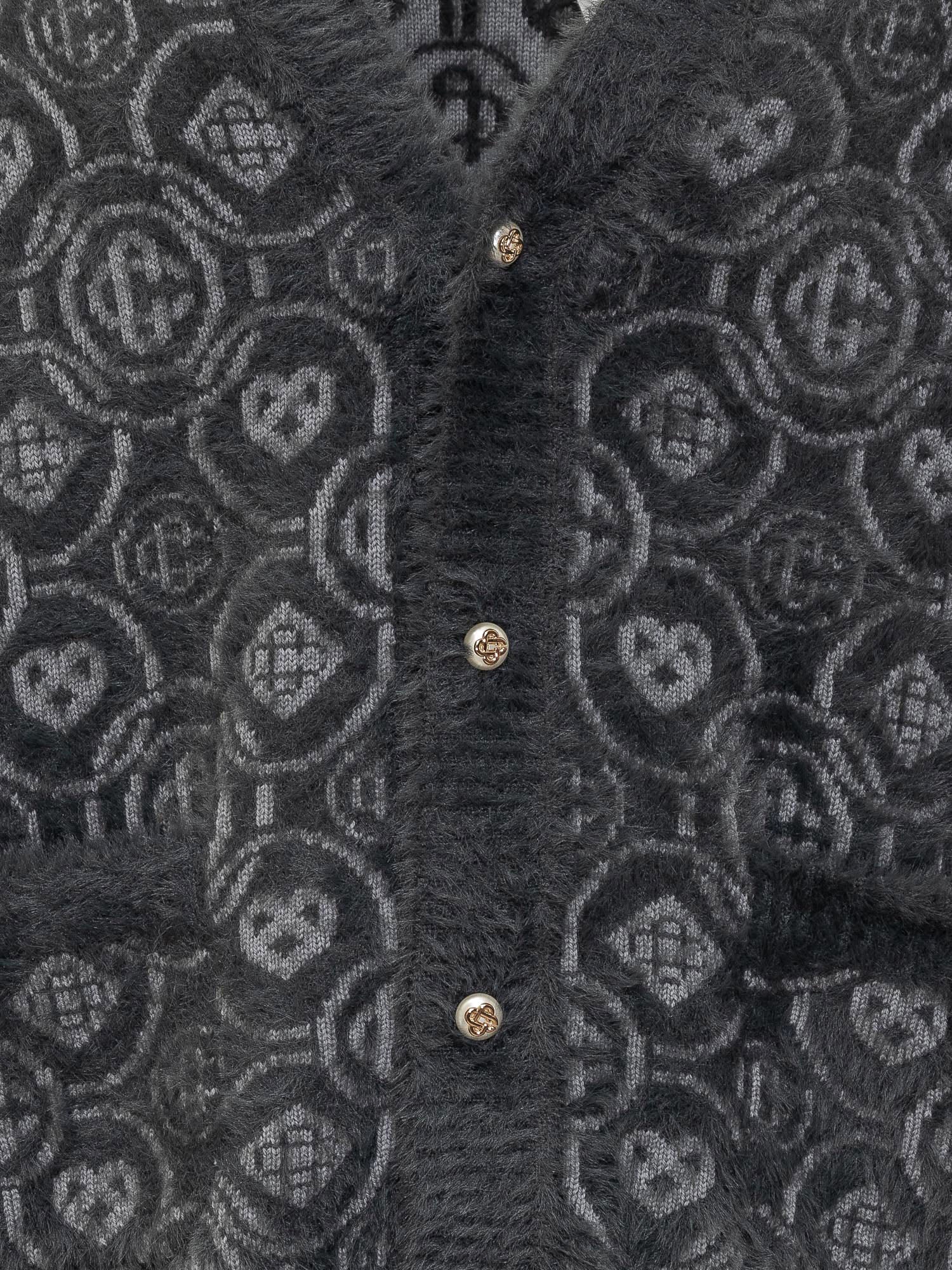 Casablanca wool cardigan with grey monogram pattern and front buttons. Soft texture and refined details.