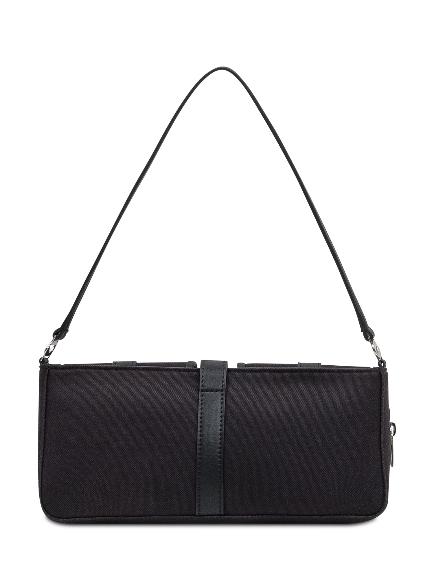 Black shoulder bag in technical fabric with double front pockets and leather details.
