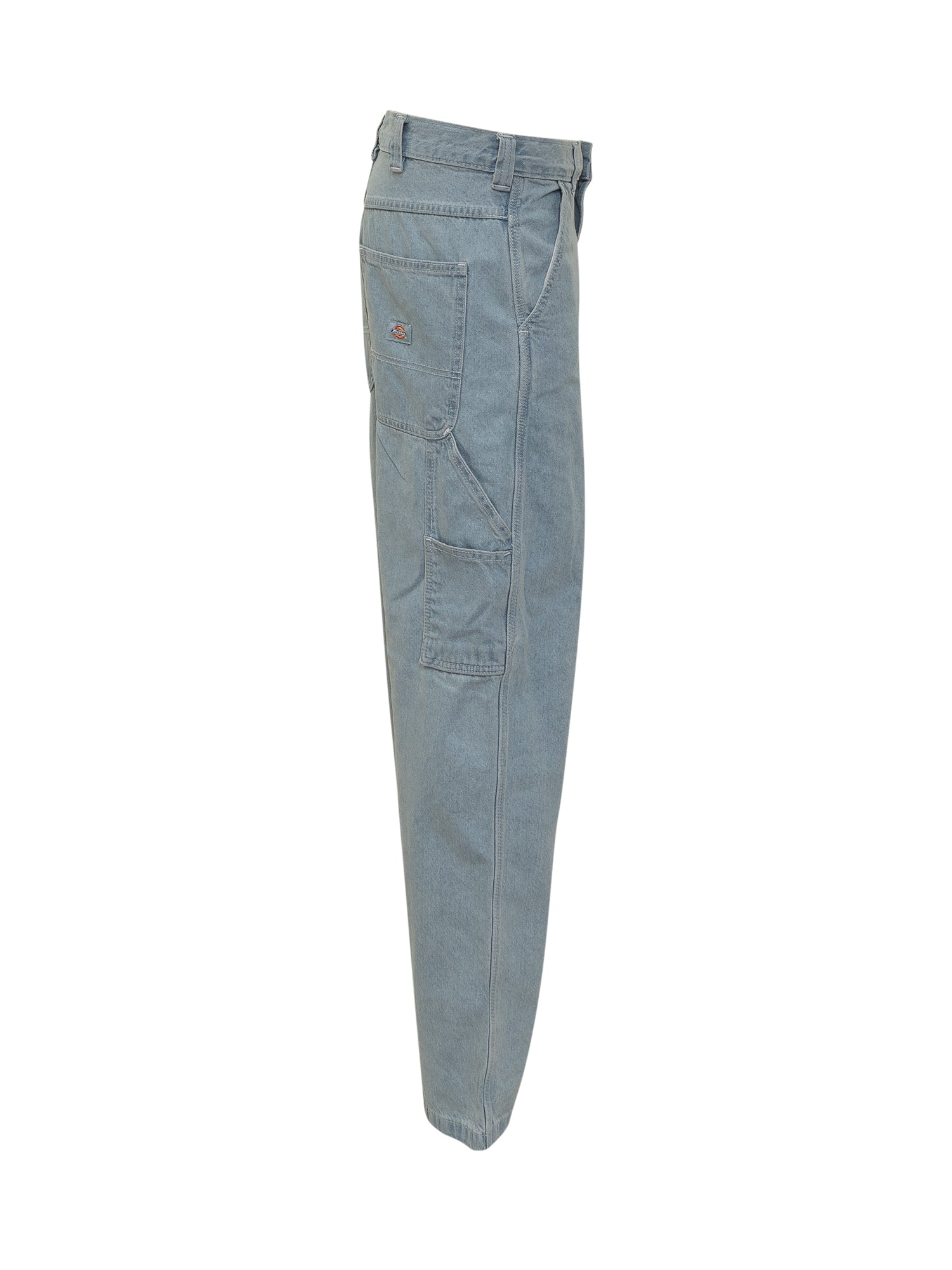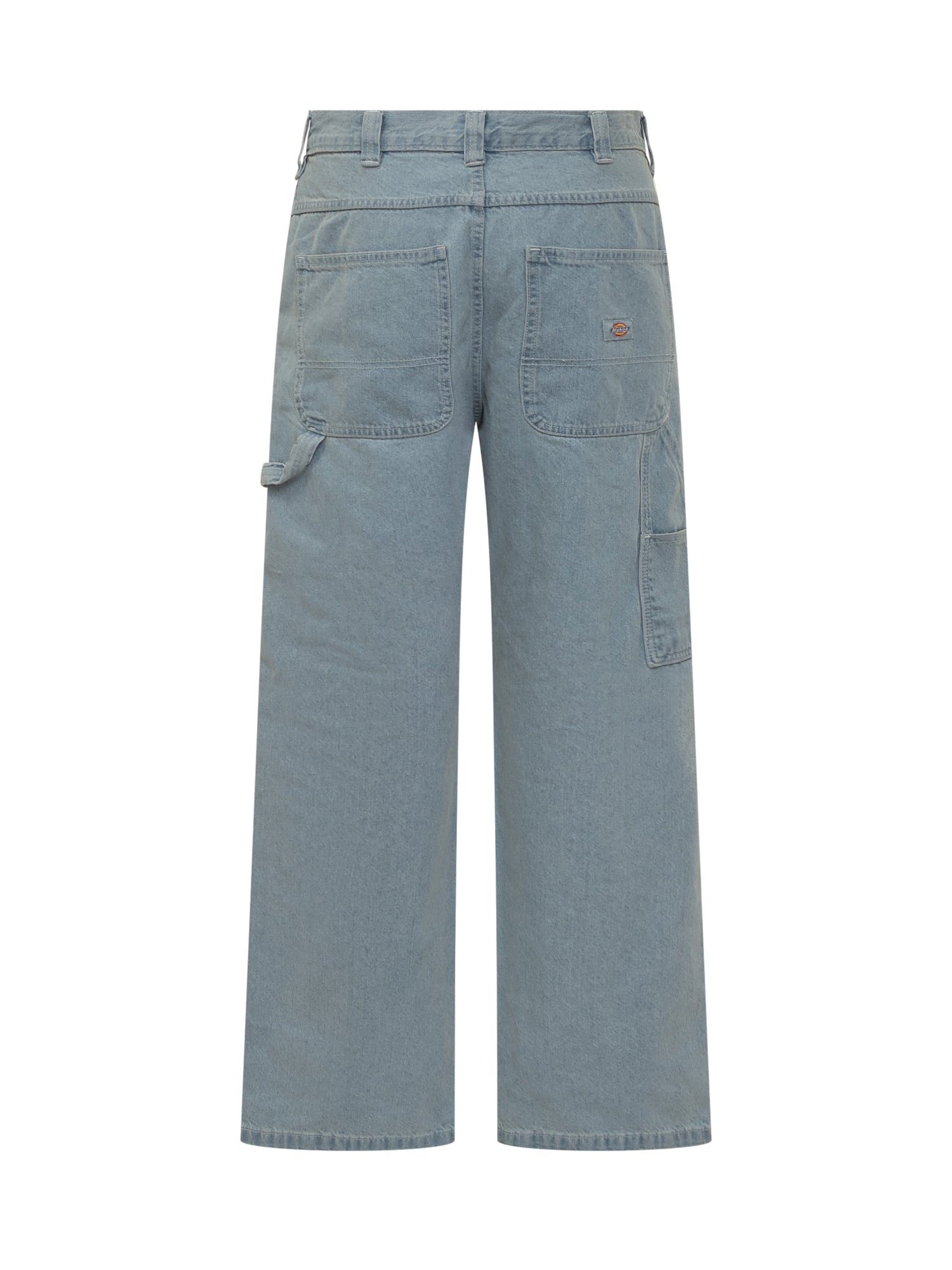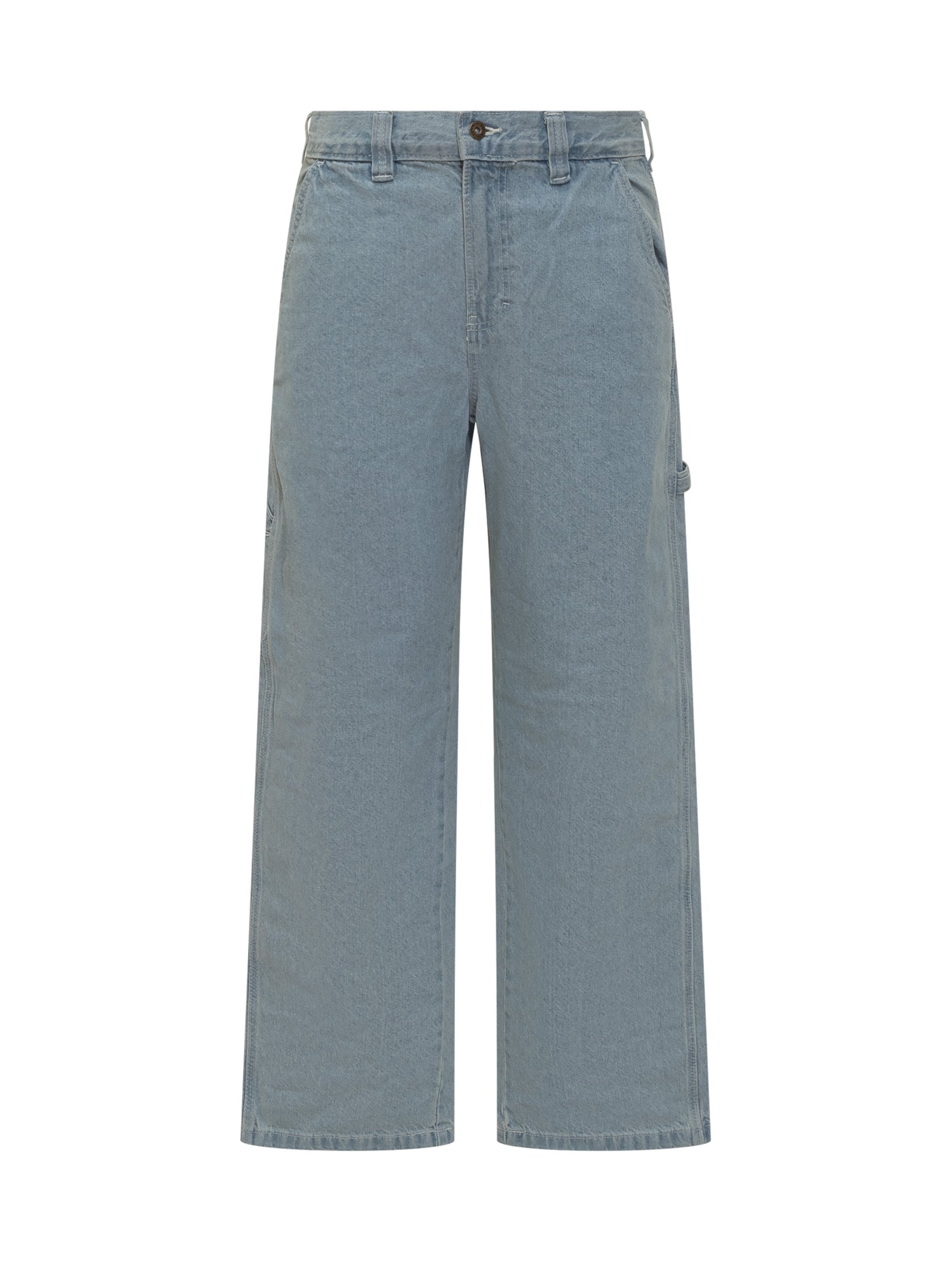Made of durable 368 gsm cotton denim. Wide fit and straight leg. Mid-rise waist. Two open back pockets. Two tool pockets. Hammer loop. Button and zipper closure.