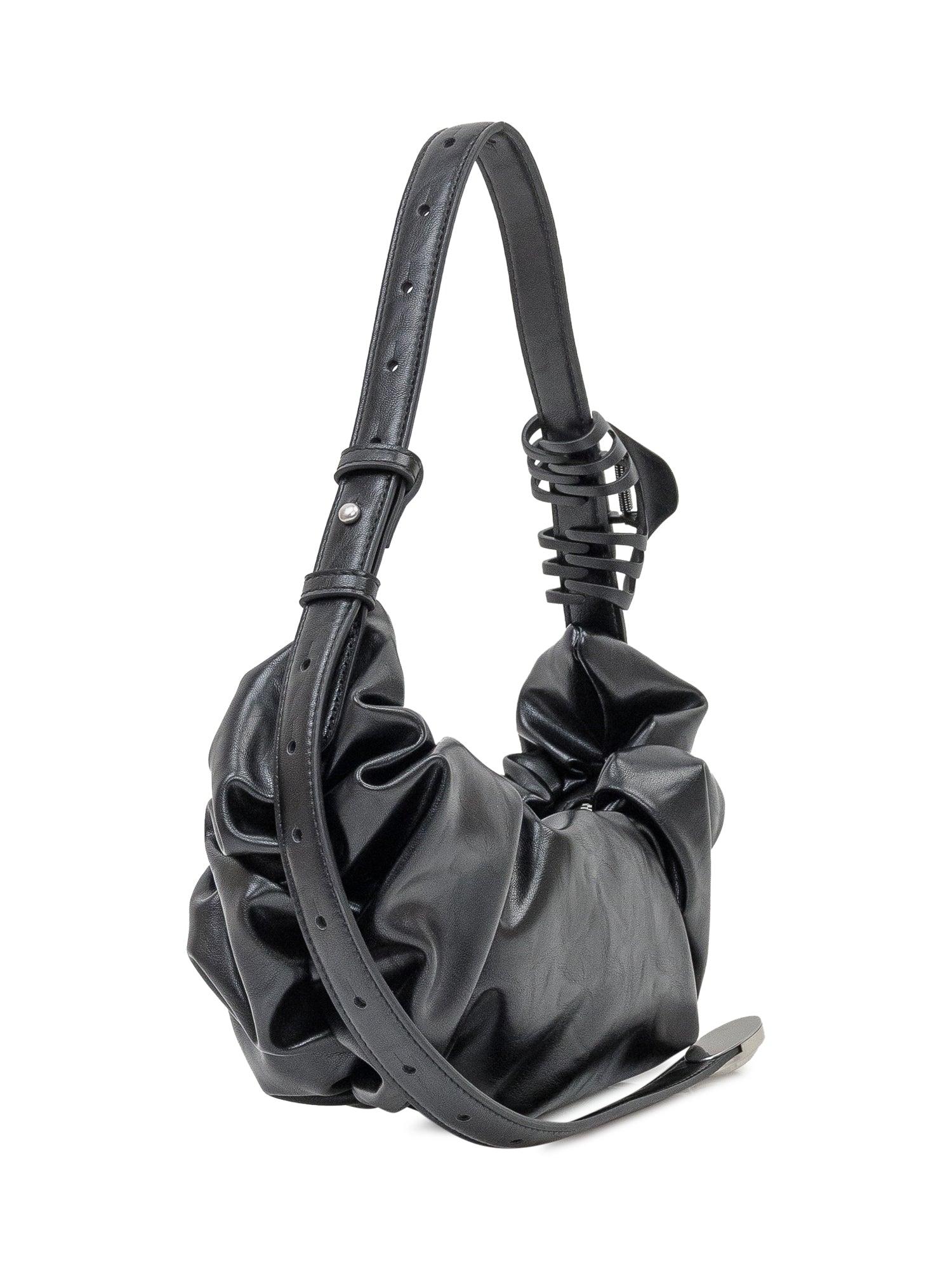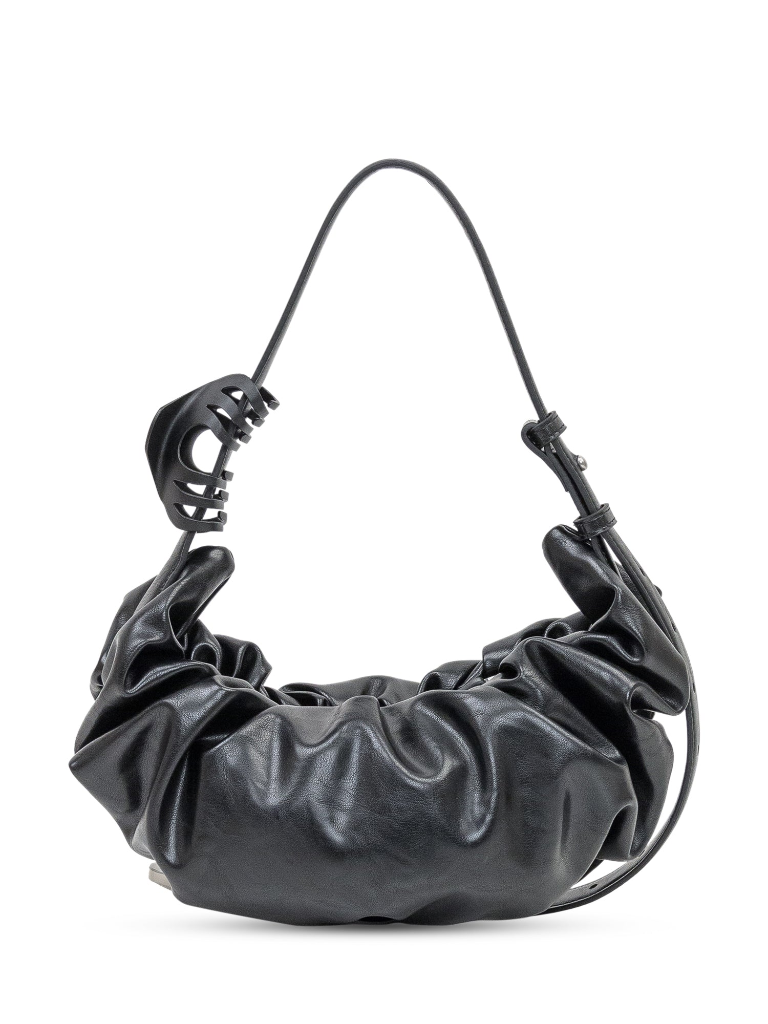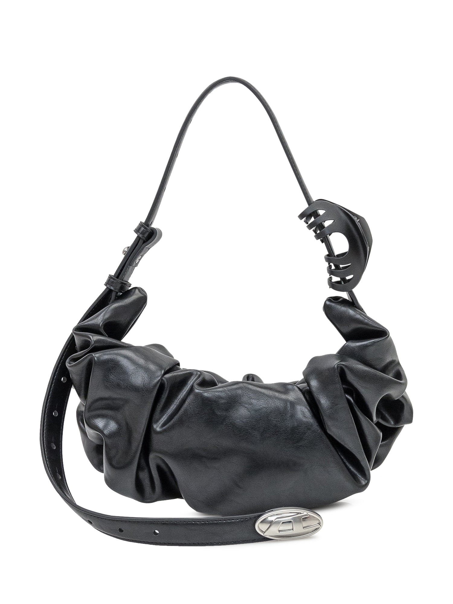 Diesel black leather shoulder bag with draped design and soft silhouette. Featuring distinctive metal logo and zip closure.