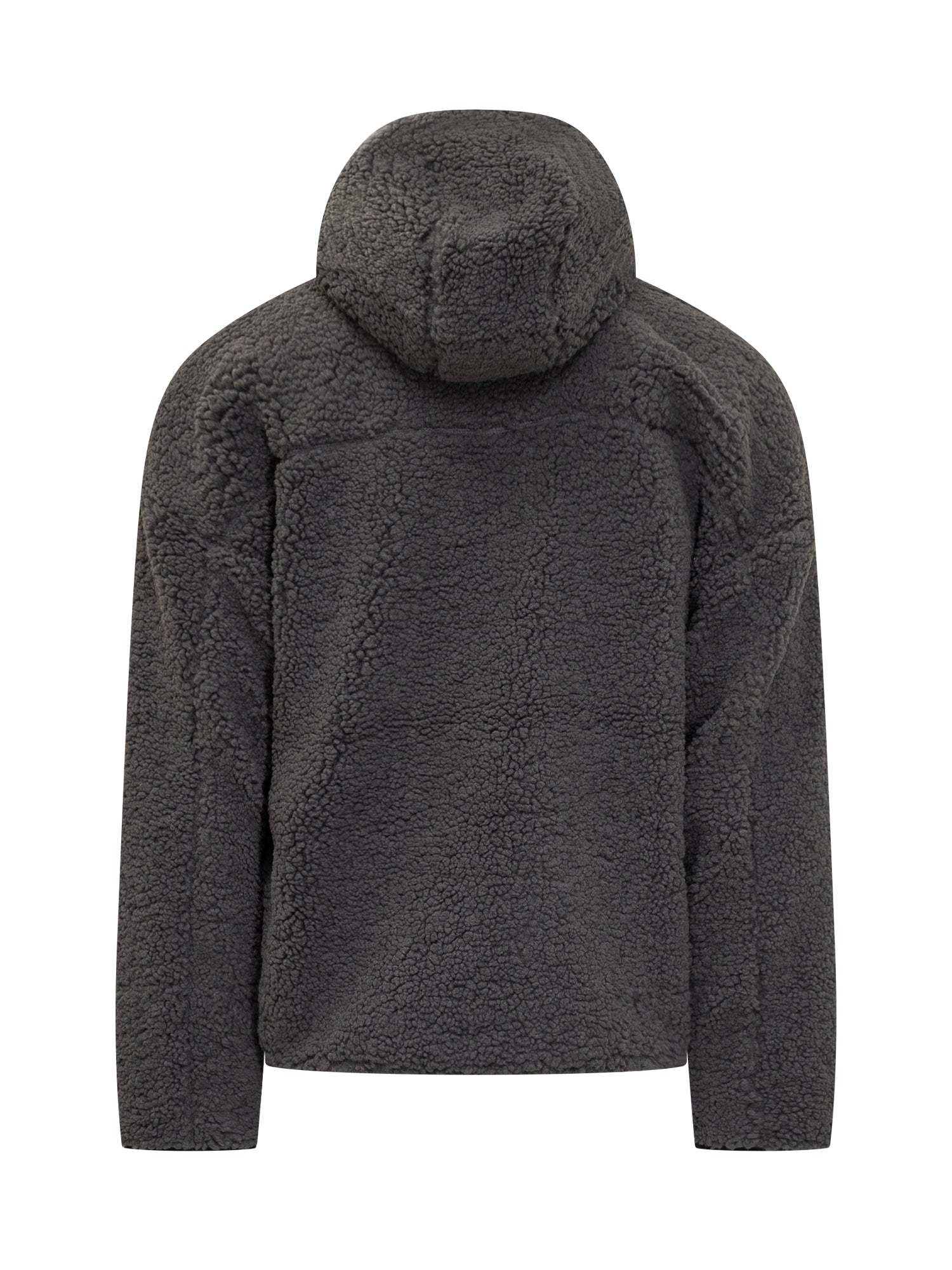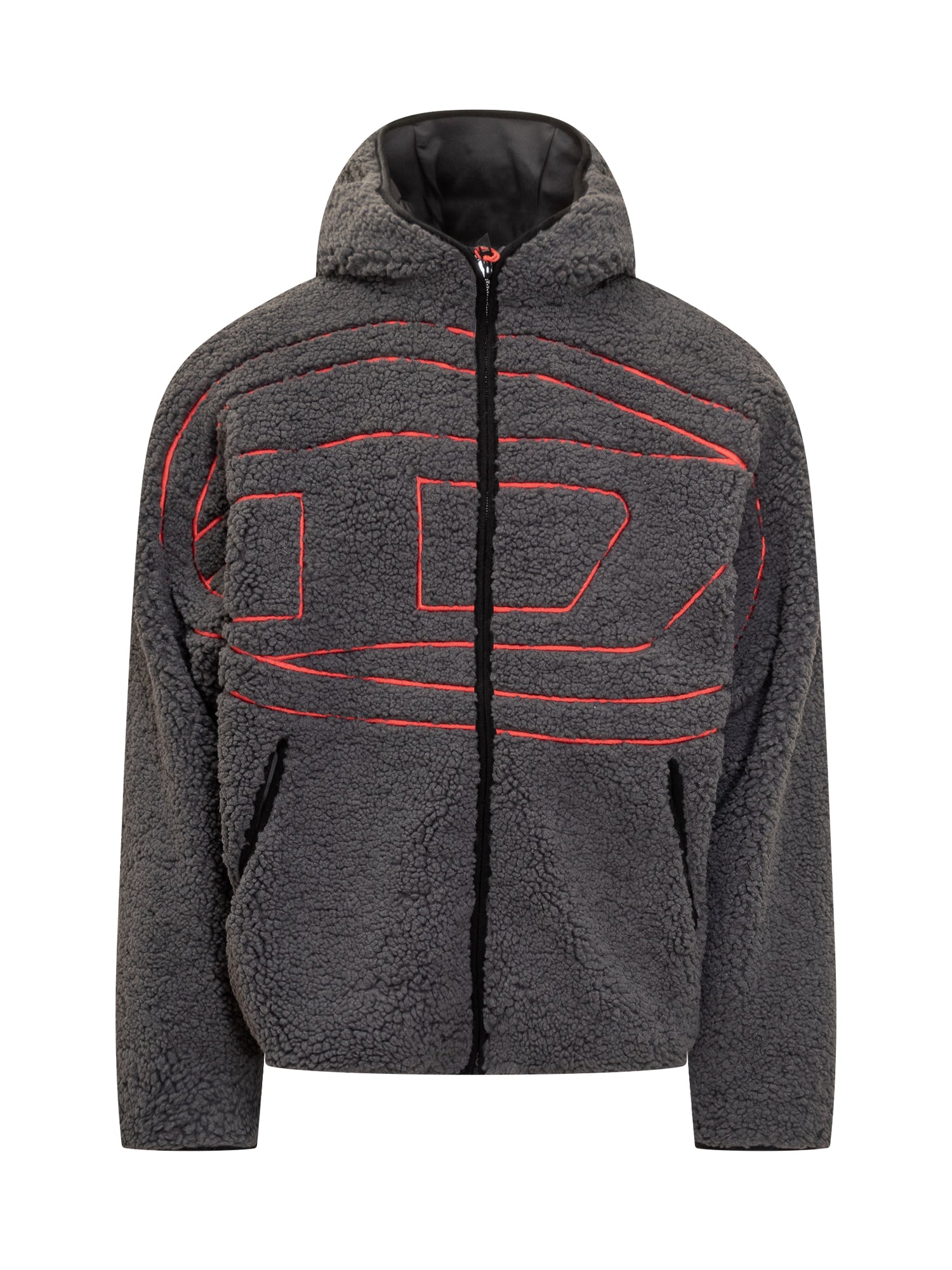 Grey teddy jacket with full zip, hood and embossed Diesel logo in red.