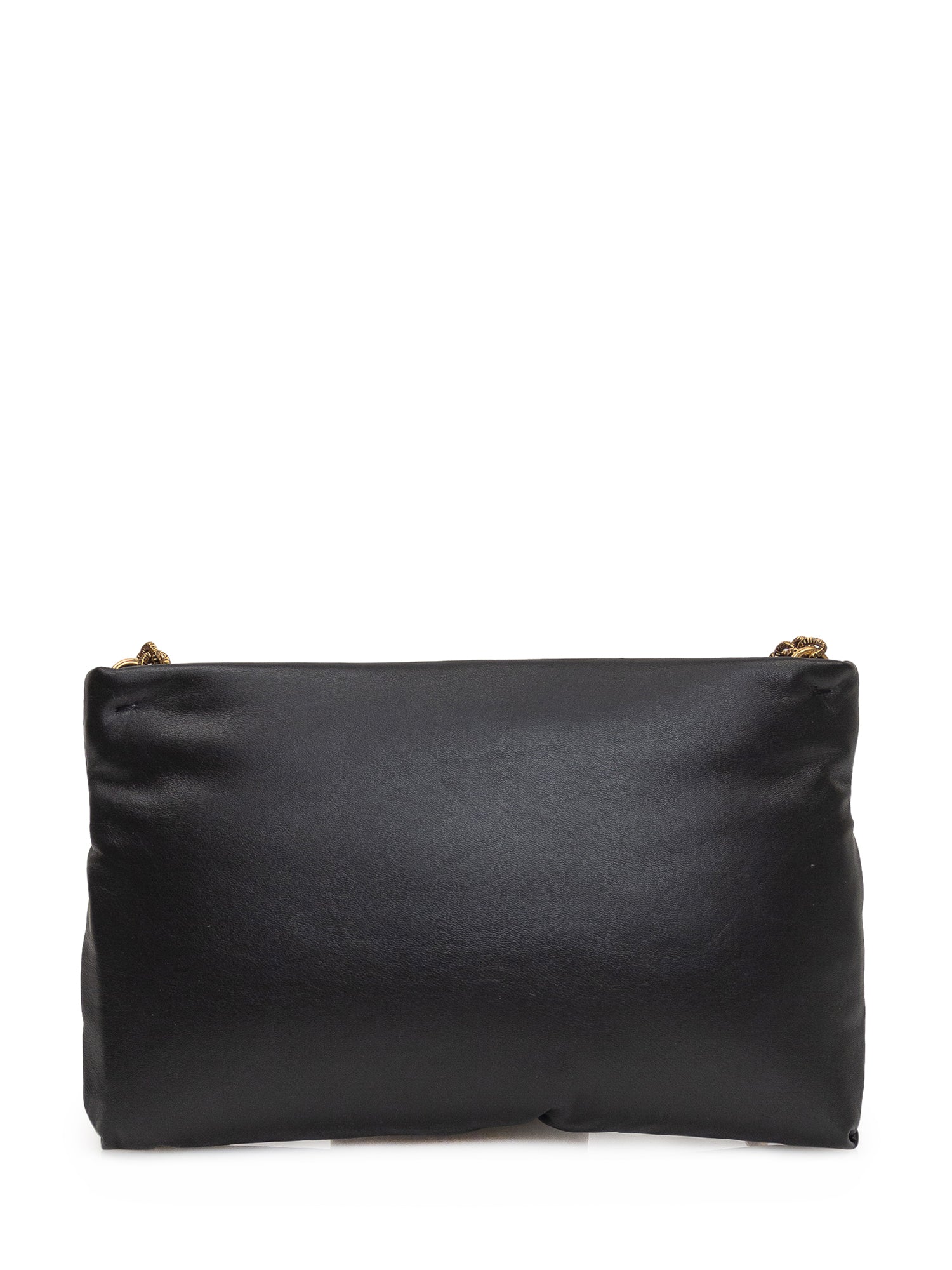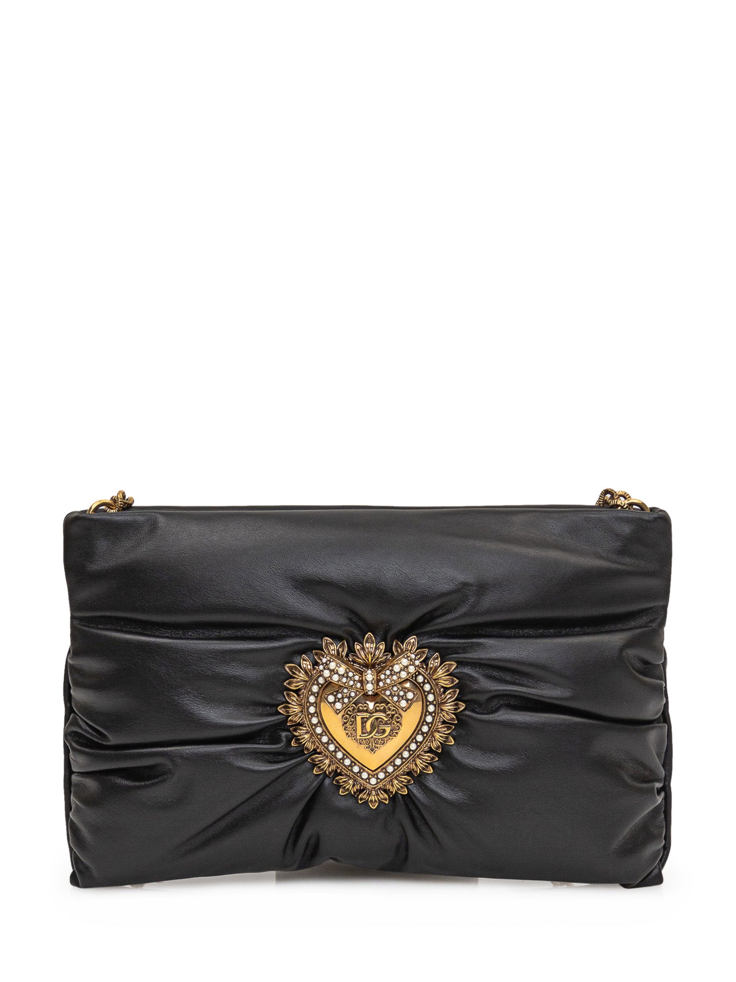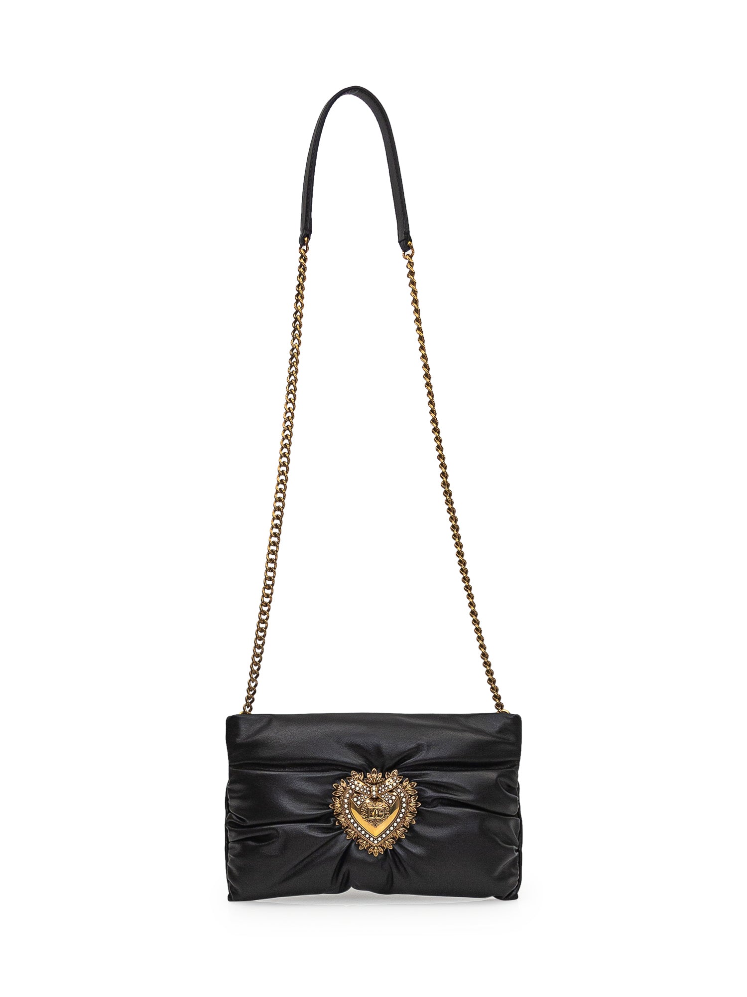 Black bag chain shoulder strap. Zipper closure. One compartment. Jewel heart with vintage gold finish.