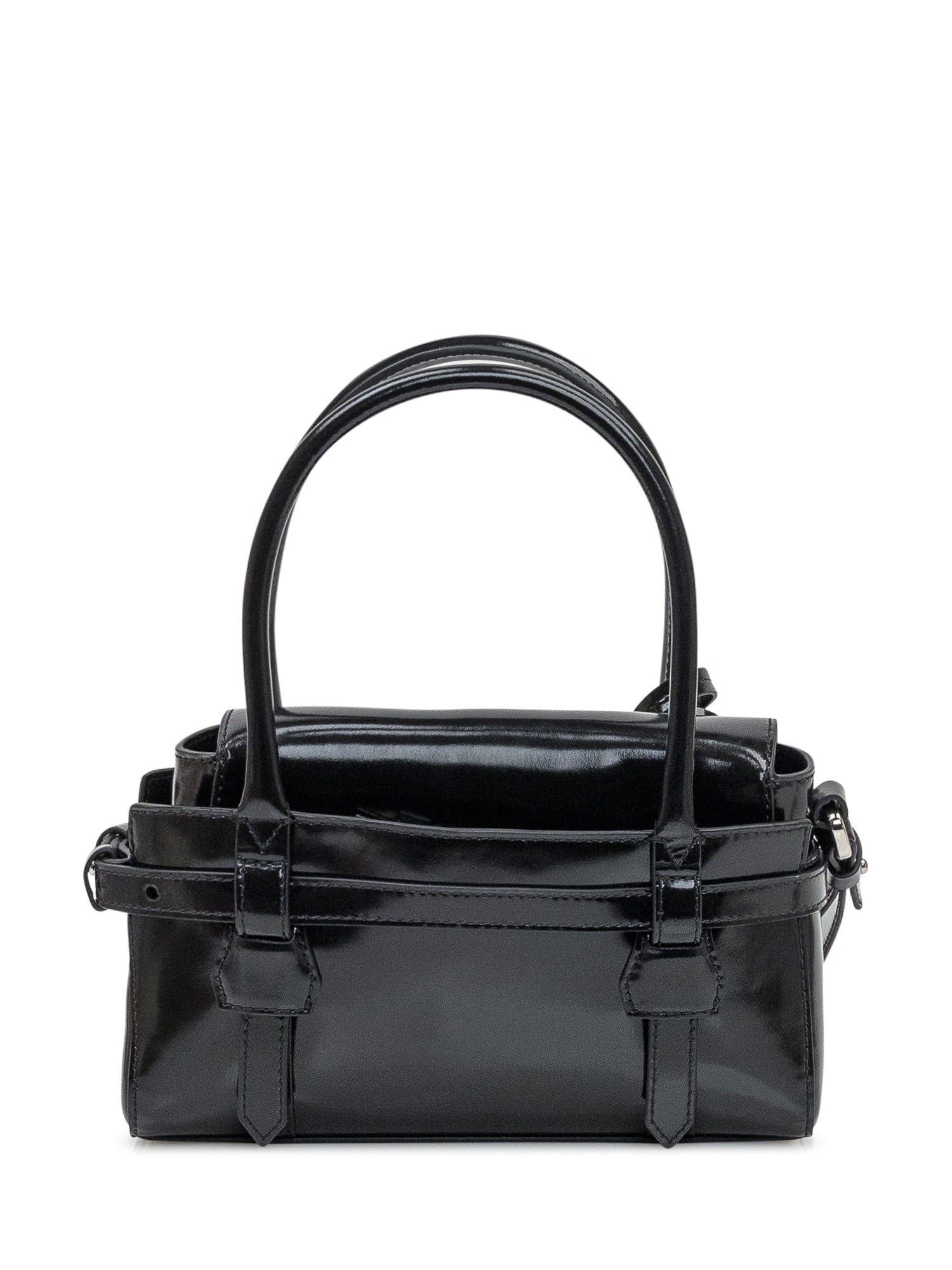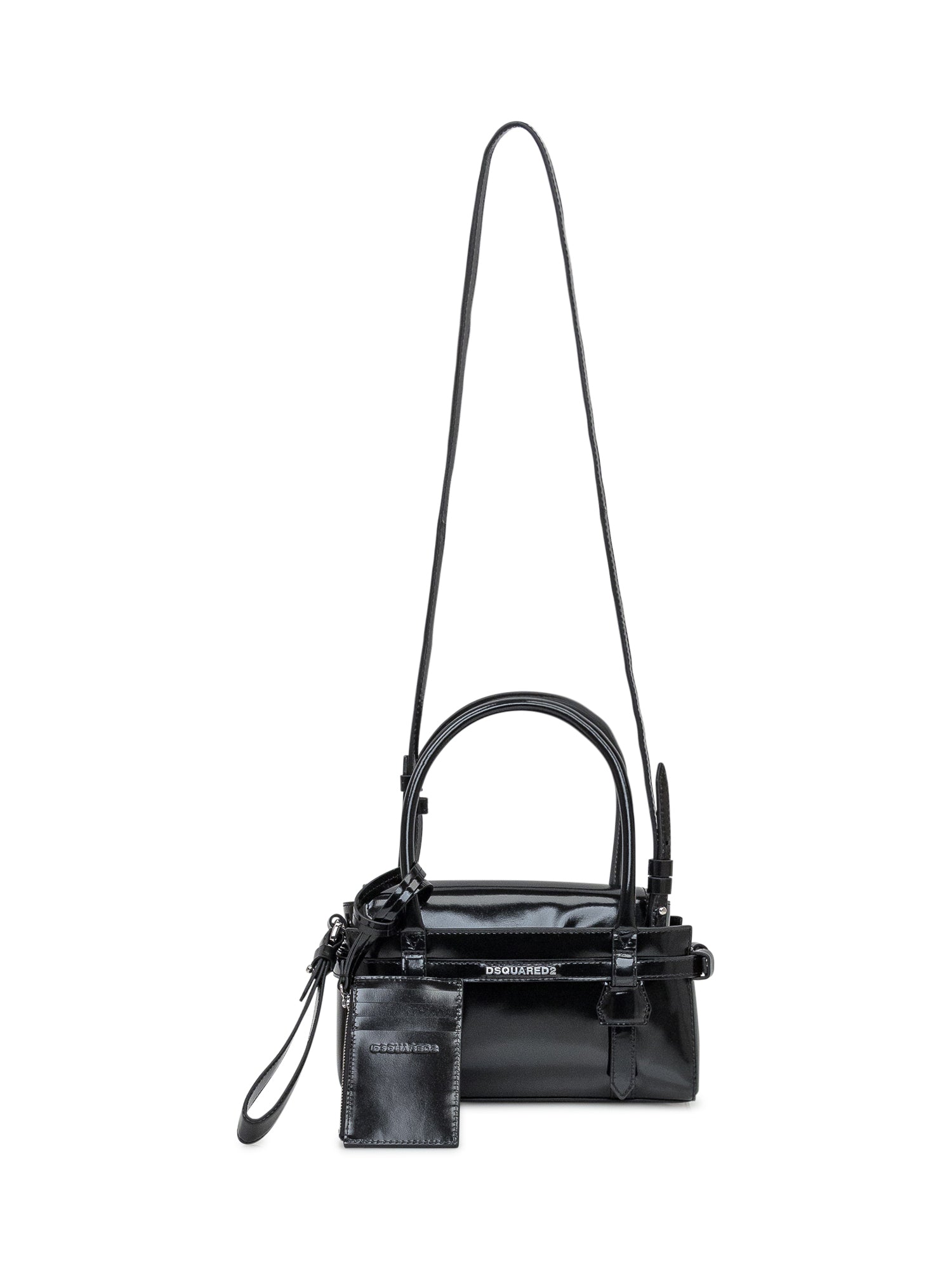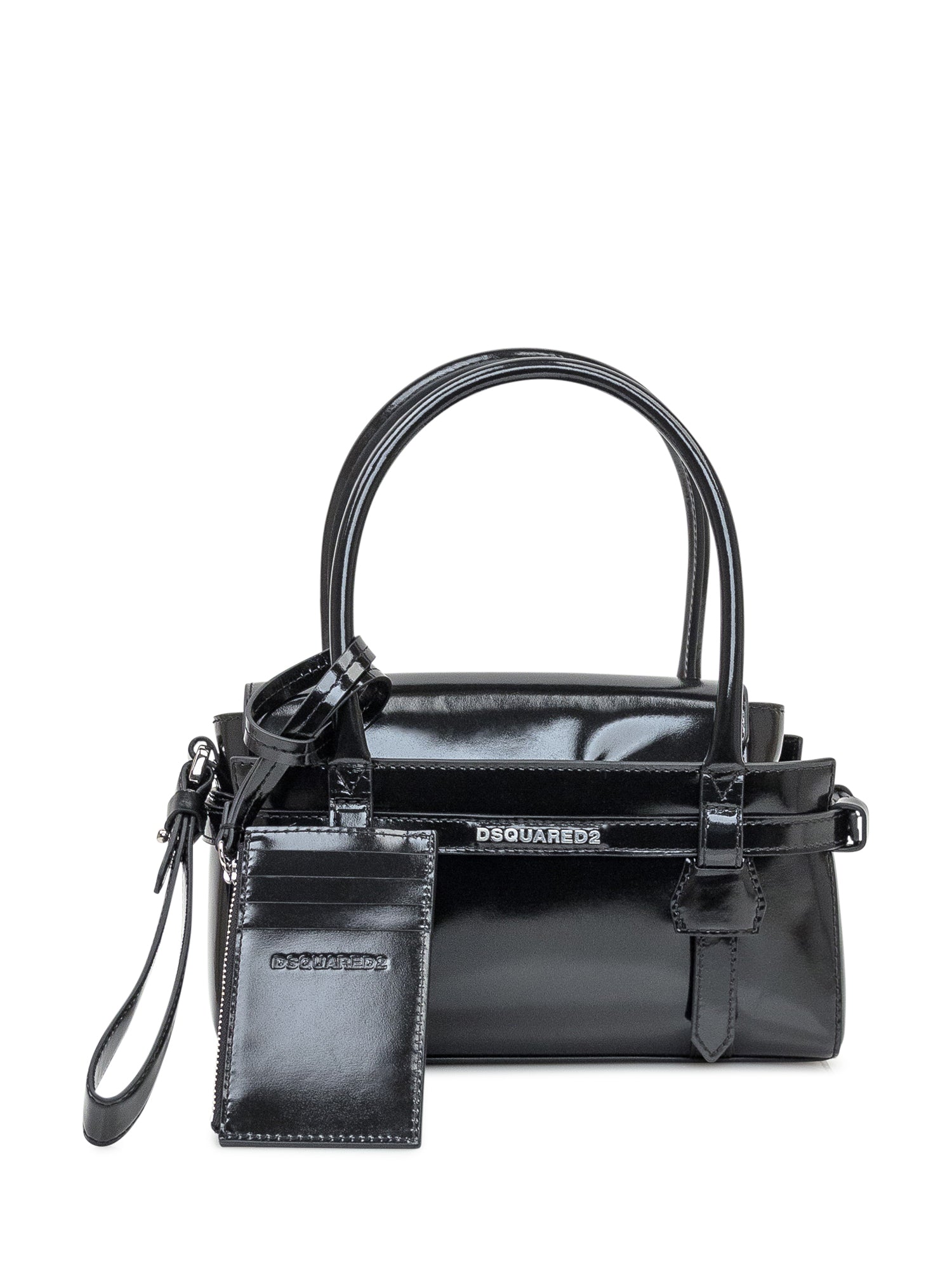 Black Dsquared2 handbag in glossy leather with double handle, side buckle details and matching card holder.