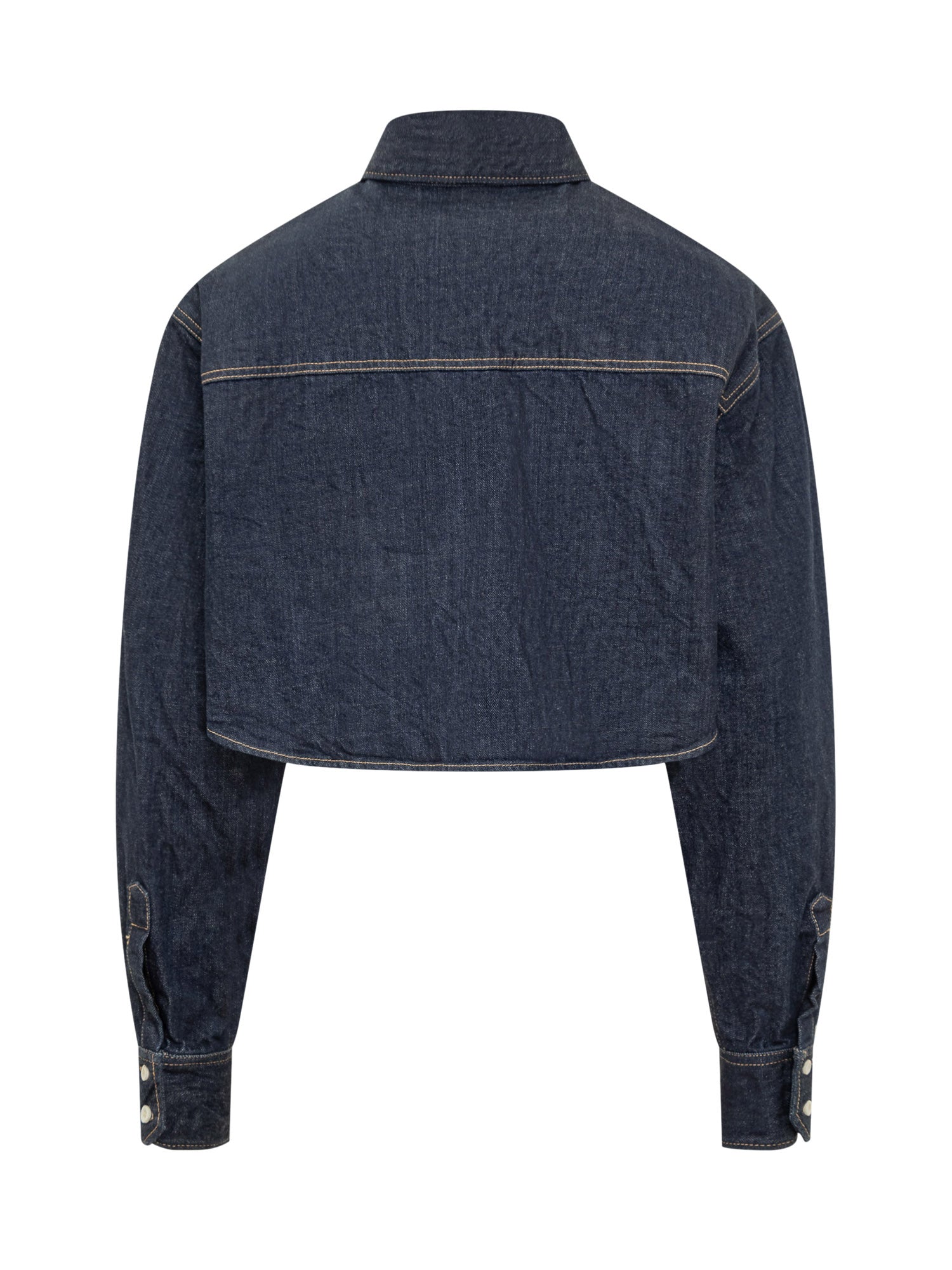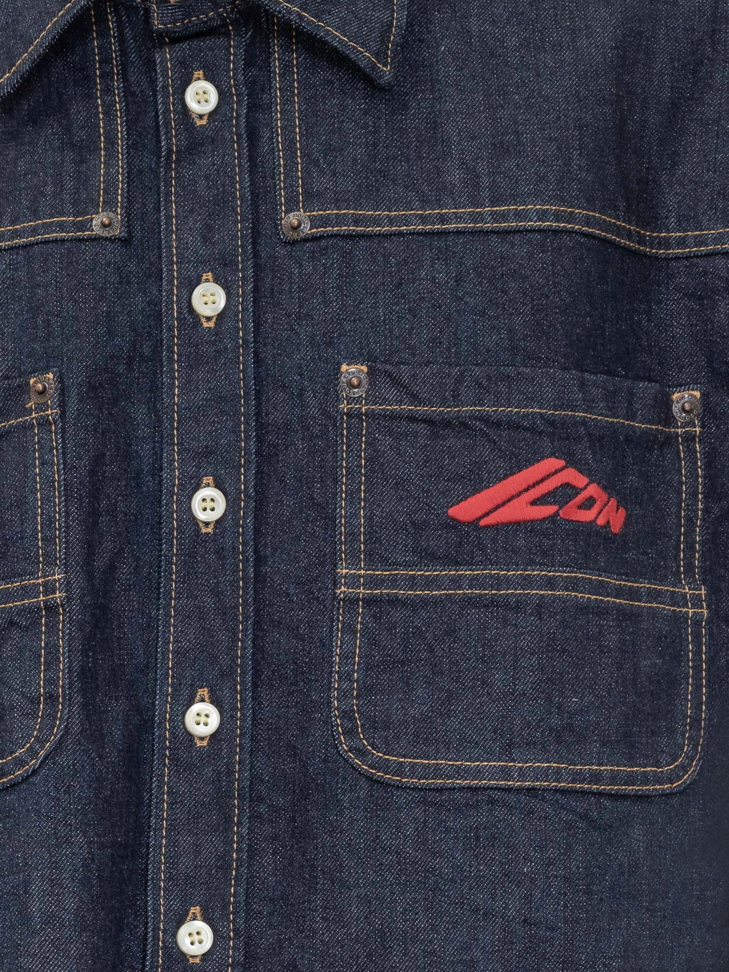 Dsquared2 cropped denim shirt with contrast stitching, patch pockets and embroidered red logo.