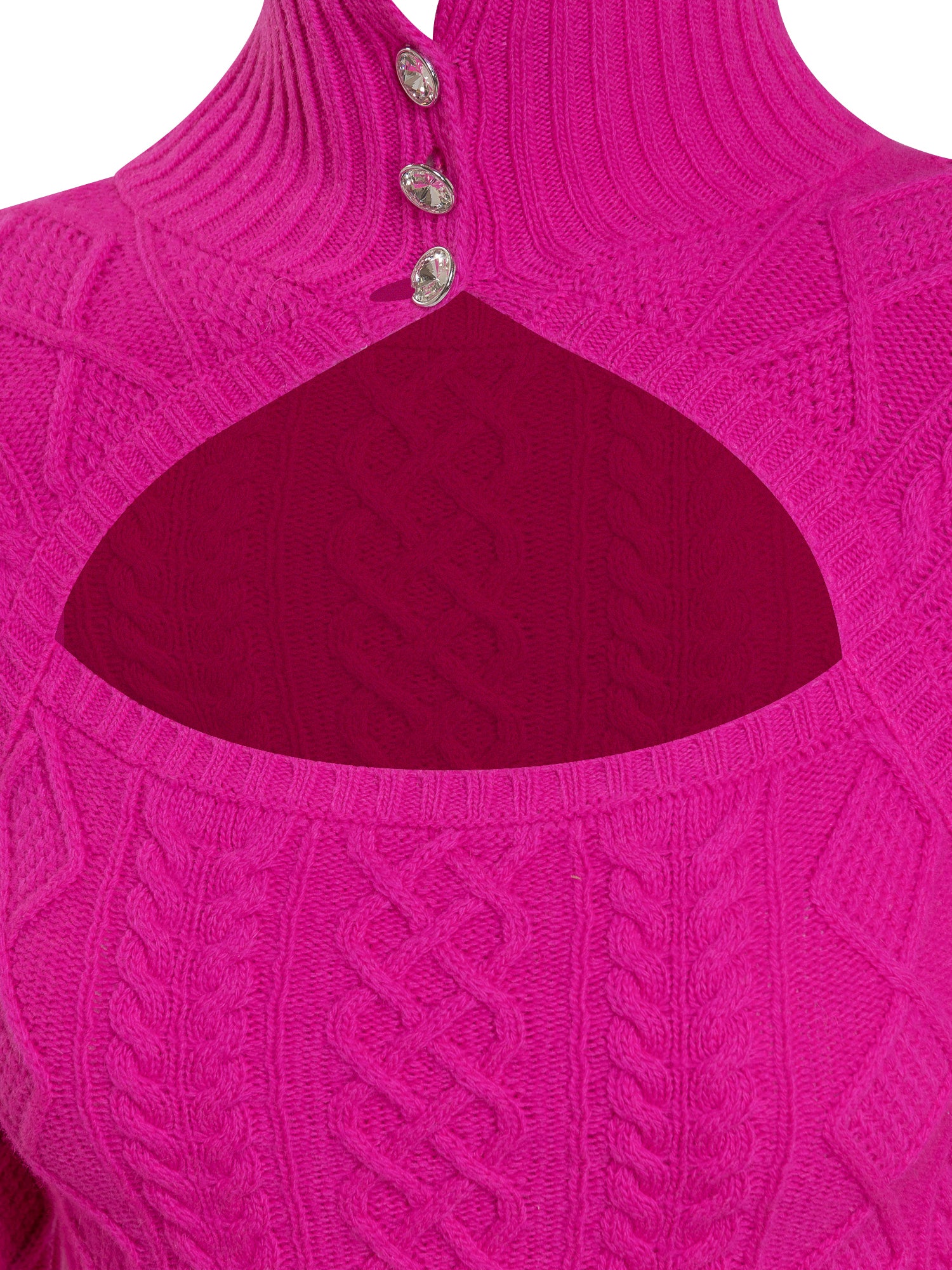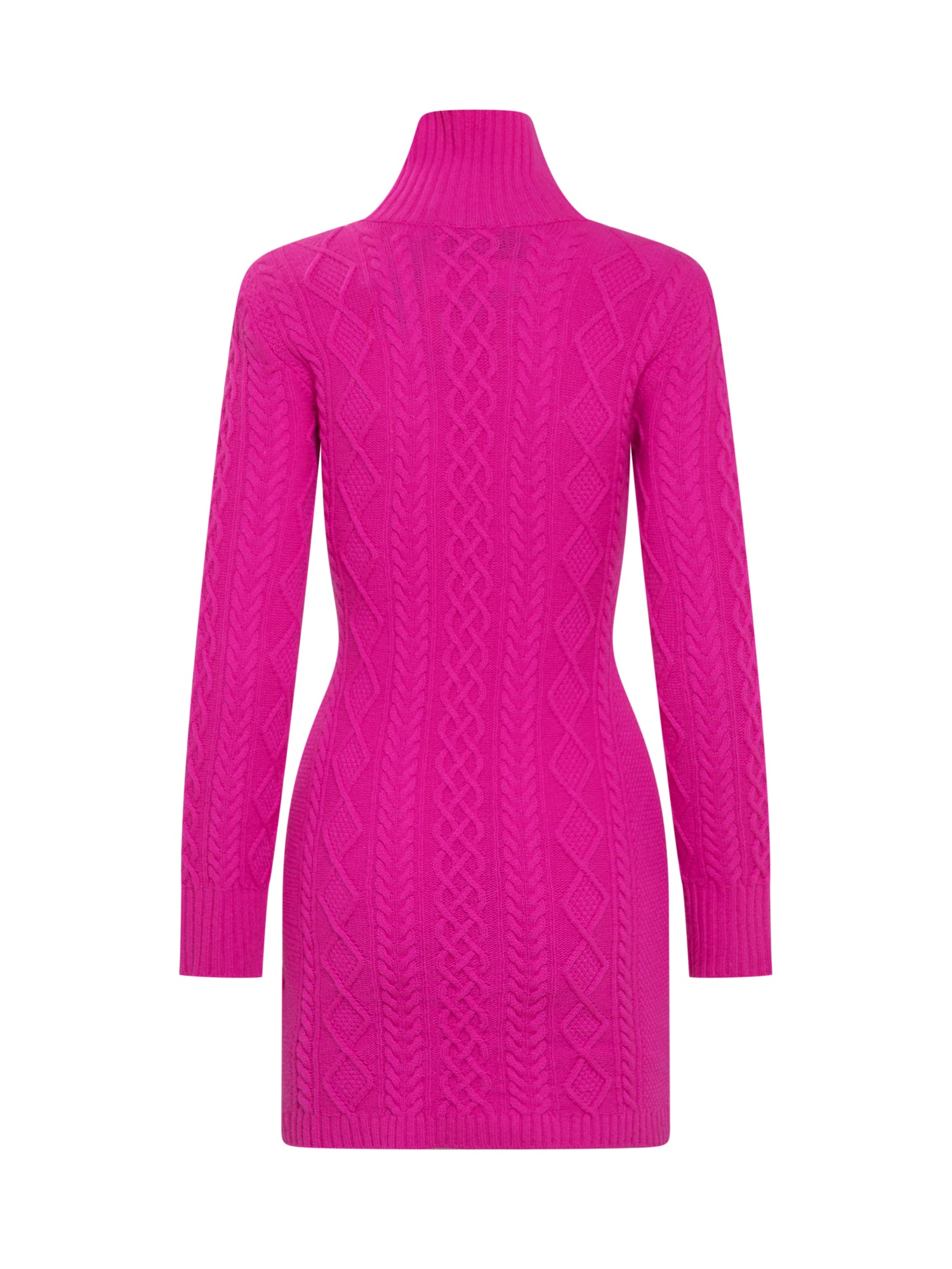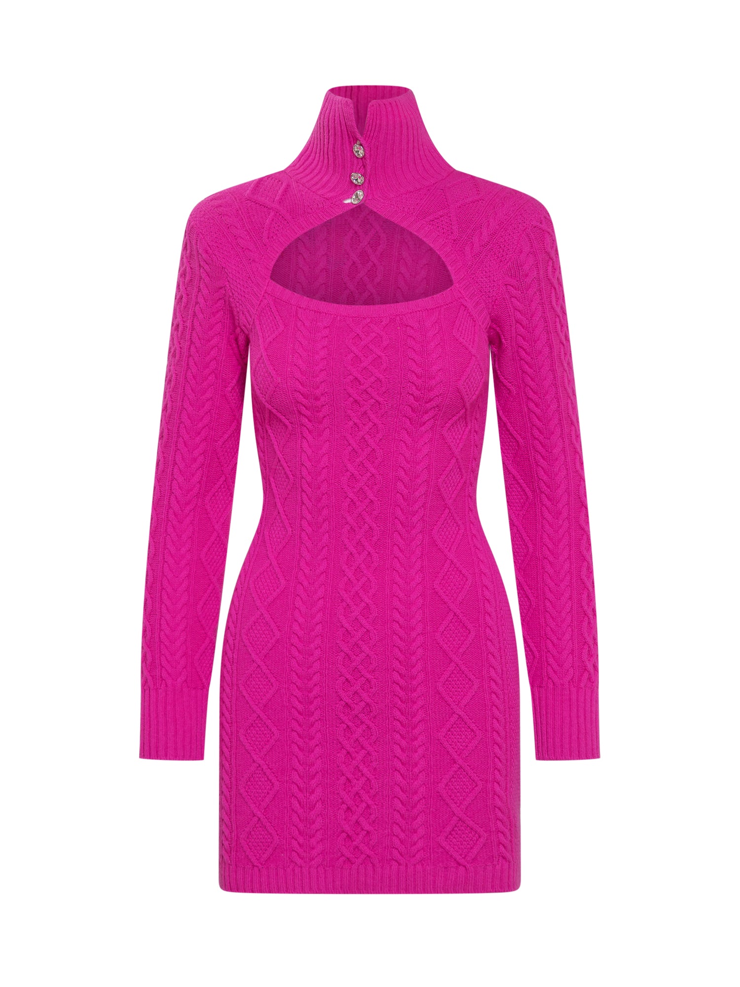 Fuchsia dress with long sleeves. Turtleneck with buttons. Knitting. Cut out on the front. Ribbed edges.