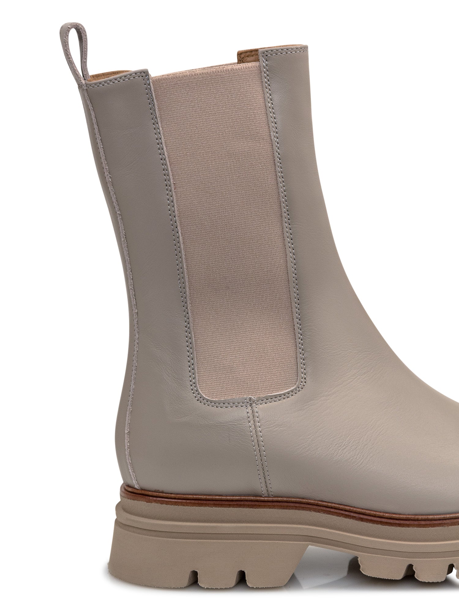 Beige leather boot. Chelsea model. Elastic bands on the sides. Contoured sole.