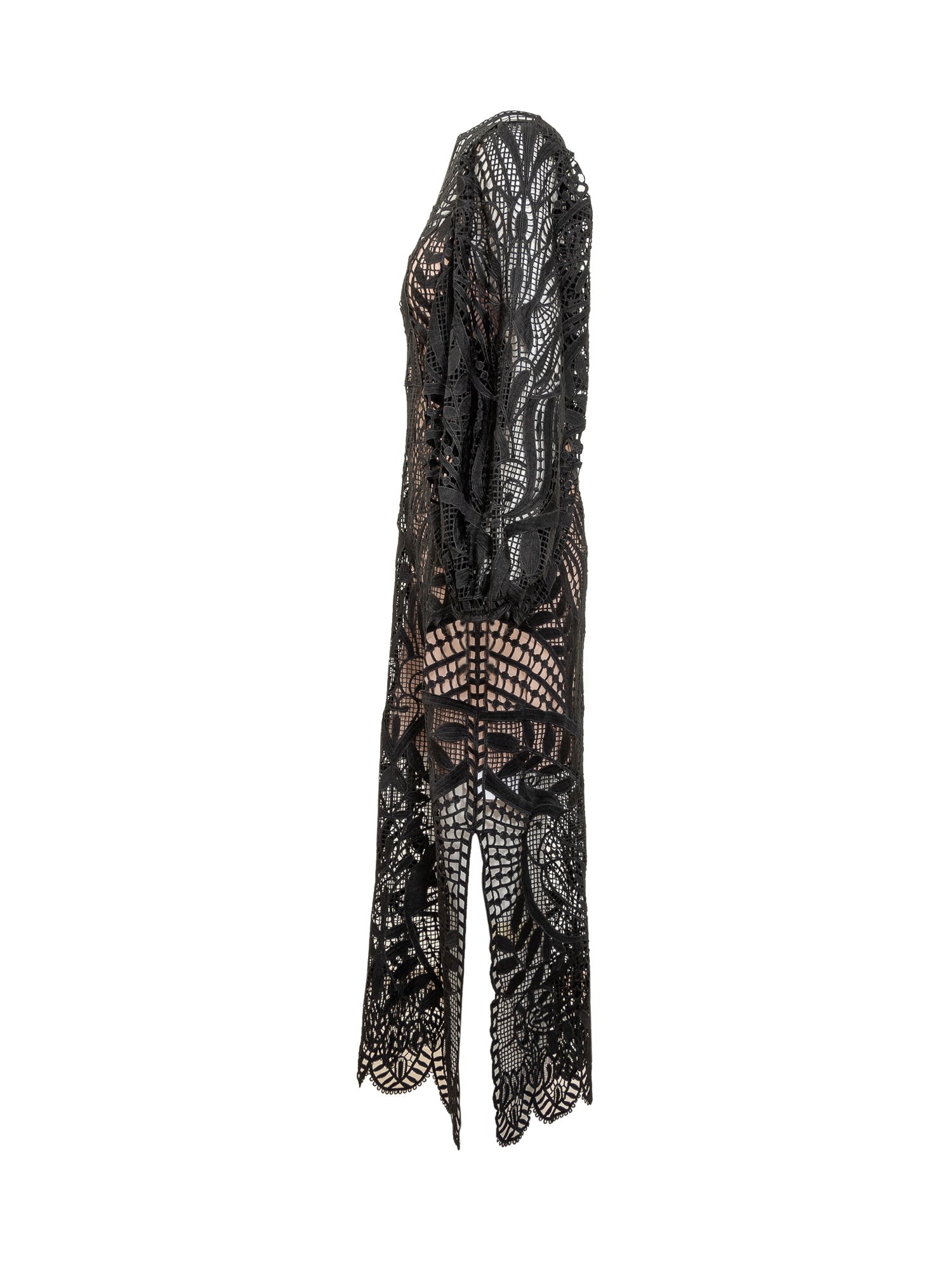 Round neckline. Puff sleeves. Semi-sheer crochet design. Zip closure. Irregular hem. Built-in slip.