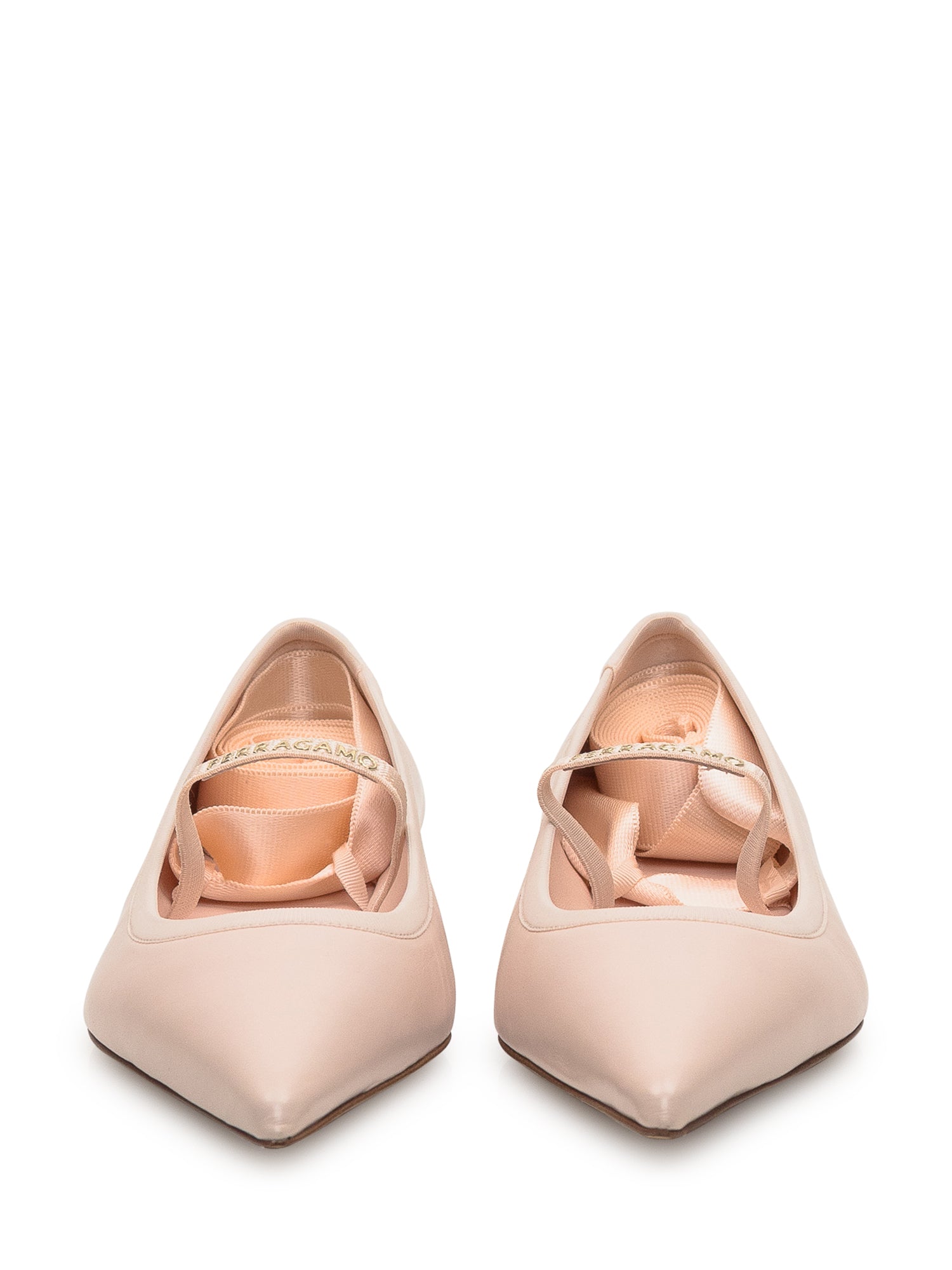 Pink ballerina in leather. Pointed design. Closure with ribbon. Embroidered logo.