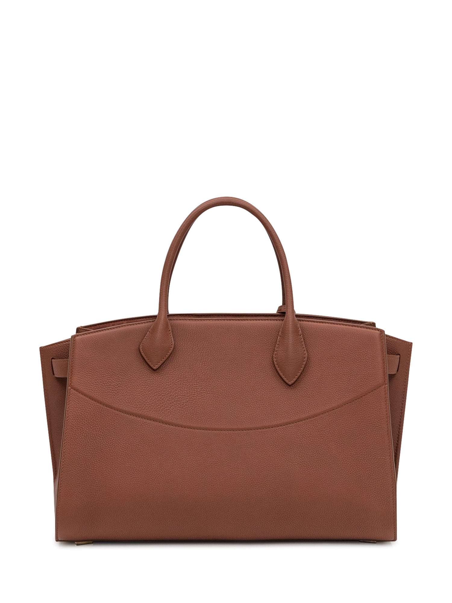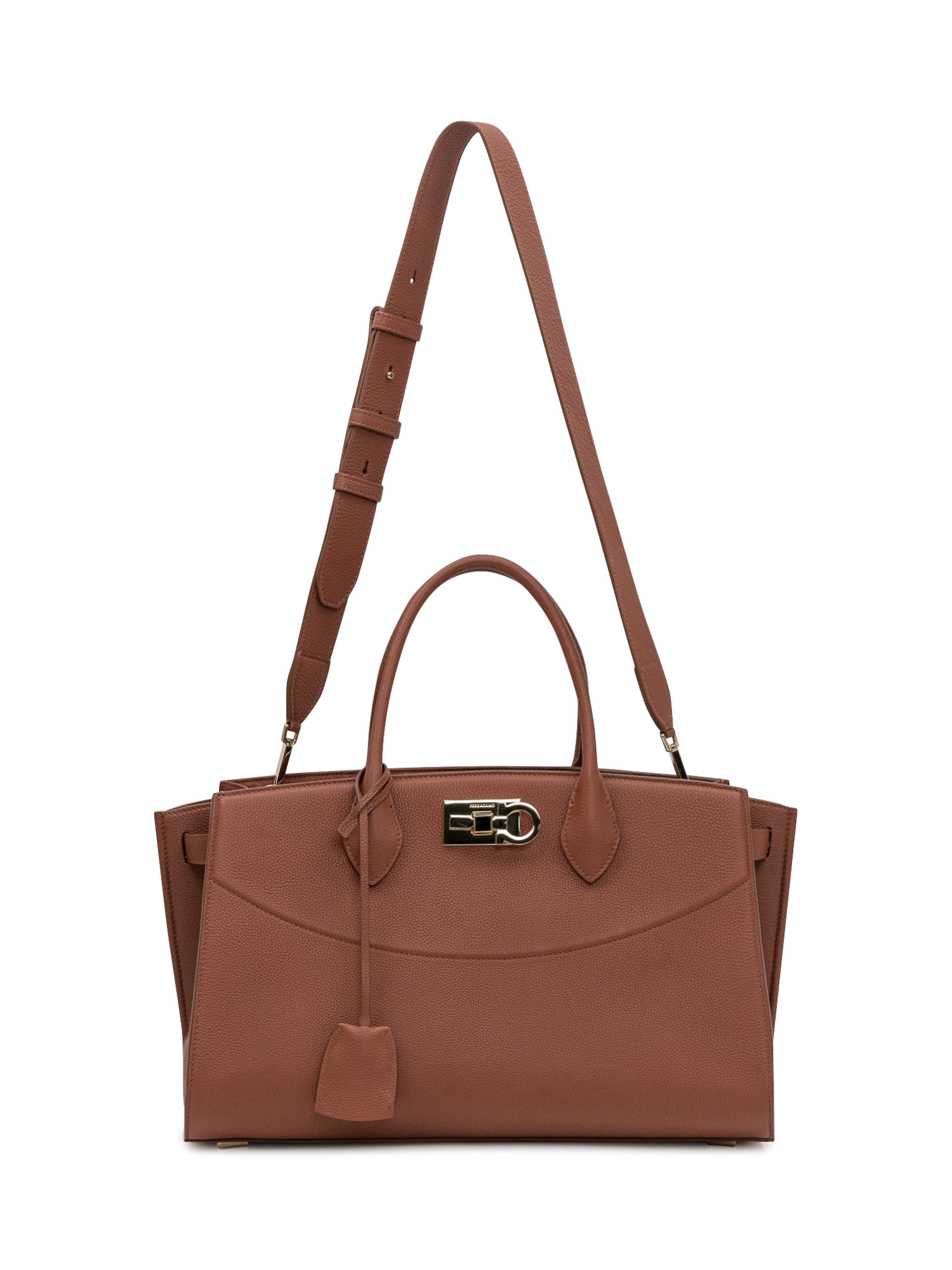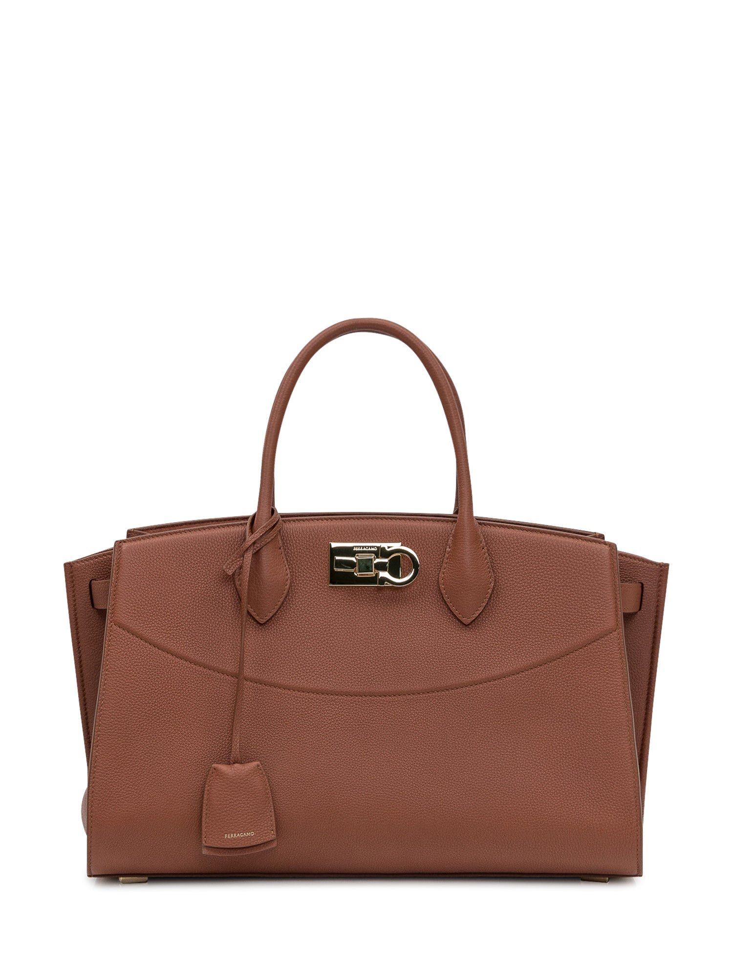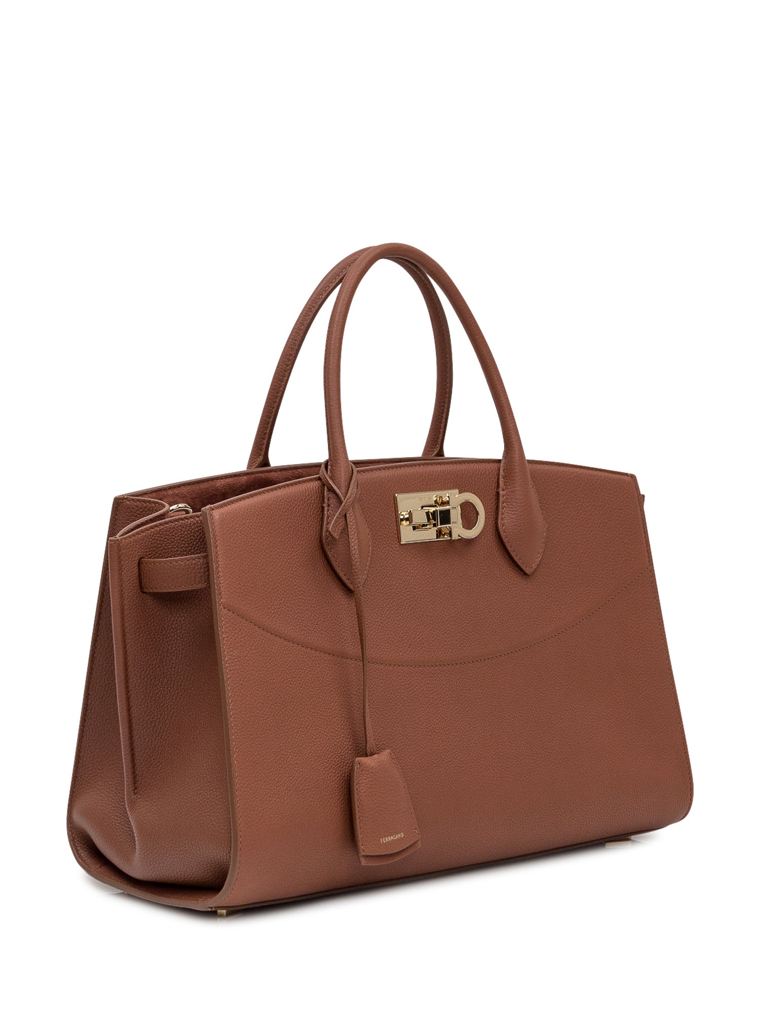 Ferragamo handbag in tan hammered leather. Featuring a metal clasp and structured double handles, it stands out for its elegant design and gold-tone details.