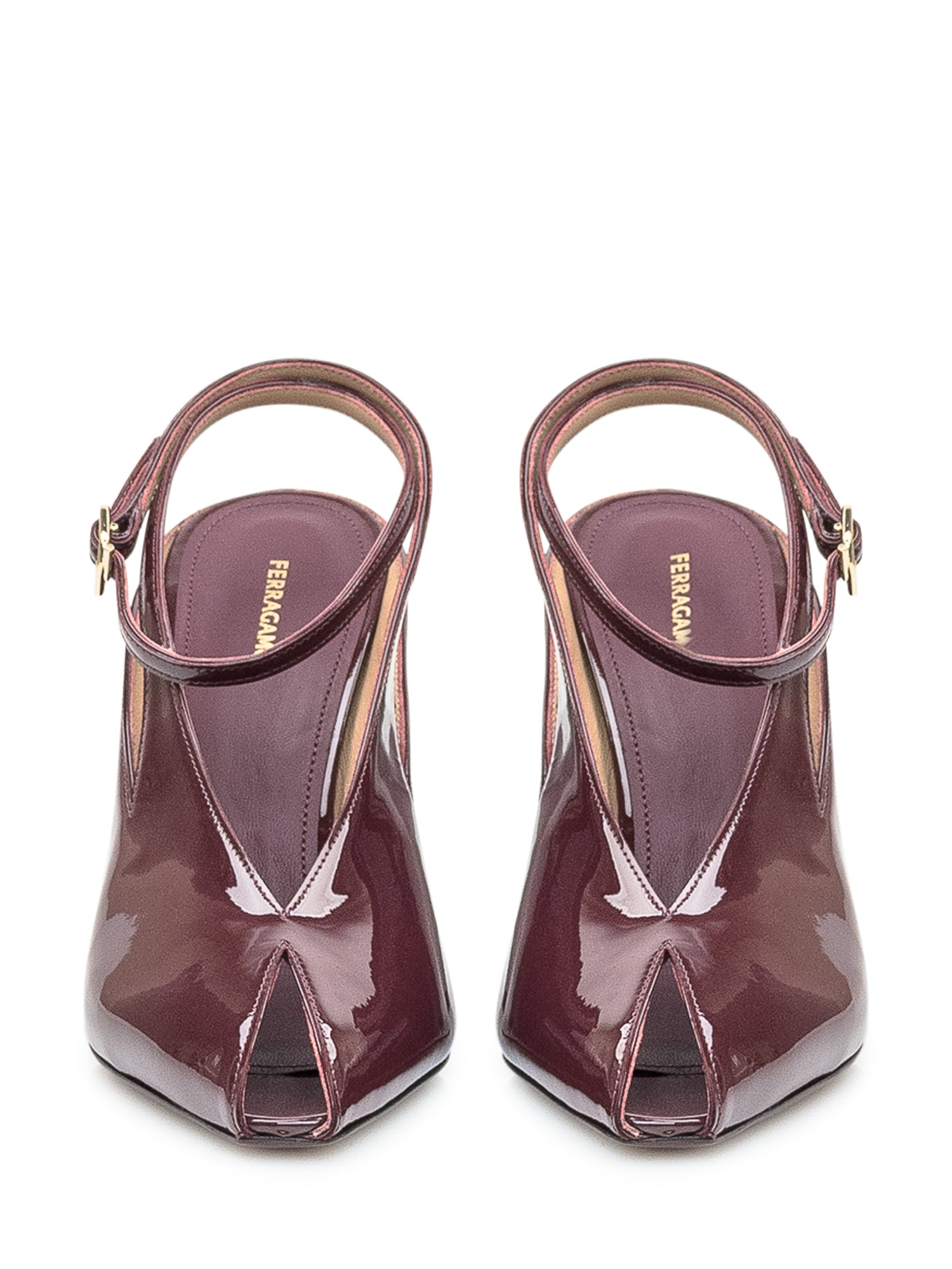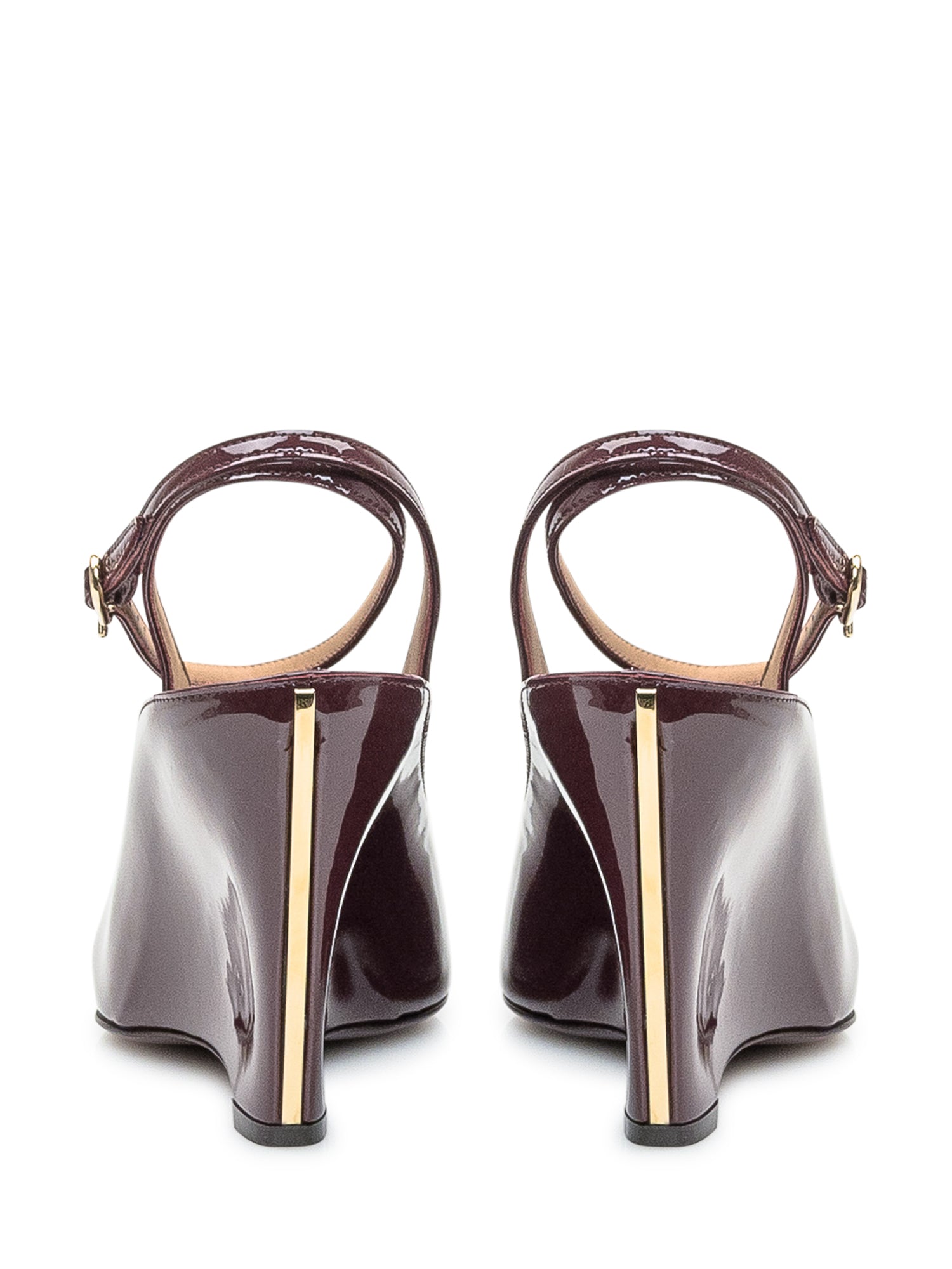 Ferragamo Arcadia 95 patent leather wedge shoes in burgundy with sculptural heel and adjustable ankle strap.