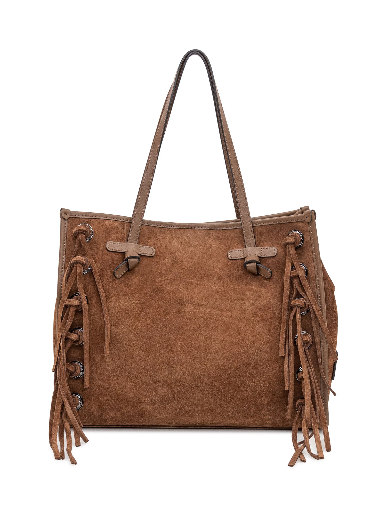 Gianni Chiarini Marcella shopper in brown suede with side fringes and metal eyelets.
