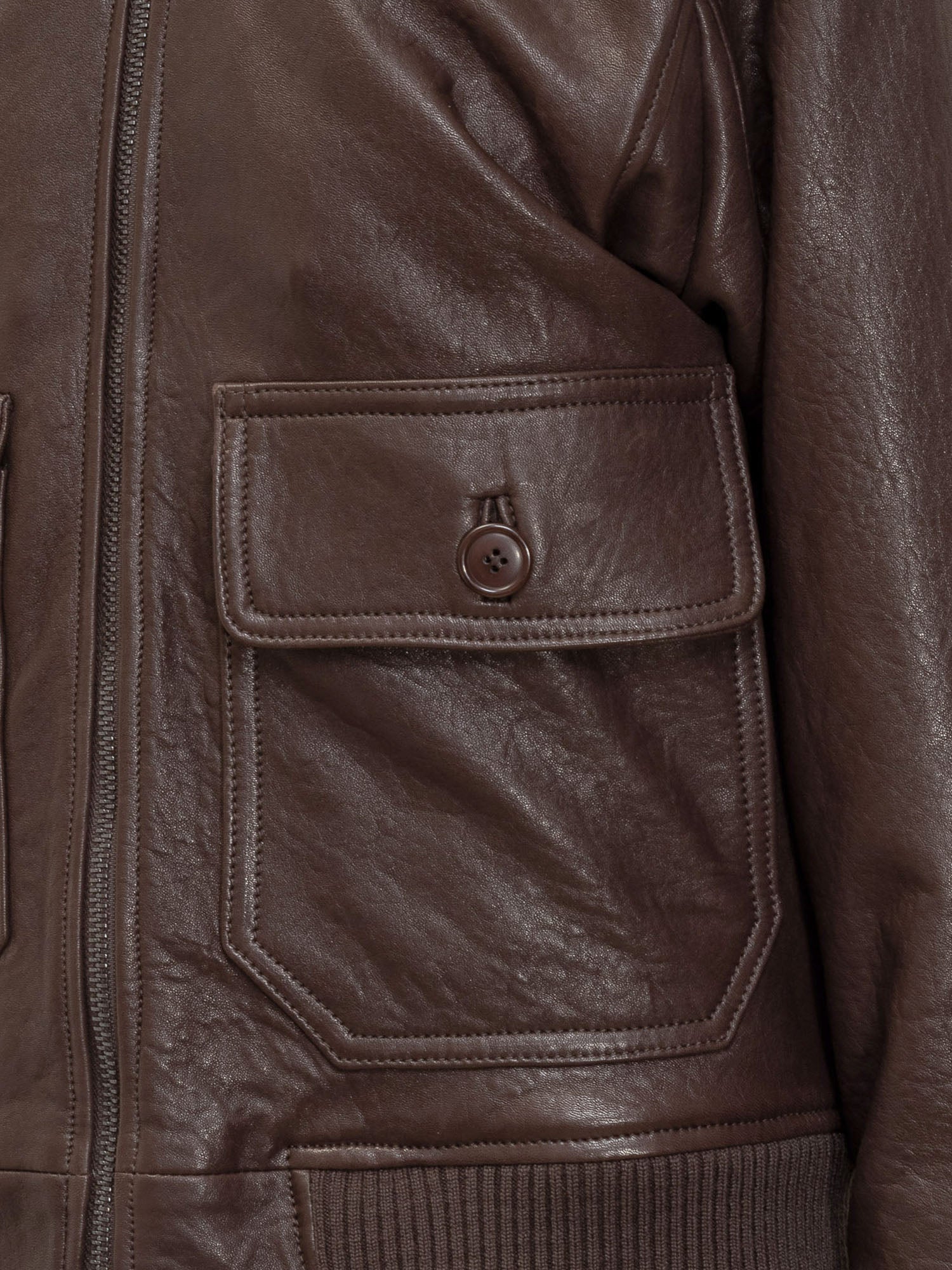 Giocasta brown leather jacket with shearling collar, patch pockets and front zip.