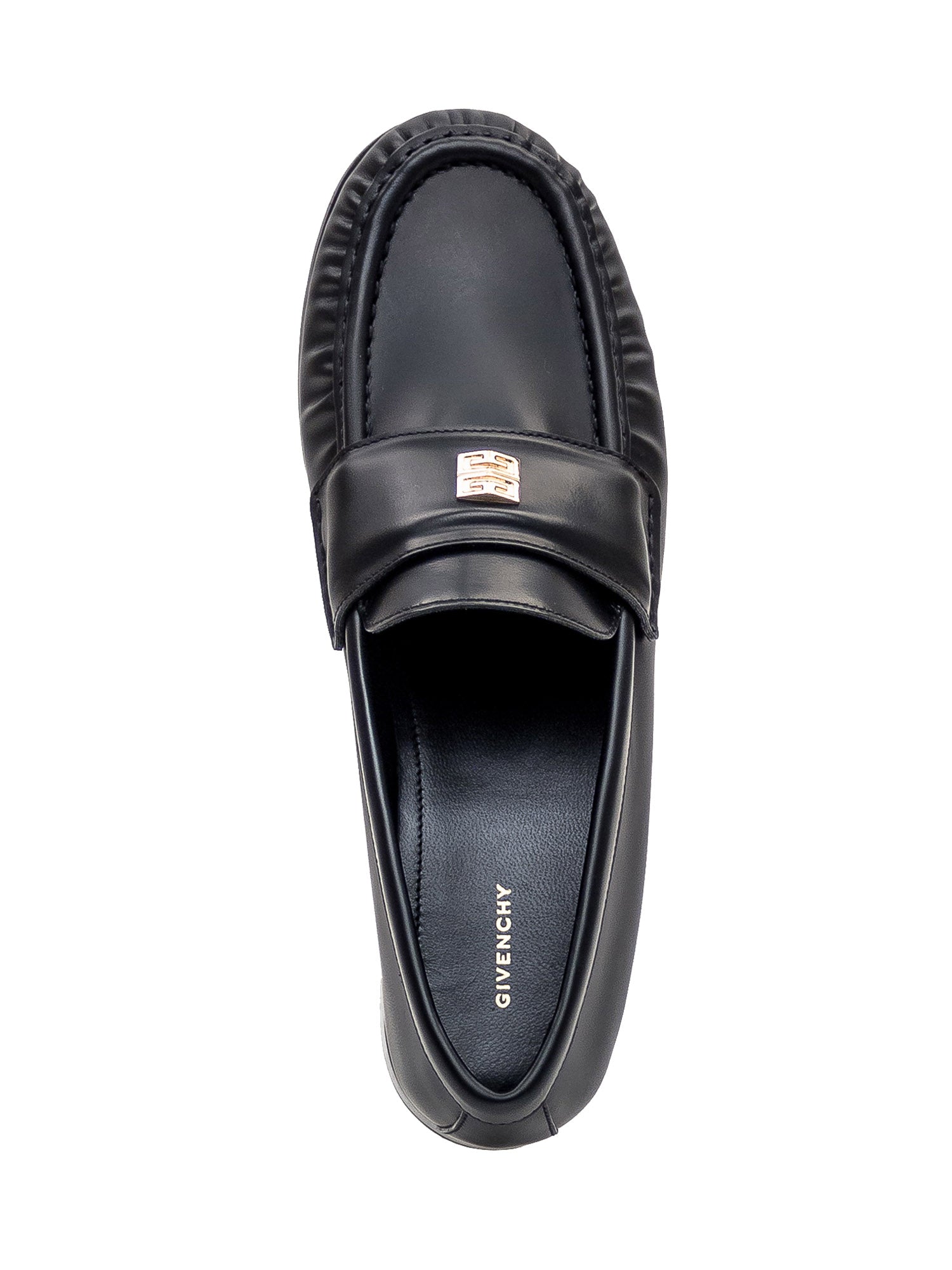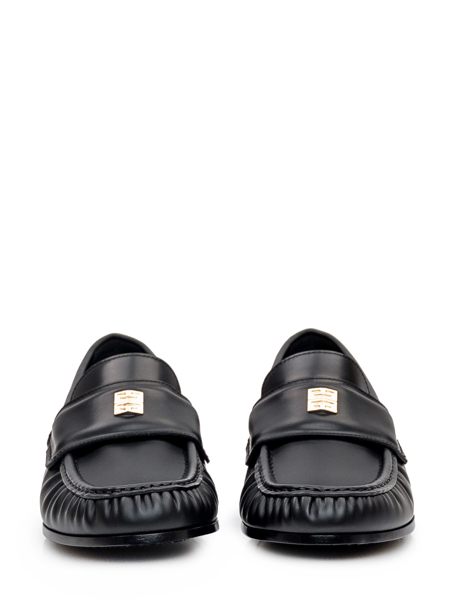 Black leather loafer. Slip-on. Low heel. Leather mask with golden 4G logo.