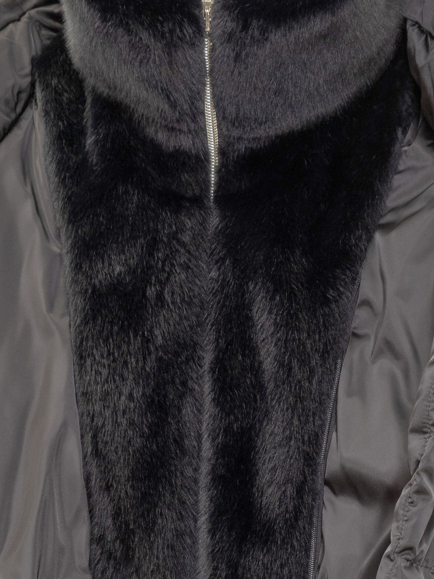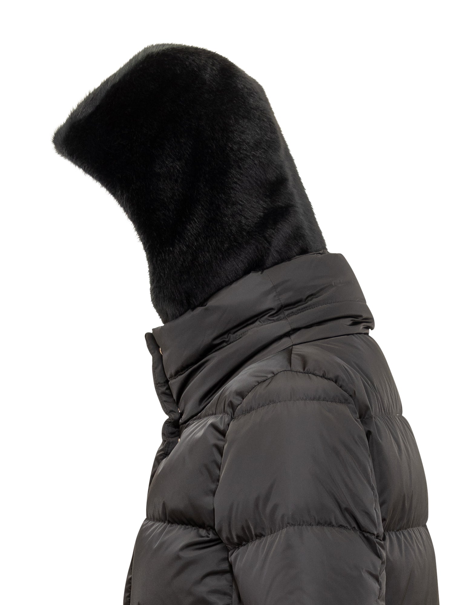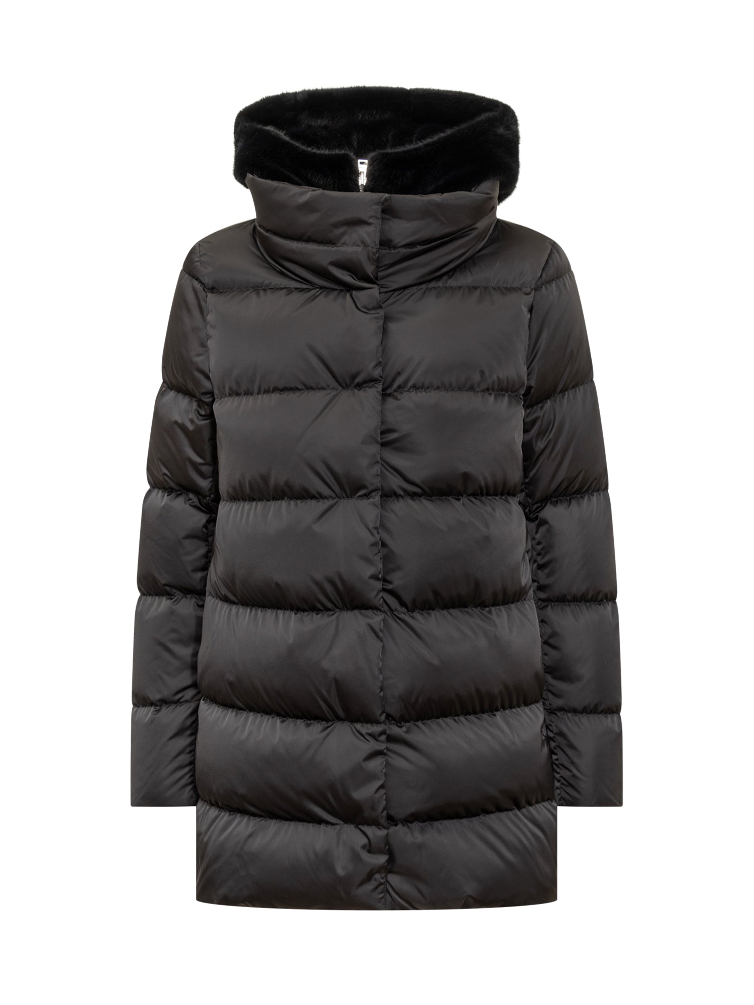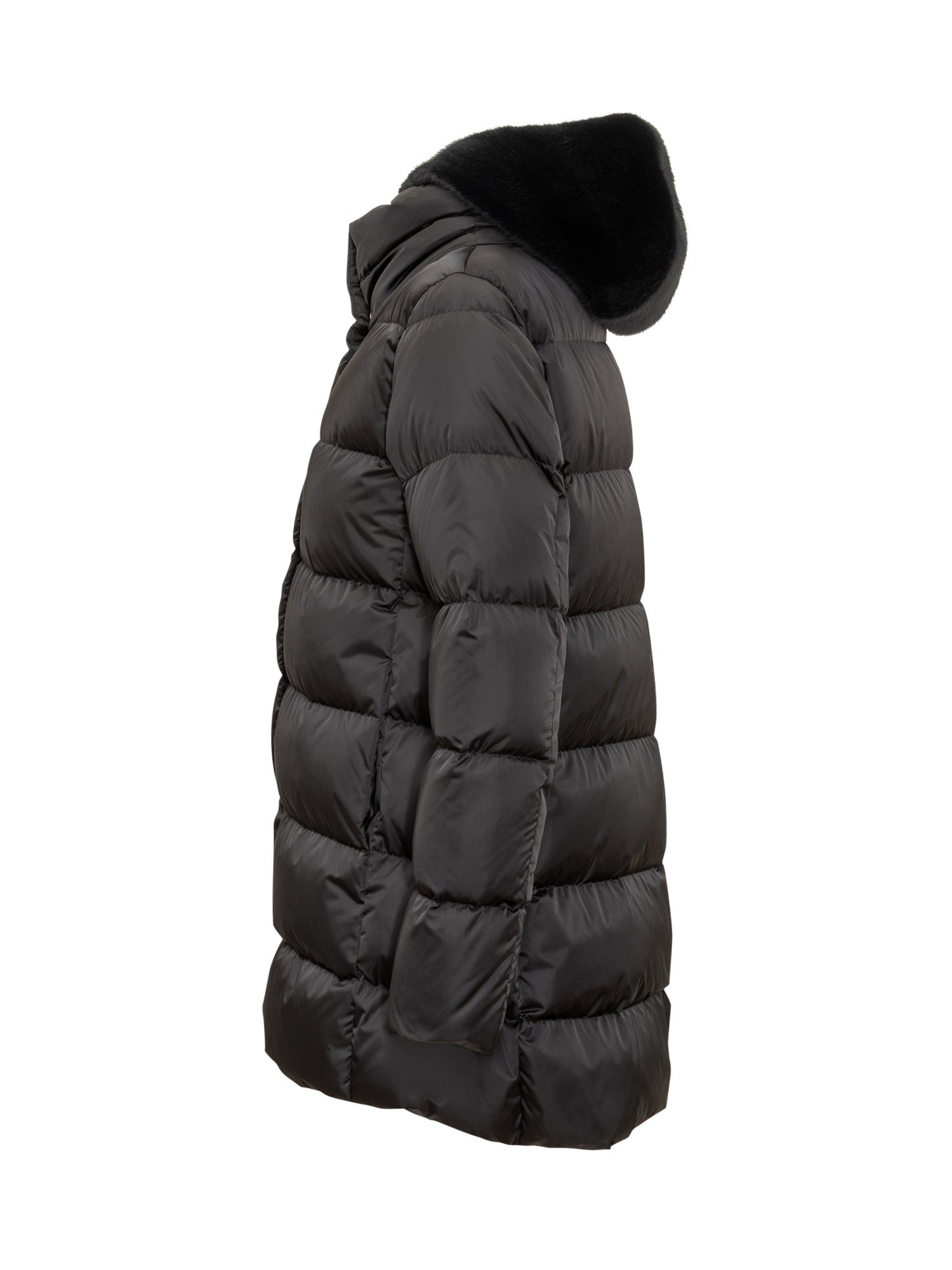 Herno women's long matte black down coat with removable faux fur collar. Warm padding and elegant cut. Hidden zip closure and relaxed fit.