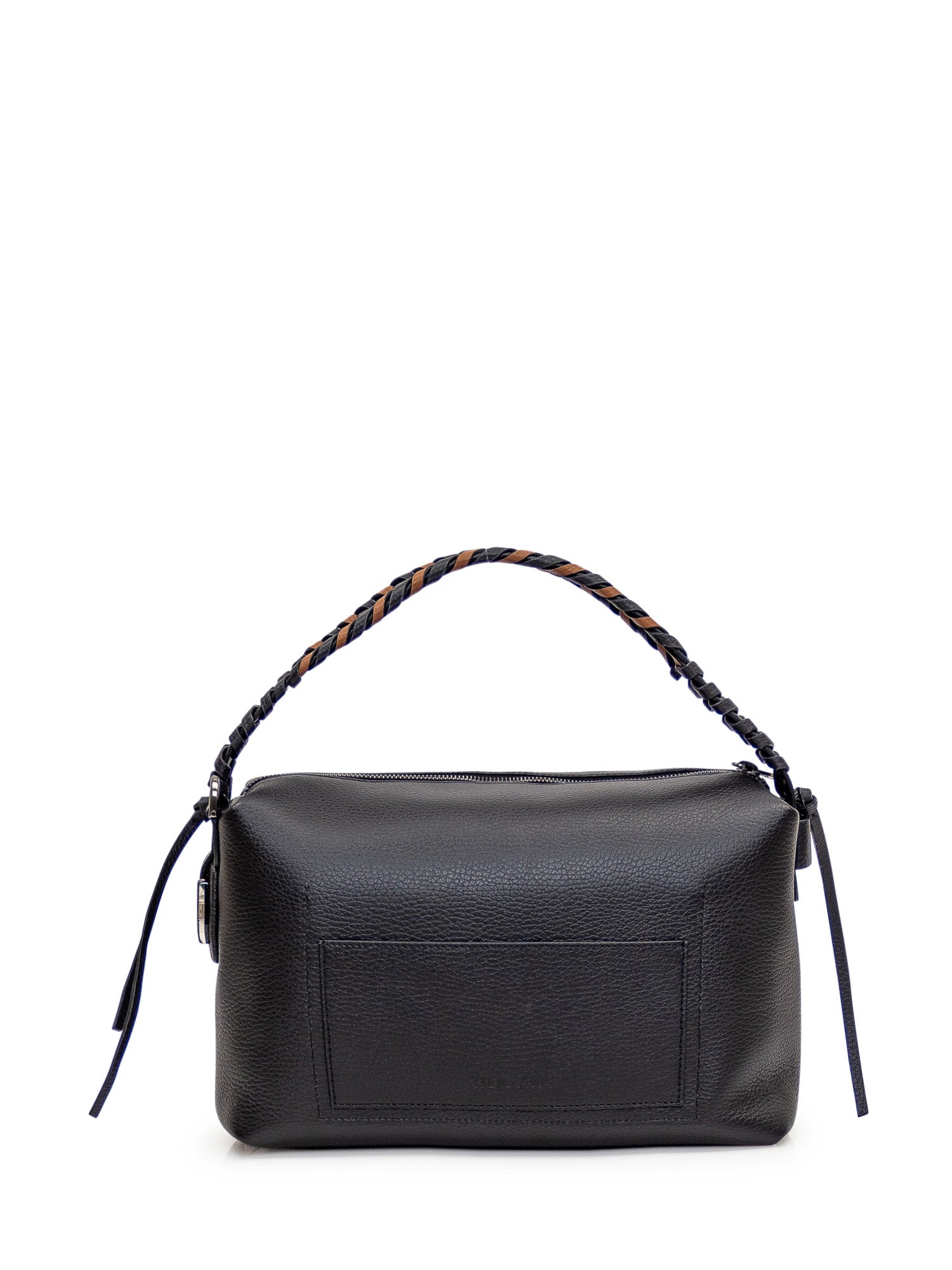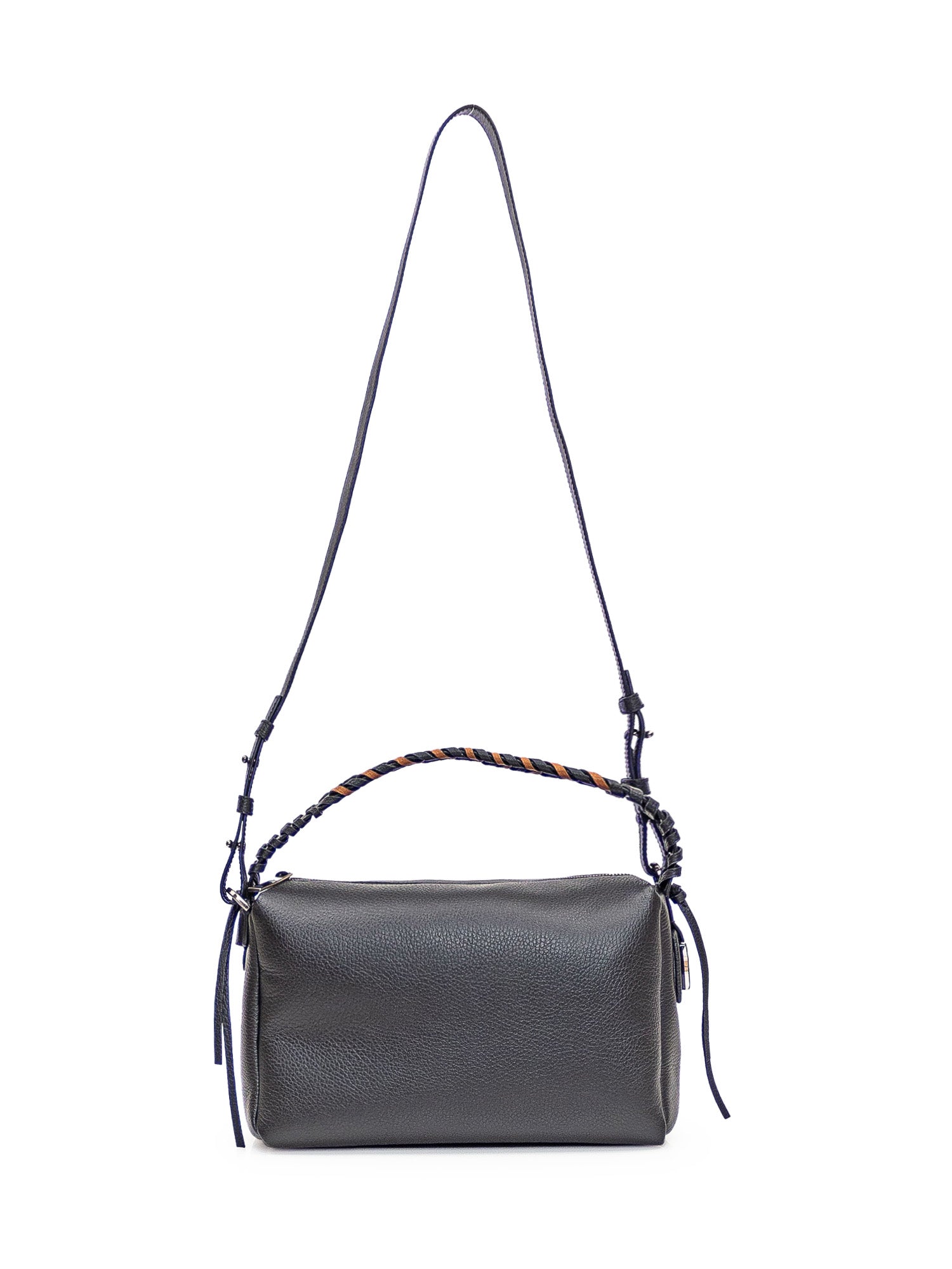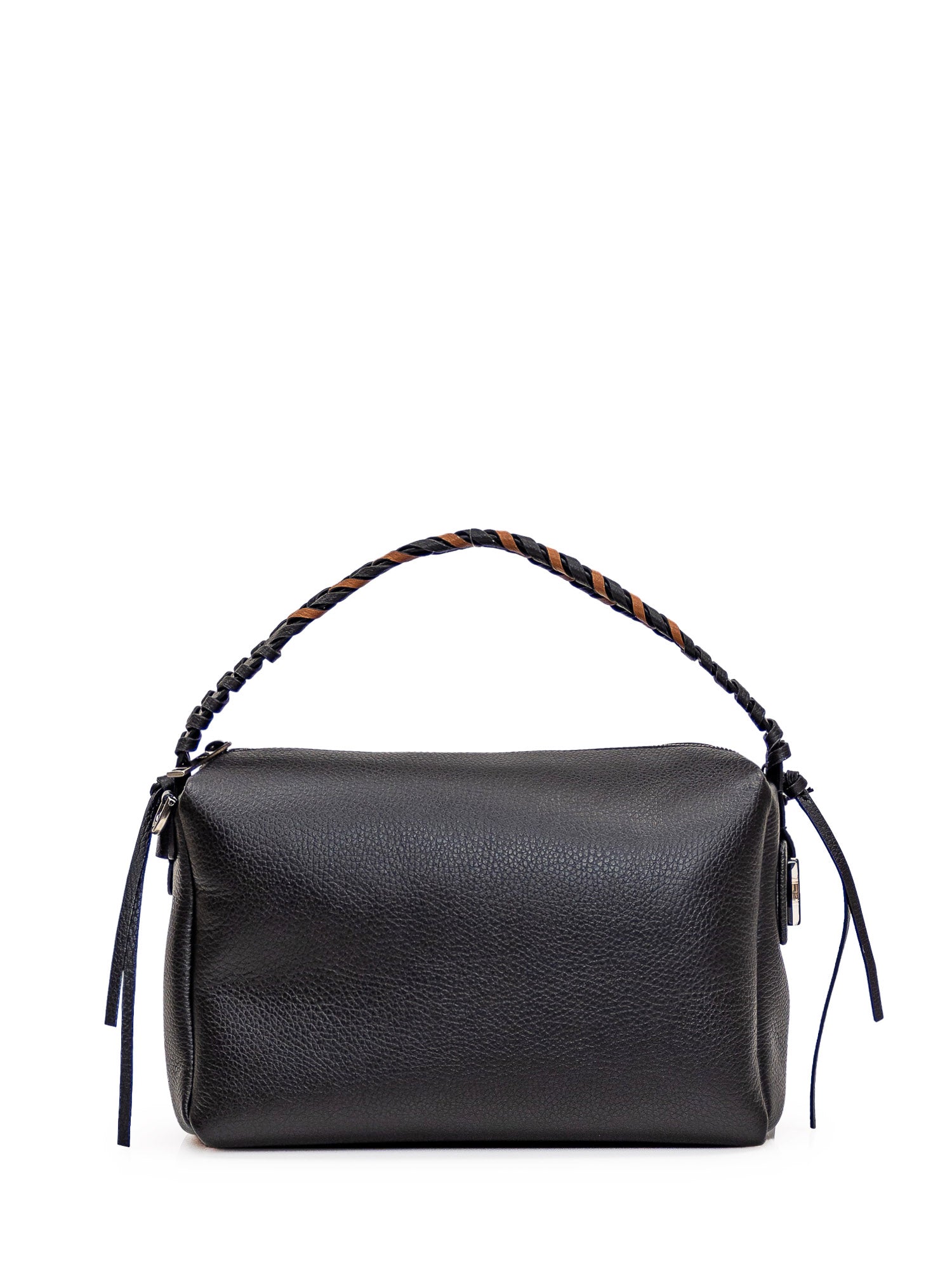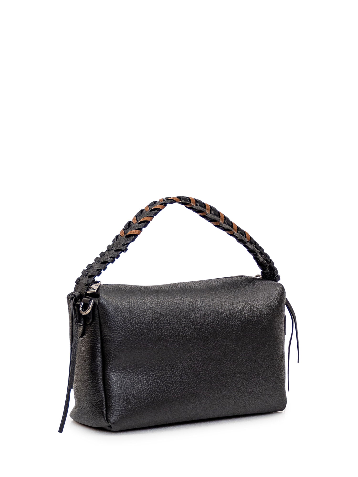Black grained leather Camera Bag. 1 handle. Adjustable and removable leather shoulder strap. Two interior flat pockets. Zipper closure. Flat pocket on back. Monogram H on the side.