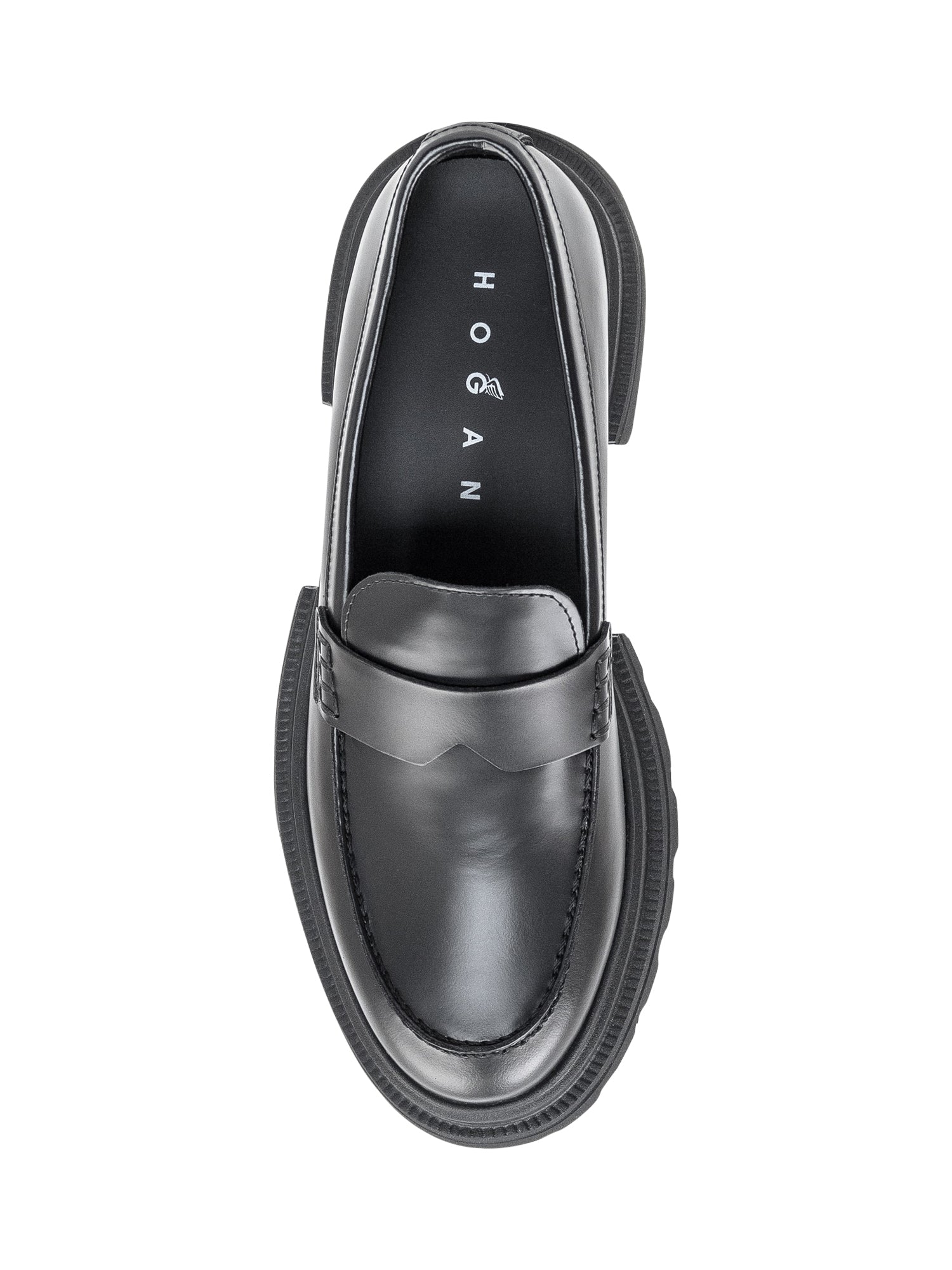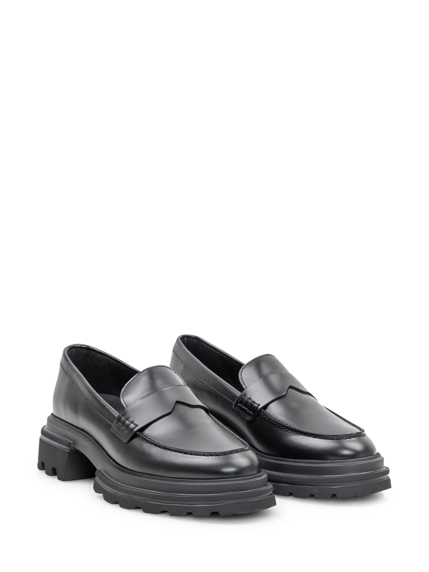 Black loafer. Semi-gloss finish with sleeper. Raised tank sole.
