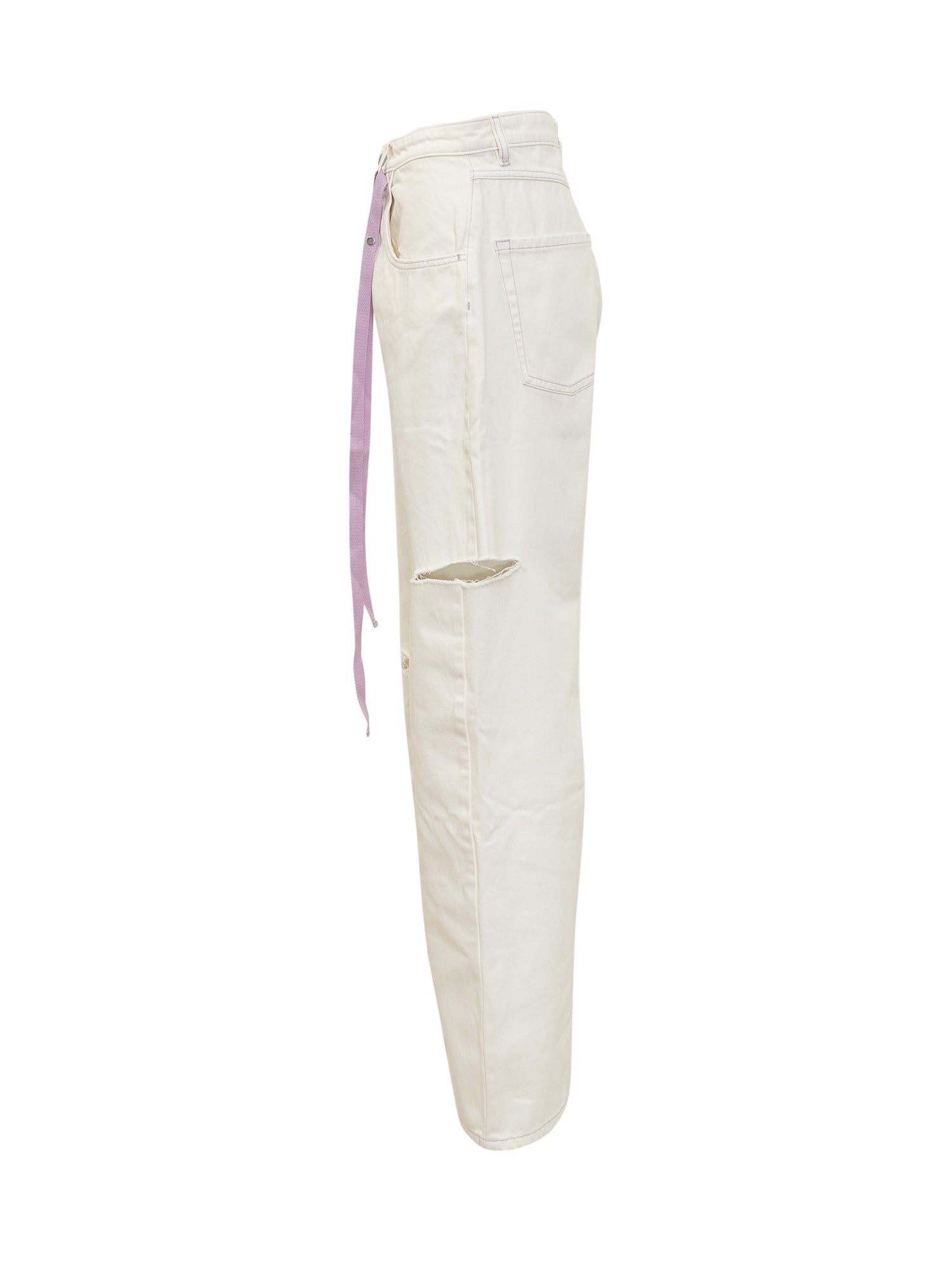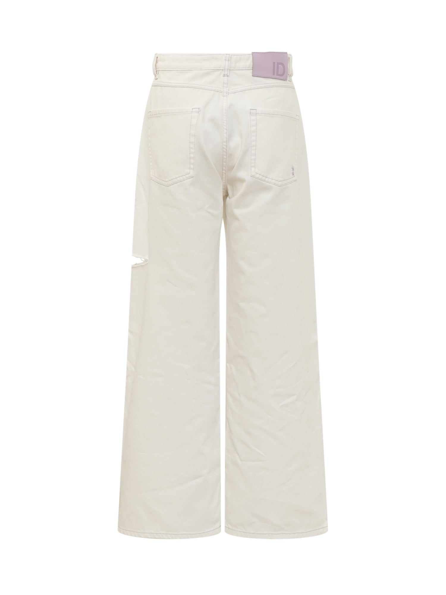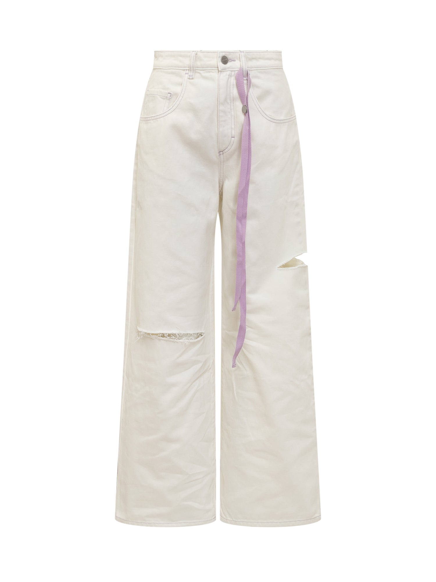 Wide leg long jeans. Button and zipper closure. Belt loops. Five pockets. Cut-outs at front. Ribbon inserted at front.