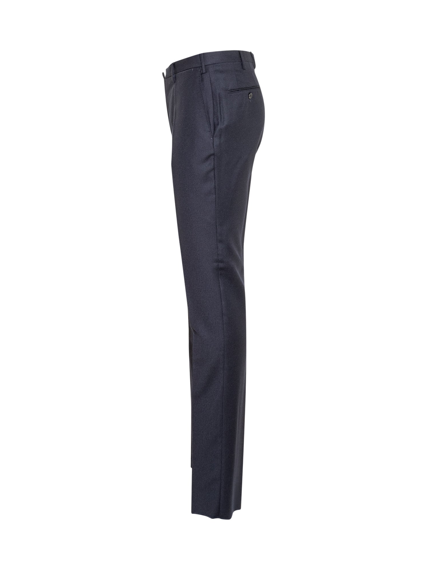 Long trousers. Zip and button closure. Belt loops. Four pockets.