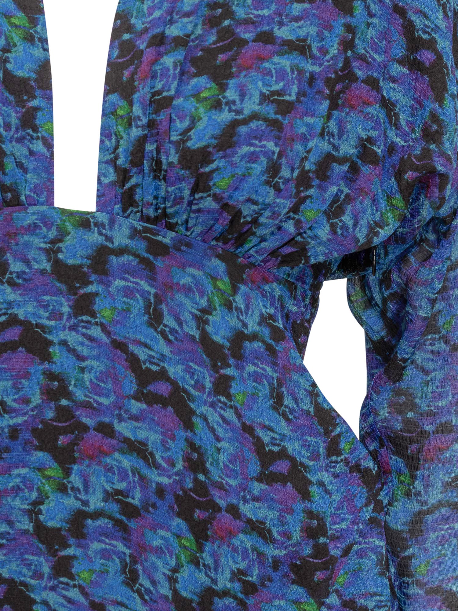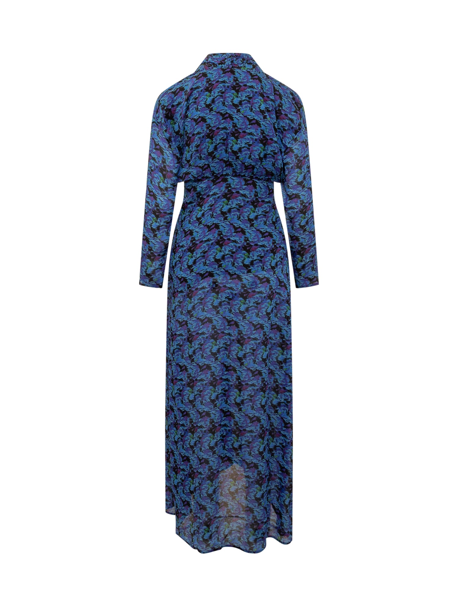 Long-sleeved long dress in viscose-silk blend. Deep V-neckline. Side zipper closure. Asymmetrical hemline.