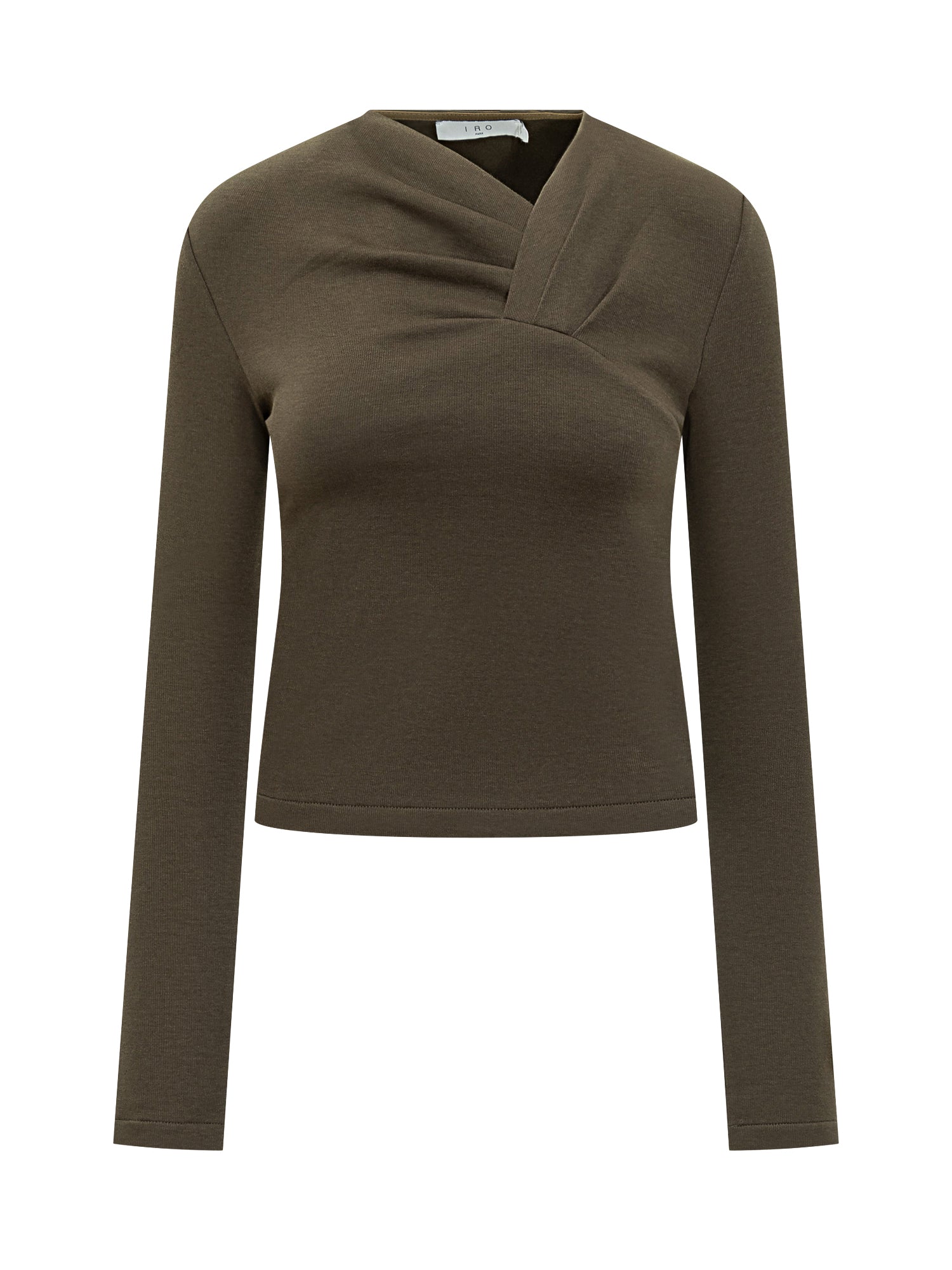 Iro khaki stretch jersey top with crossover neckline and refined pleats.
