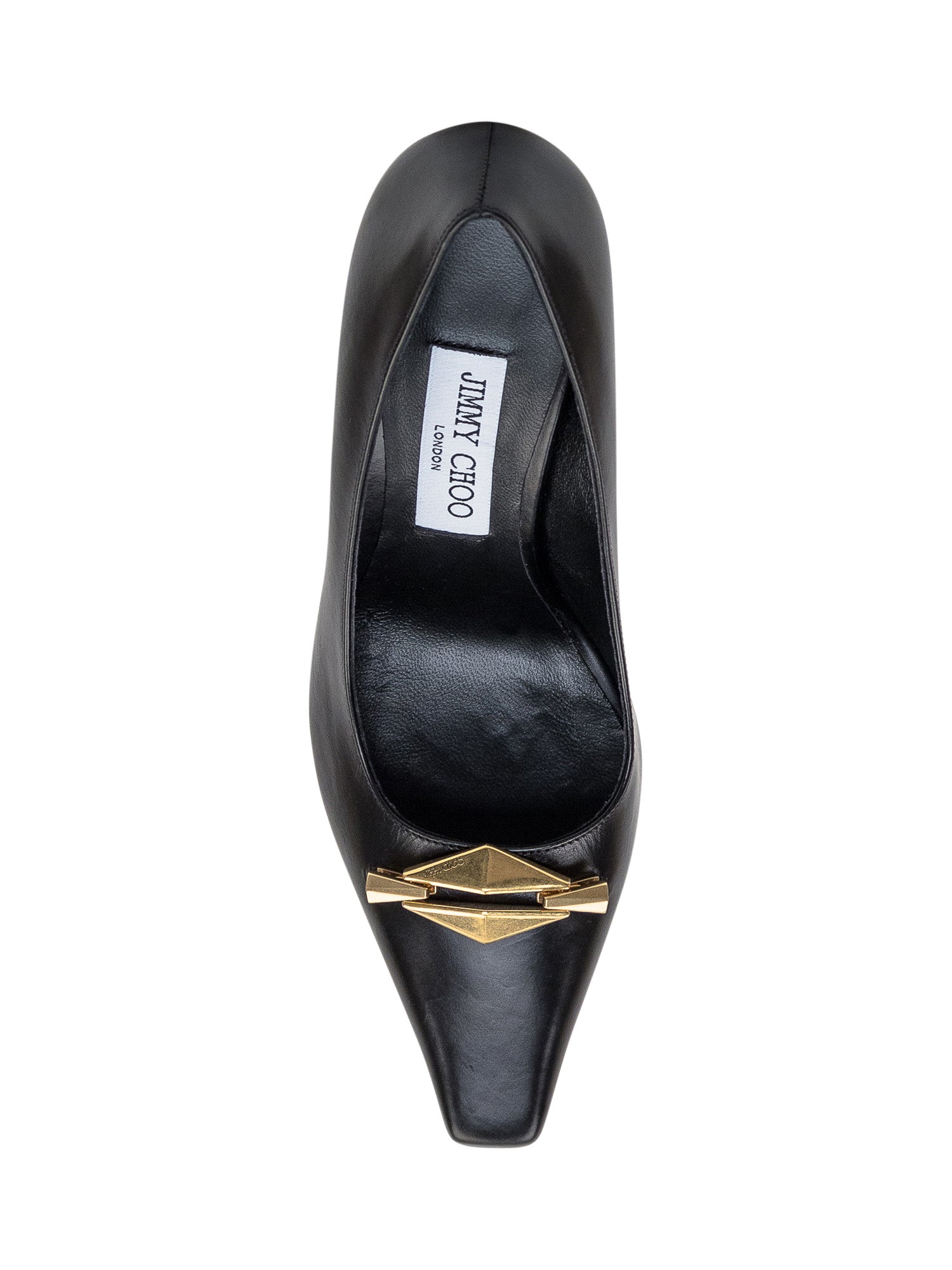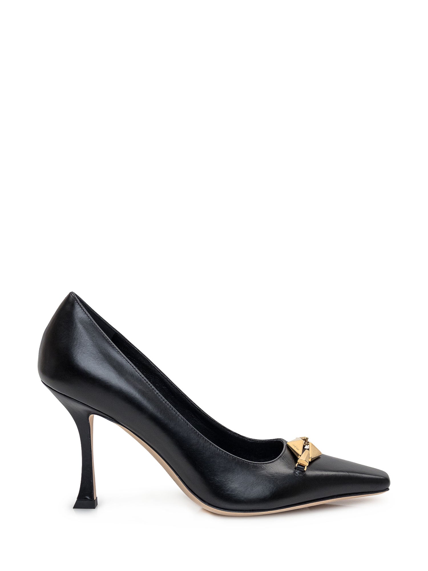 Black Décolleté. Square toe. Metal logo detail on toe. Stiletto heel.