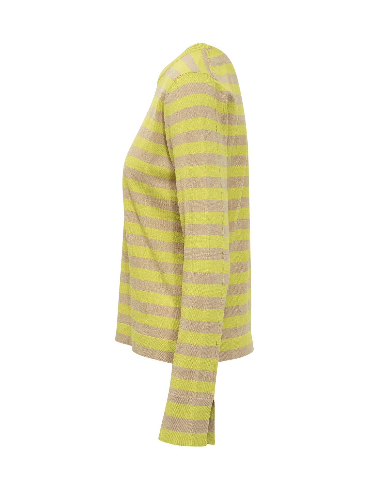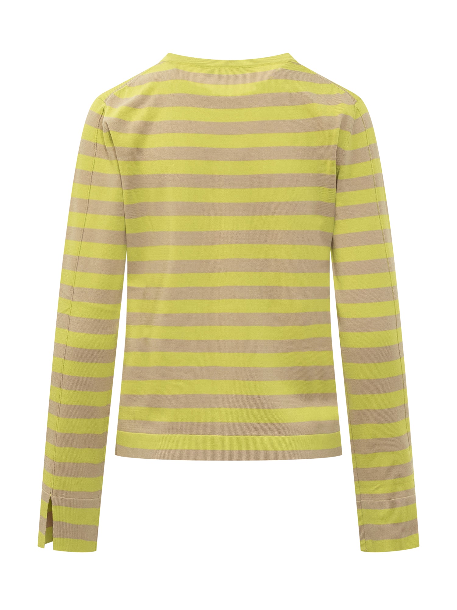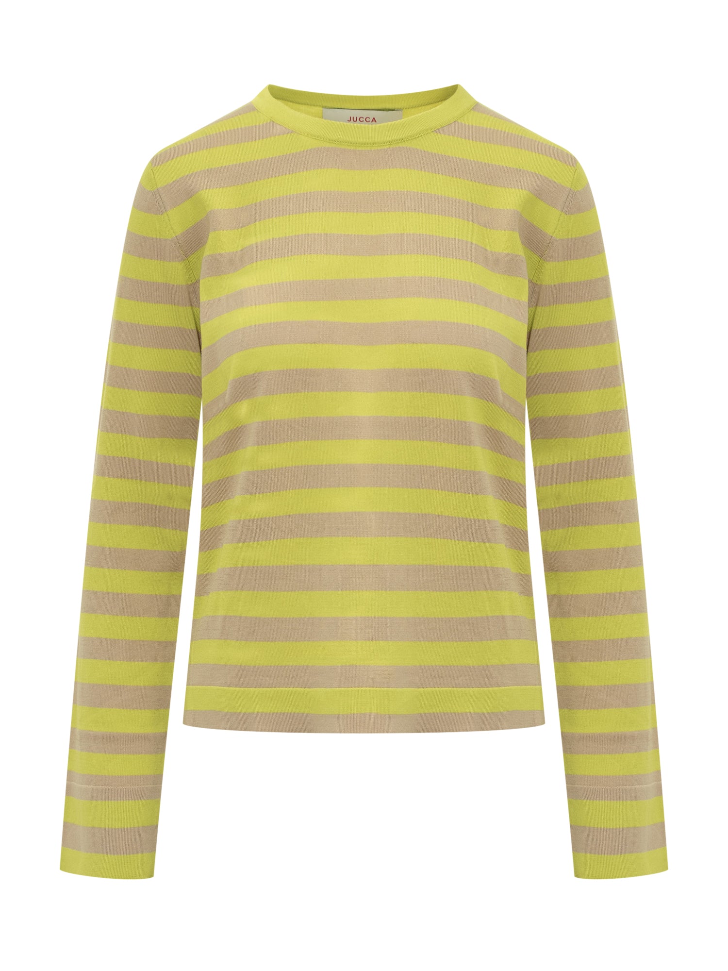 Long-sleeved cotton sweater. Crew neck. Ribbed hems. Slits at wrists. All-over horizontal striped pattern.