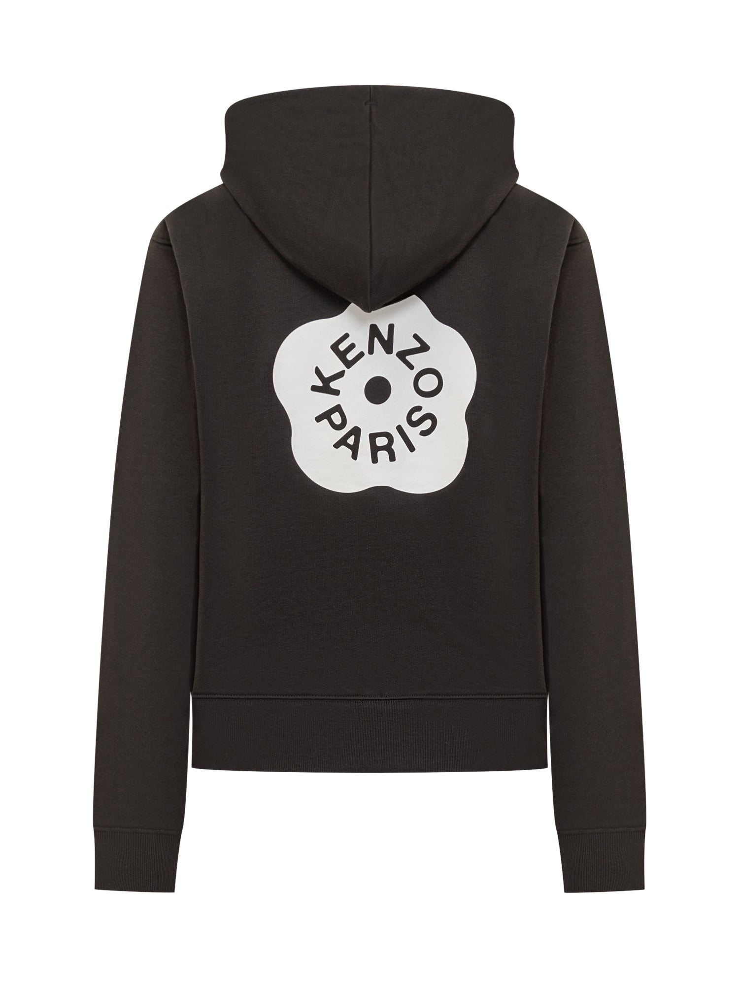 Black Kenzo cotton hoodie with adjustable drawstring and floral logo charm.