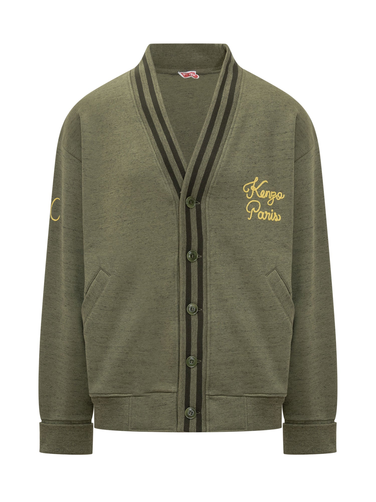 Kenzo green cotton cardigan with front buttons, contrast stripes and Kenzo Paris chest embroidery.